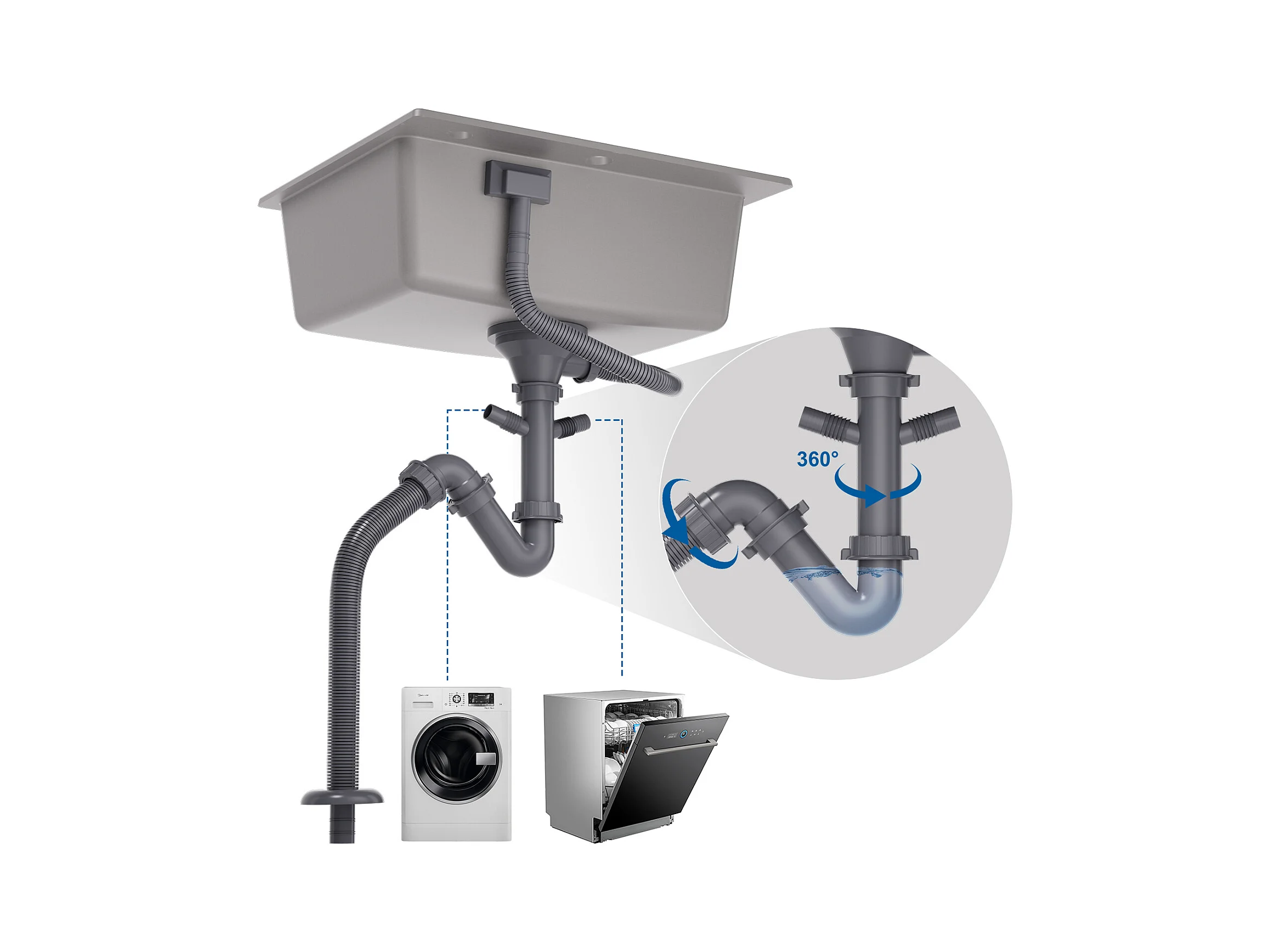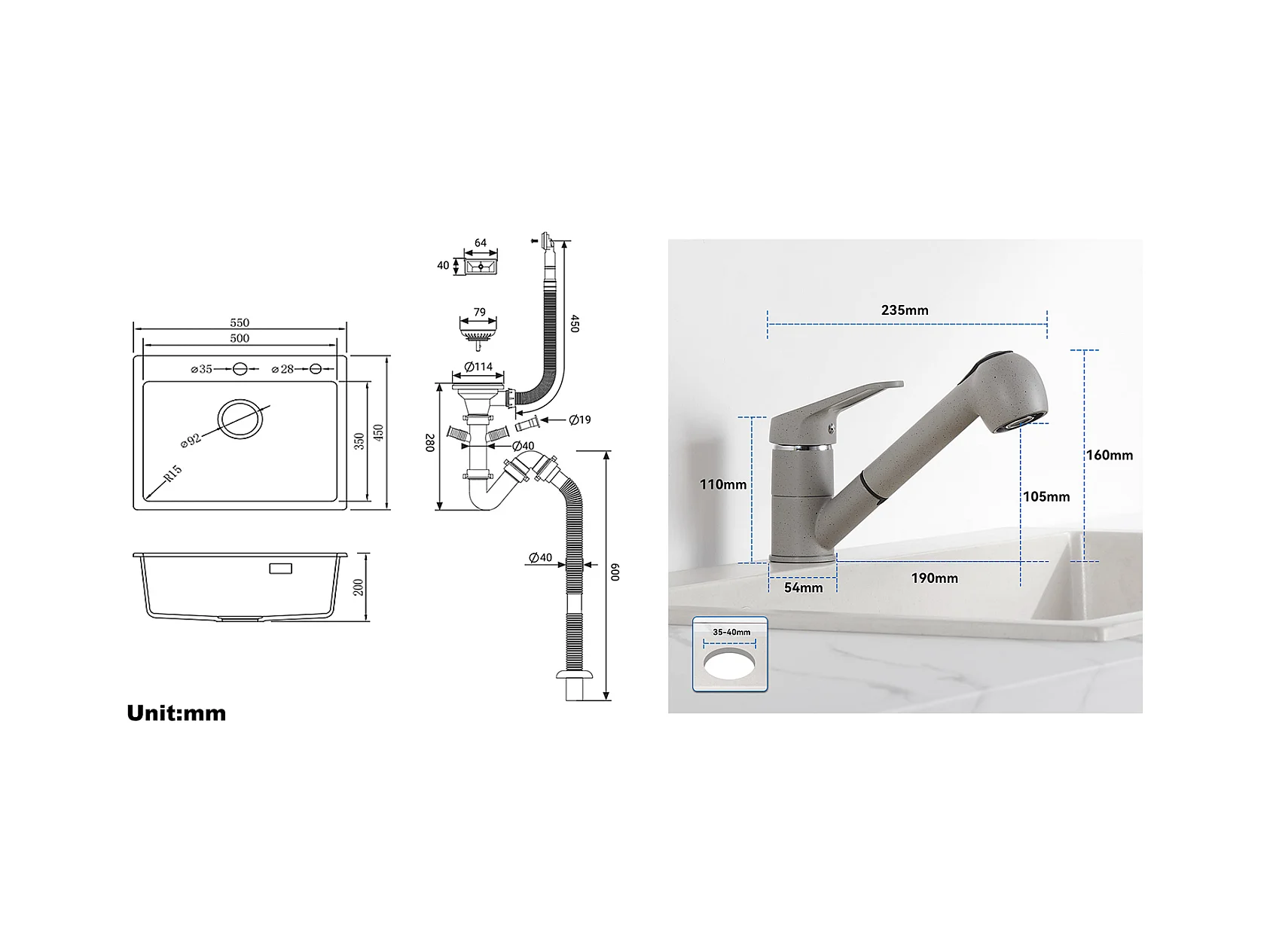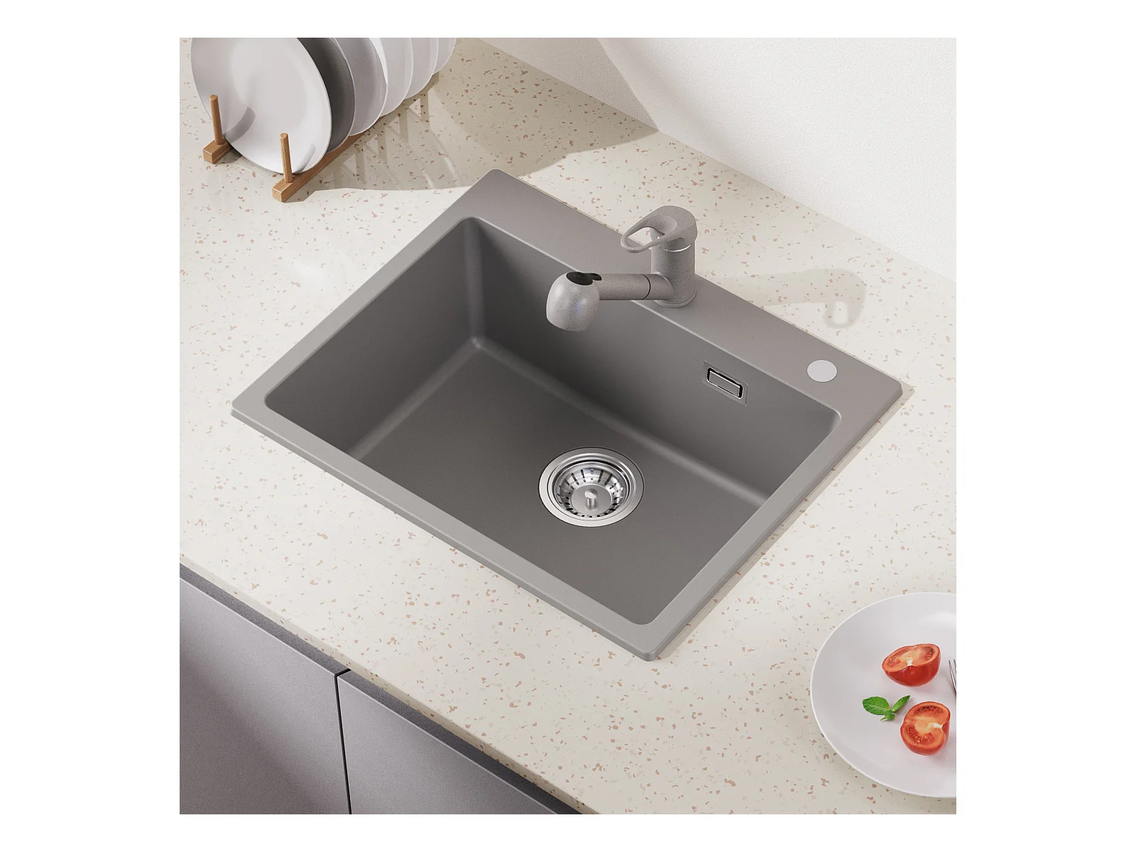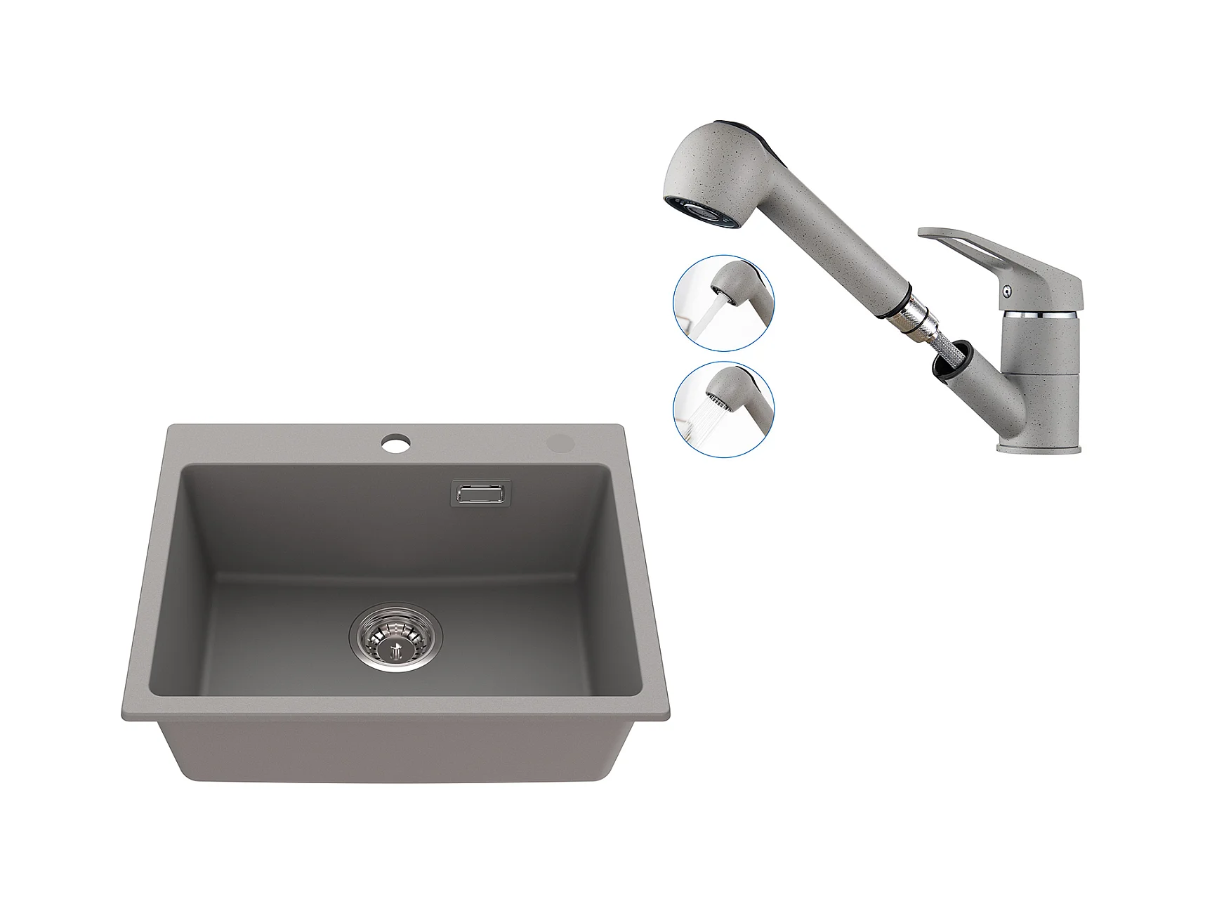1 Granieten gootsteen, 55*45*20cm, afvoerset, grijs + keukenkraan met uittrekbare douche 2 stralen, koud/warm water, grijs