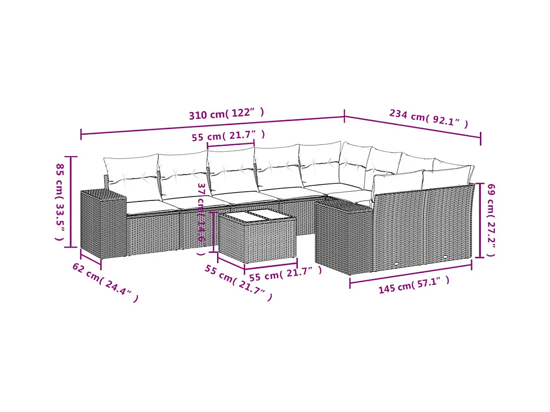 10-delige Loungeset met kussens poly rattan bruin