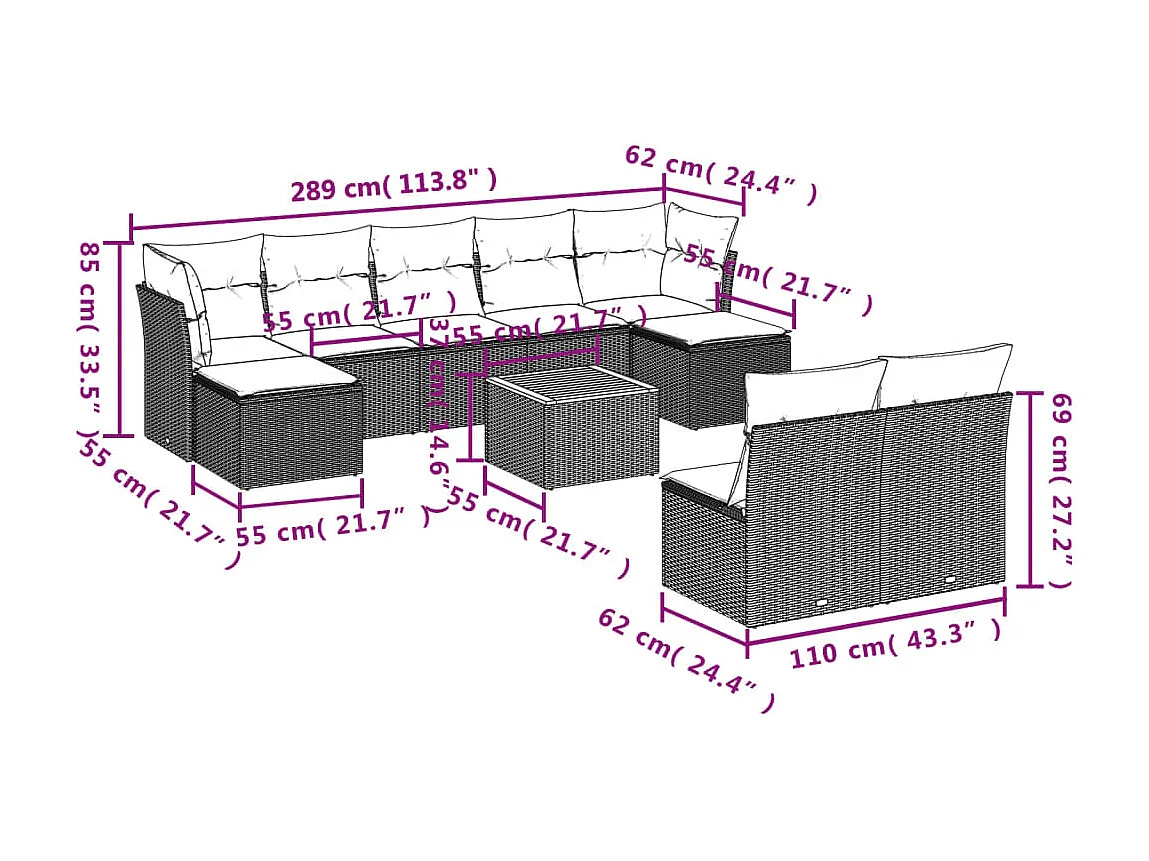 10-delige Loungeset met kussens poly rattan grijs