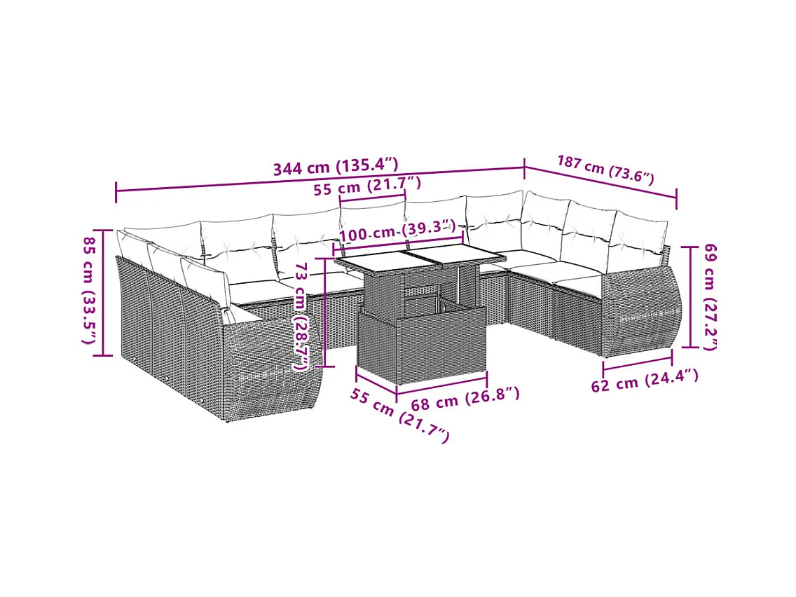 12-delige Loungeset met kussens poly rattan bruin