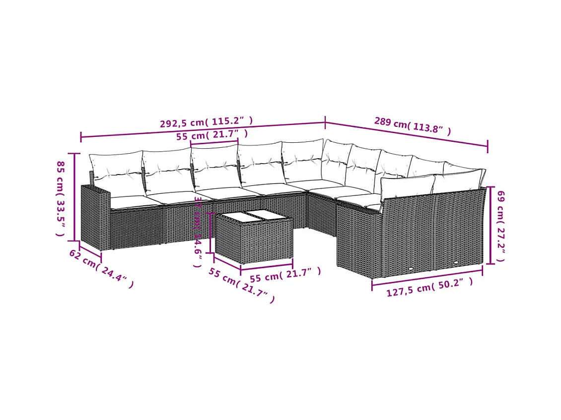 10-delige Loungeset met kussens poly rattan bruin