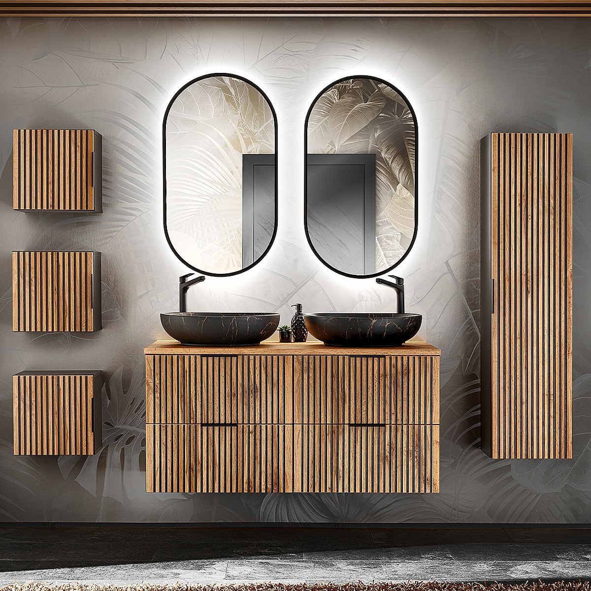 Set van 120cm dubbele inbouwwastafel met LED-spiegels en Gaia hout en zwart badmeubel
