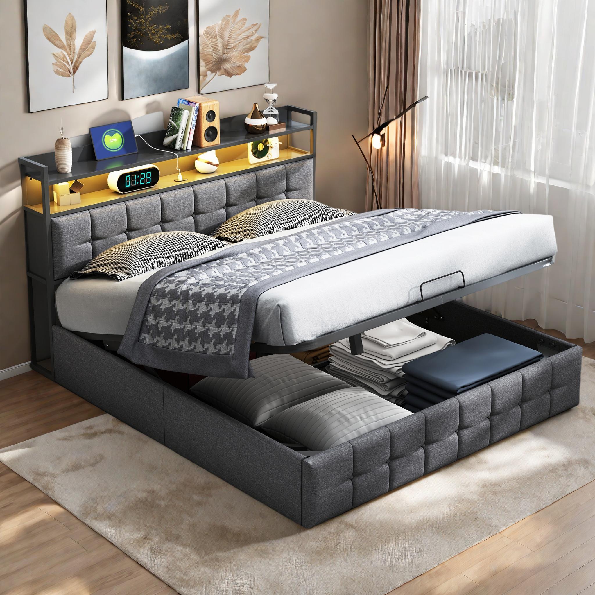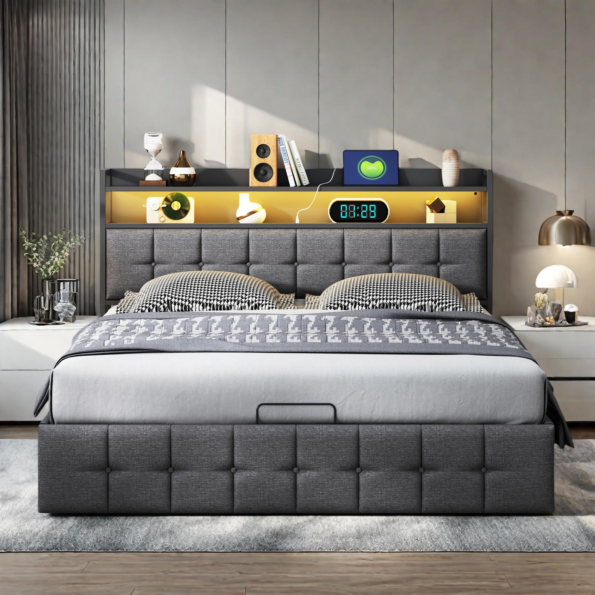 140x190 cm opbergbed in grijs imitatieleer met RGB-leds, hoofdbord met USB/Type-C-aansluitingen en geïntegreerde opbergruimte