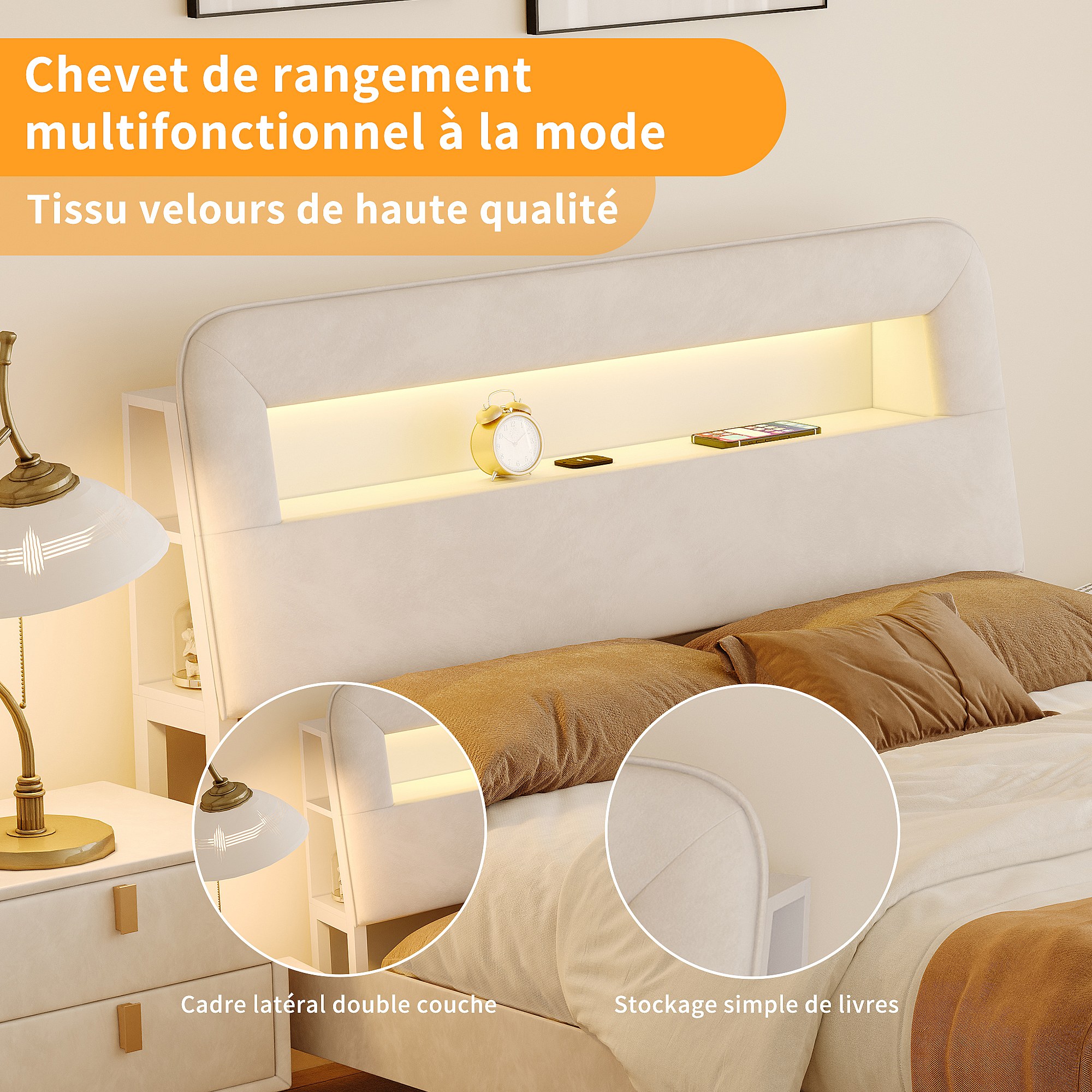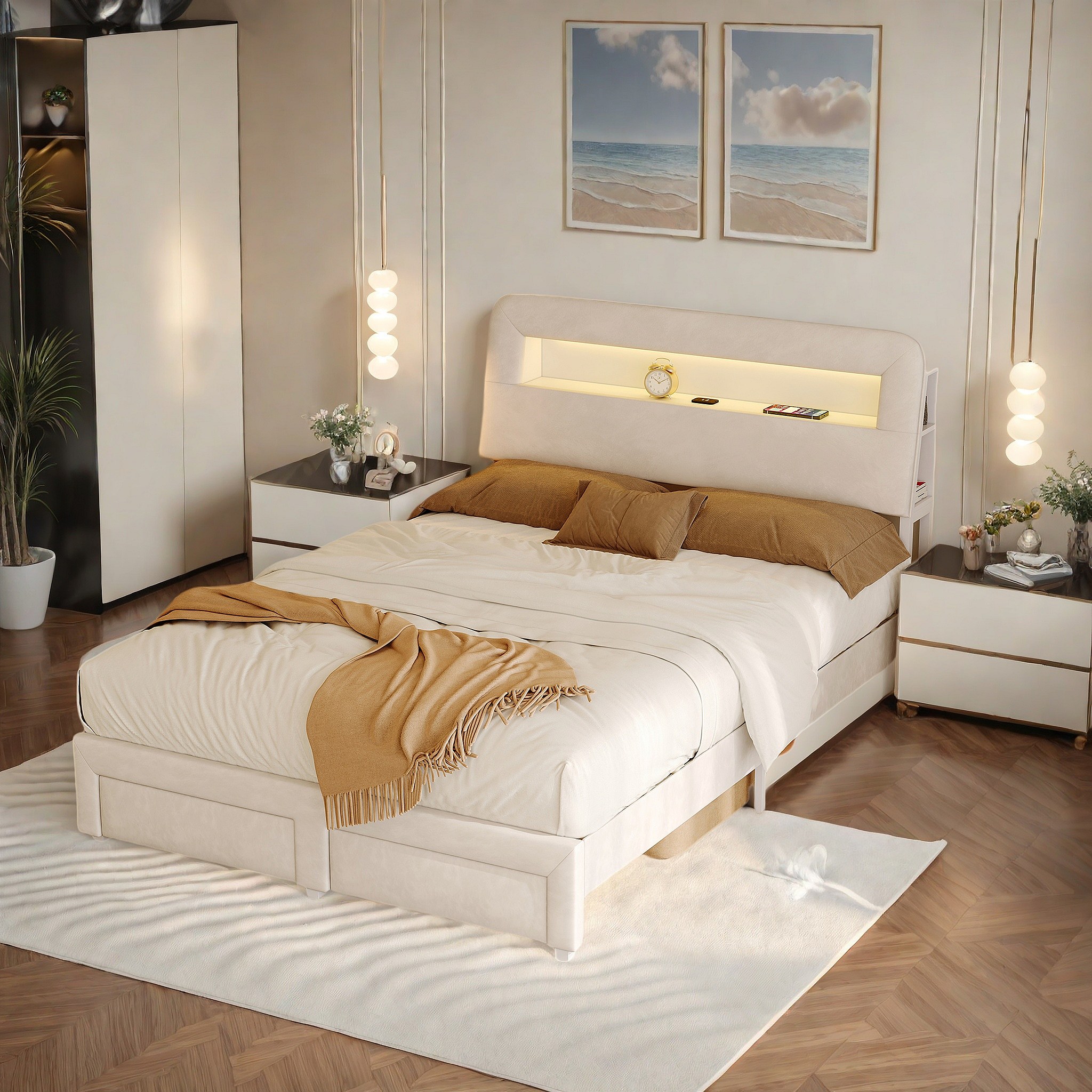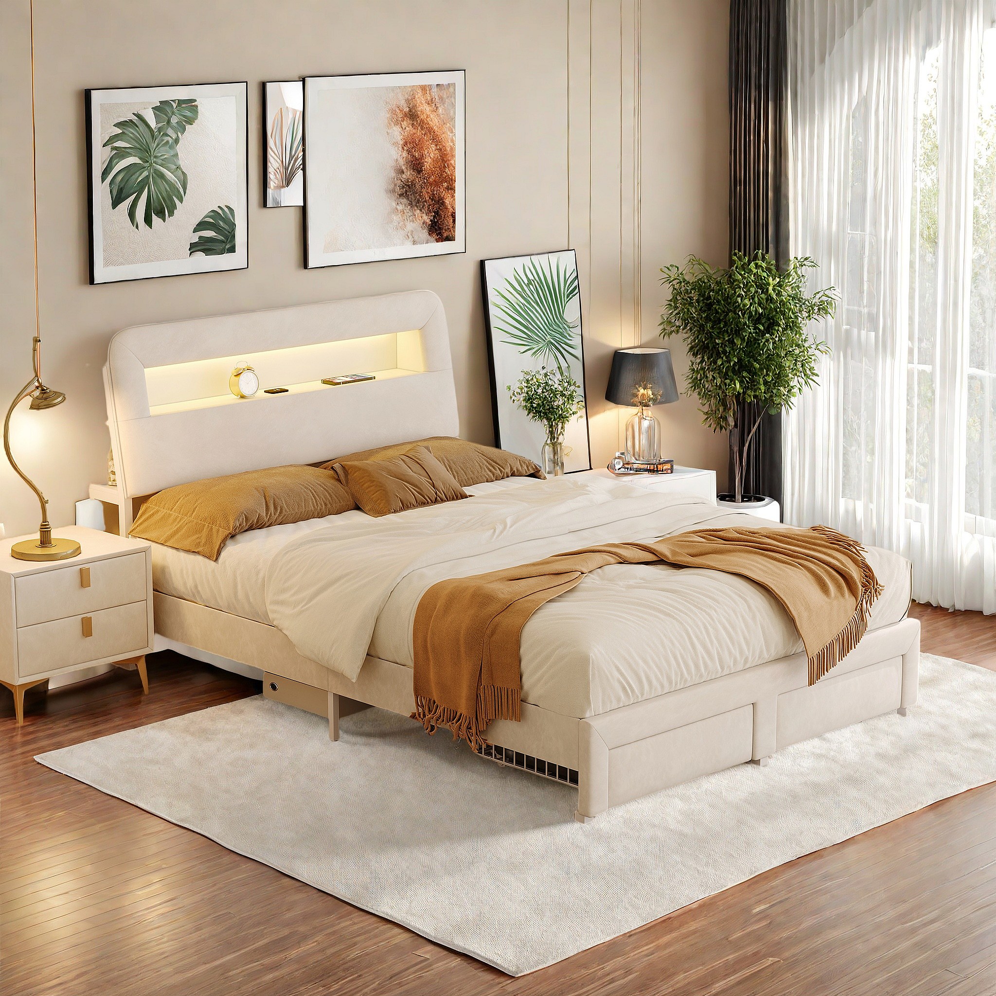 140x200 cm crèmebeige fluwelen bed met lades, opbergruimte hoofdbord en voeteneinde, USB-poort + LED, modieus design