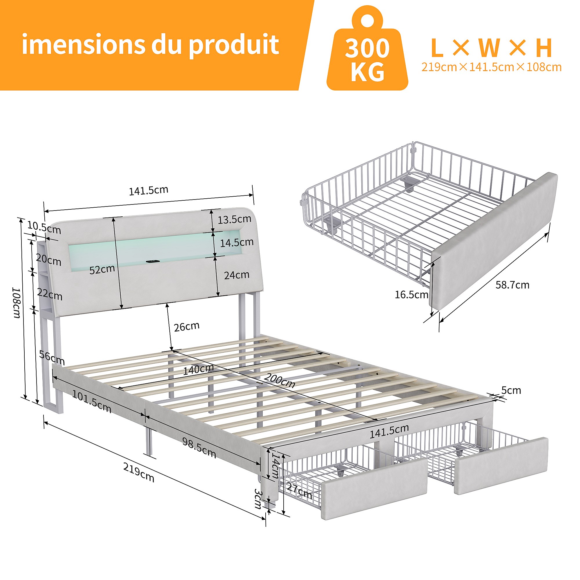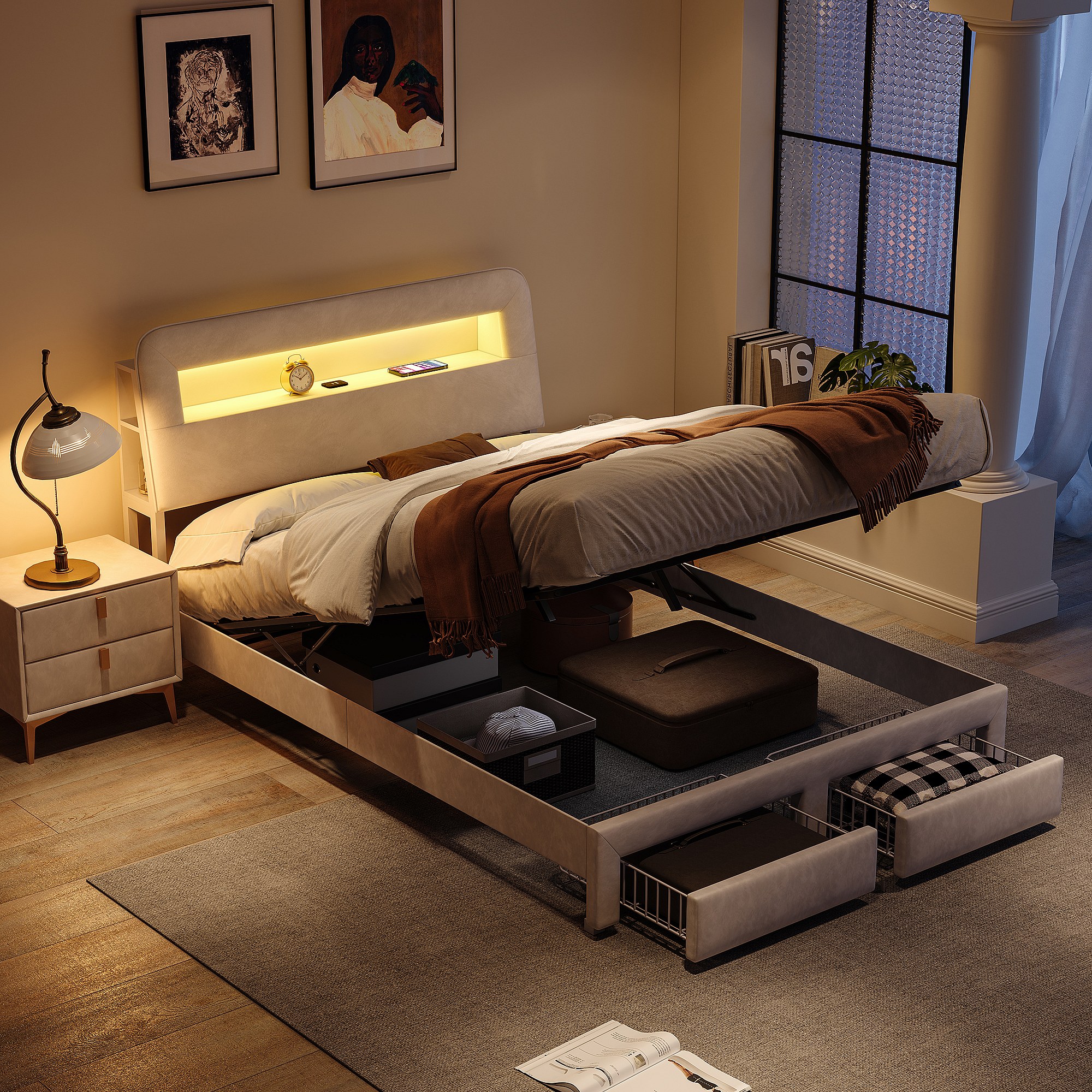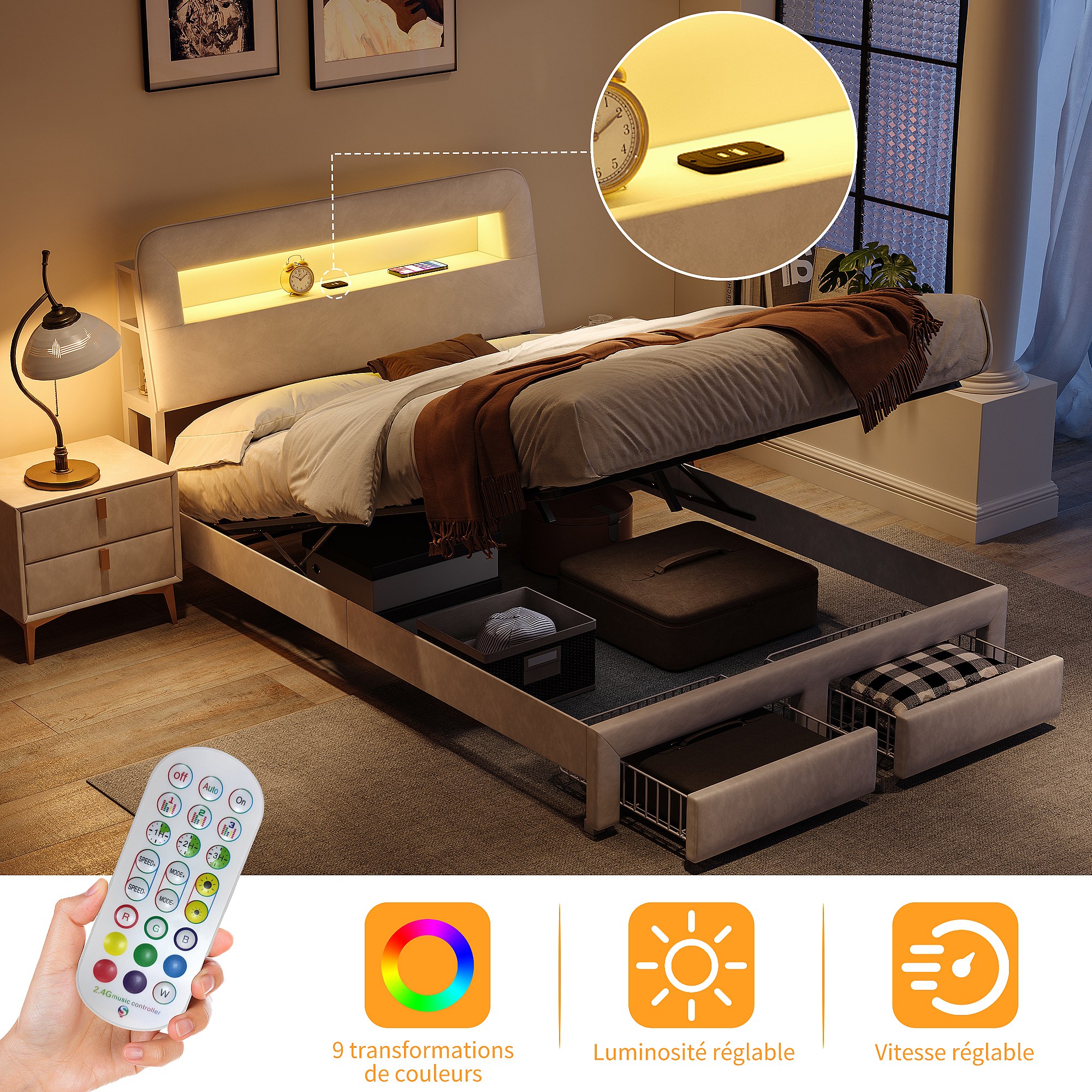 140x200 cm crèmebeige fluwelen bed met lades, opbergruimte hoofdbord en voeteneinde, USB-poort + LED, modieus design