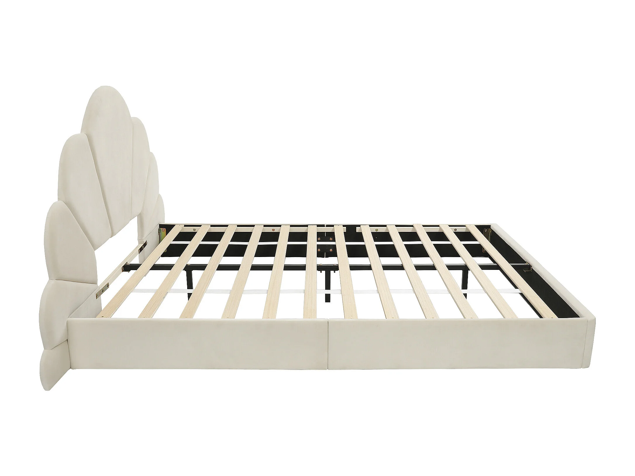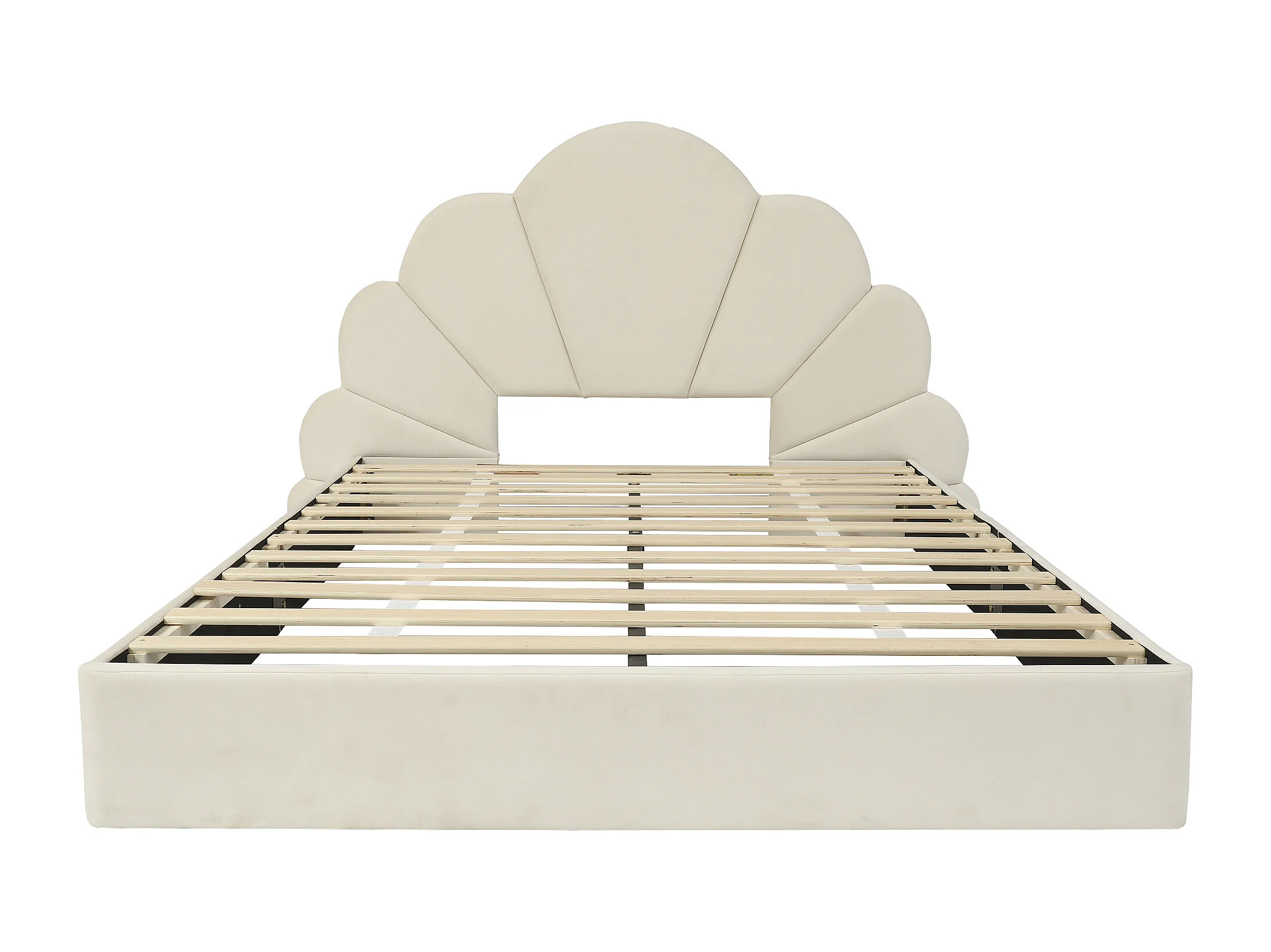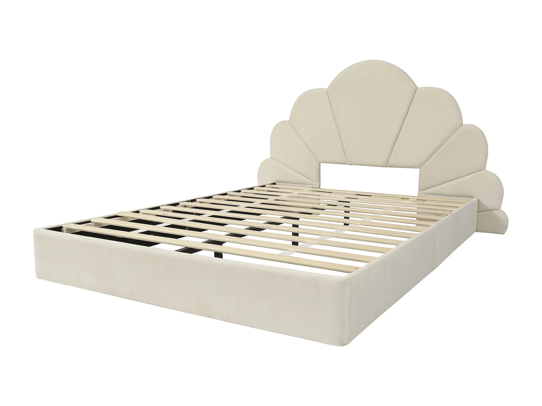 140x200 cm Kinderbed - T-bed met gebogen hoofdbord met bloemenmotief - beige fluweel - matras niet inbegrepen.
