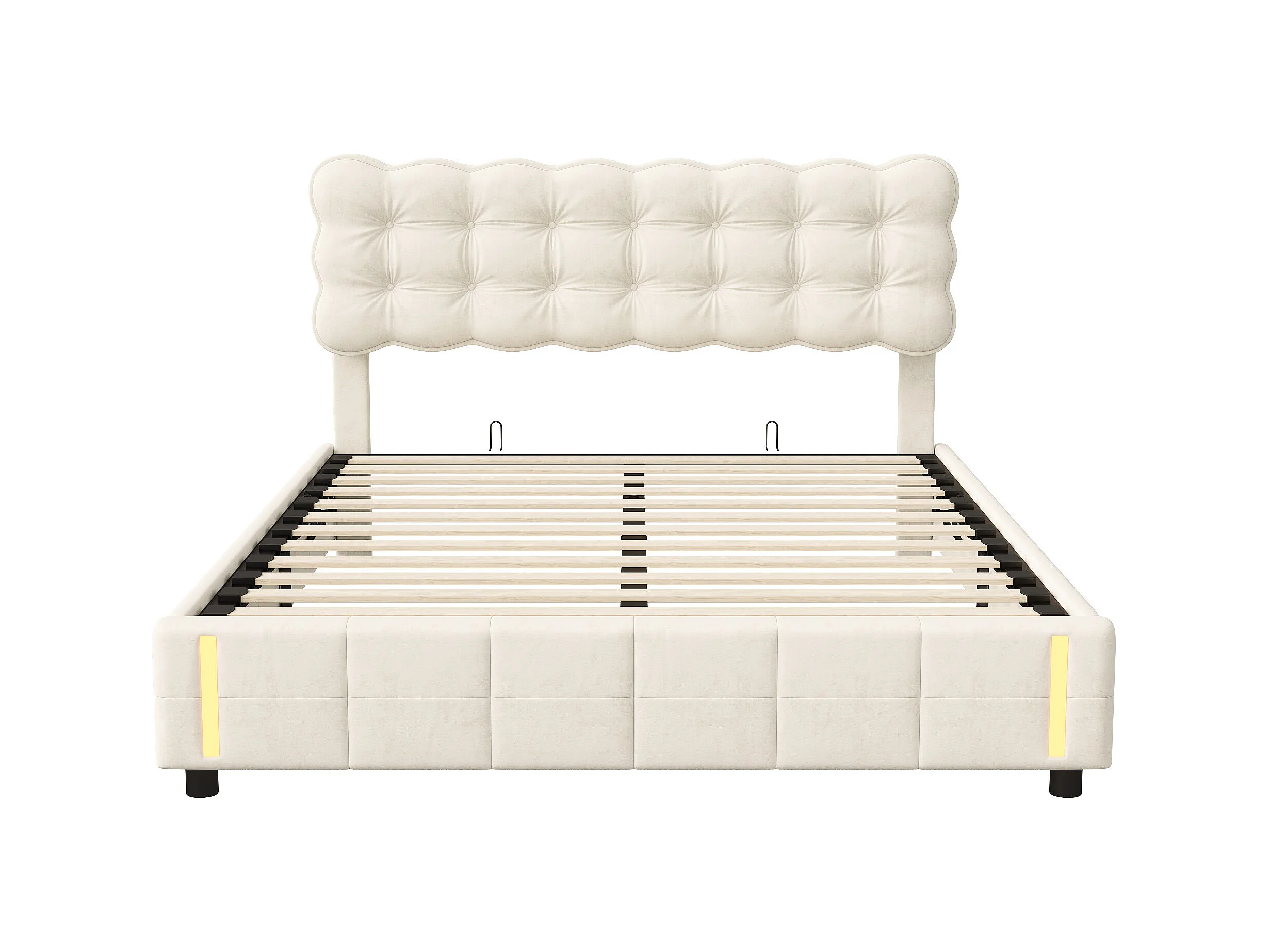 160 x 200 opbergbed, tweepersoonsbed met hydraulische hendel, LED-verlichting aan het voeteneinde, fluweel, beige