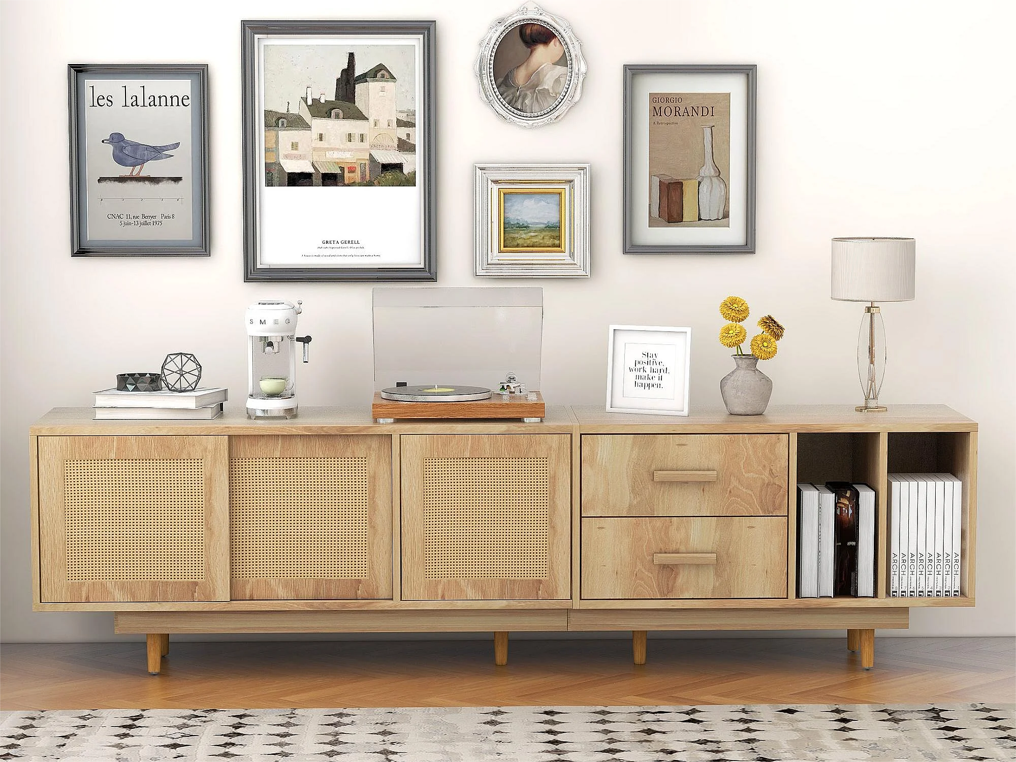190 cm rotan TV-meubel - 3 deuren, 2 laden en 2 nissen - industriële stijl - eiken