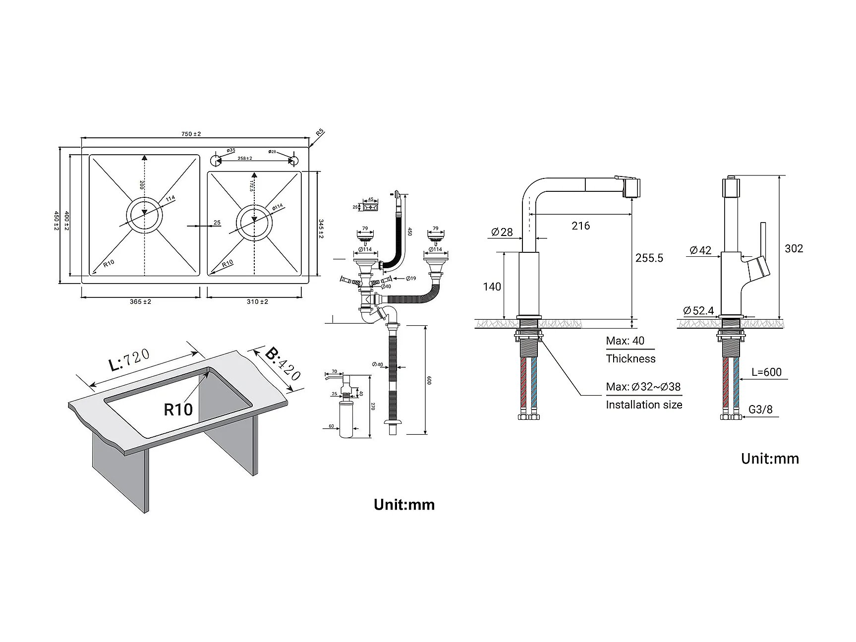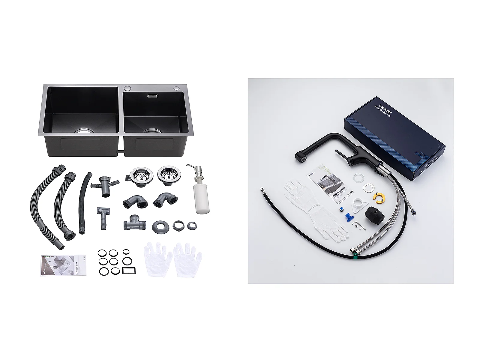 2 in 1 Aanrecht 2 Bakken,75x45x19cm, Inbouw/ Opzetbaar met Zeepdispenser+ Keukenkraan Zwart met Uittrekbare Handdouche