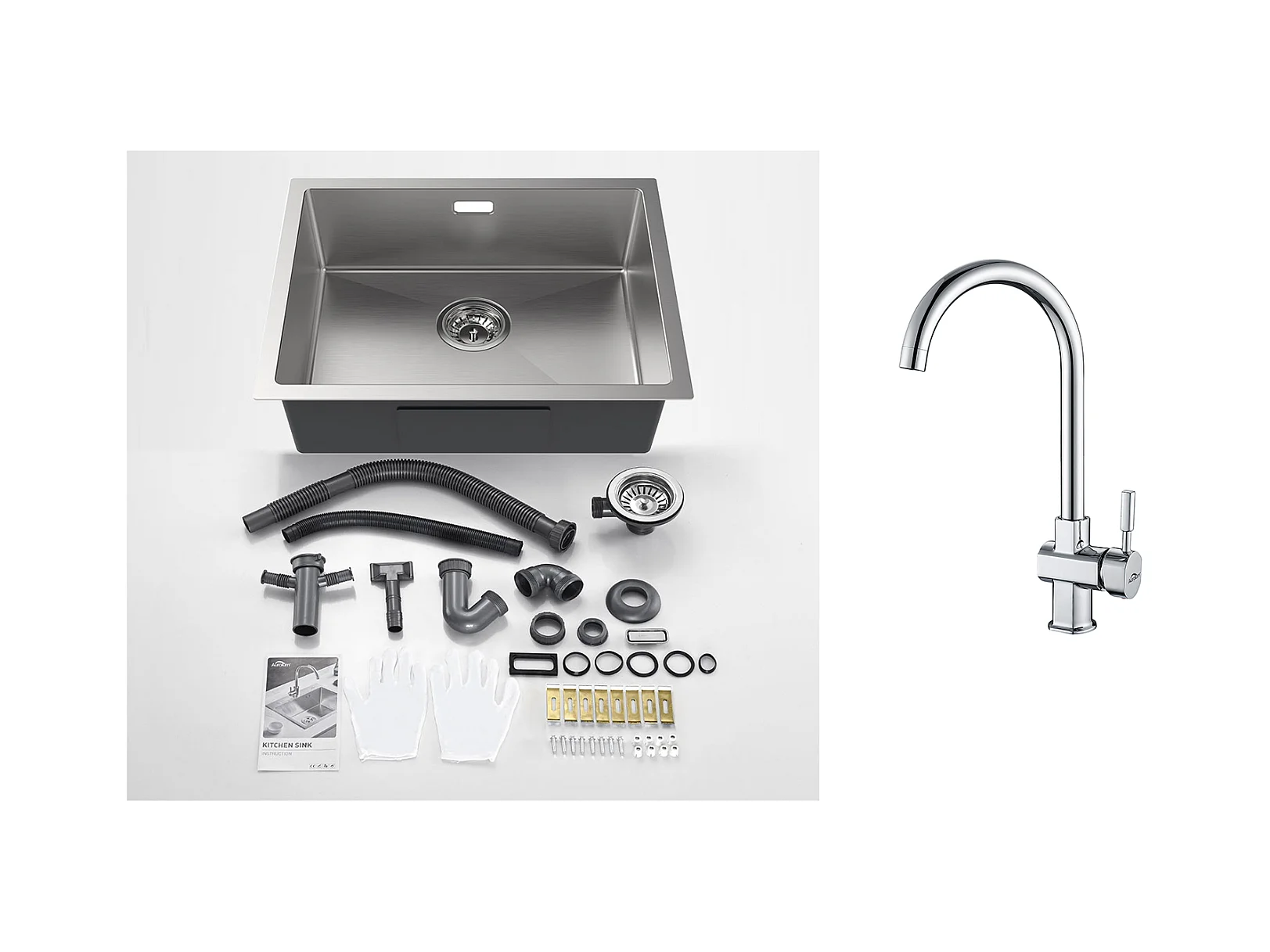 2 in1 Aanrecht 1 Bak 55*44*19CM, Inbouw/Bloei/Ondergrond, Geborsteld+ Zwarte Keukenkraan, Uittrekbaar 360 ° Draaibaar, 2 Functies
