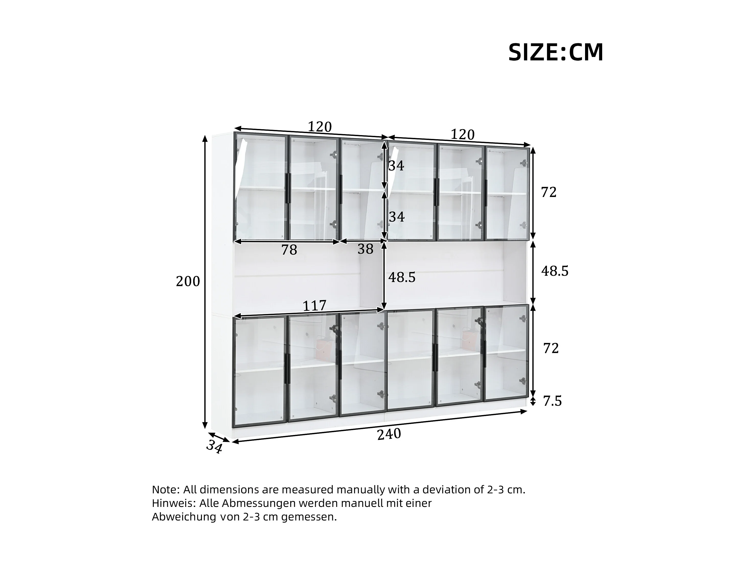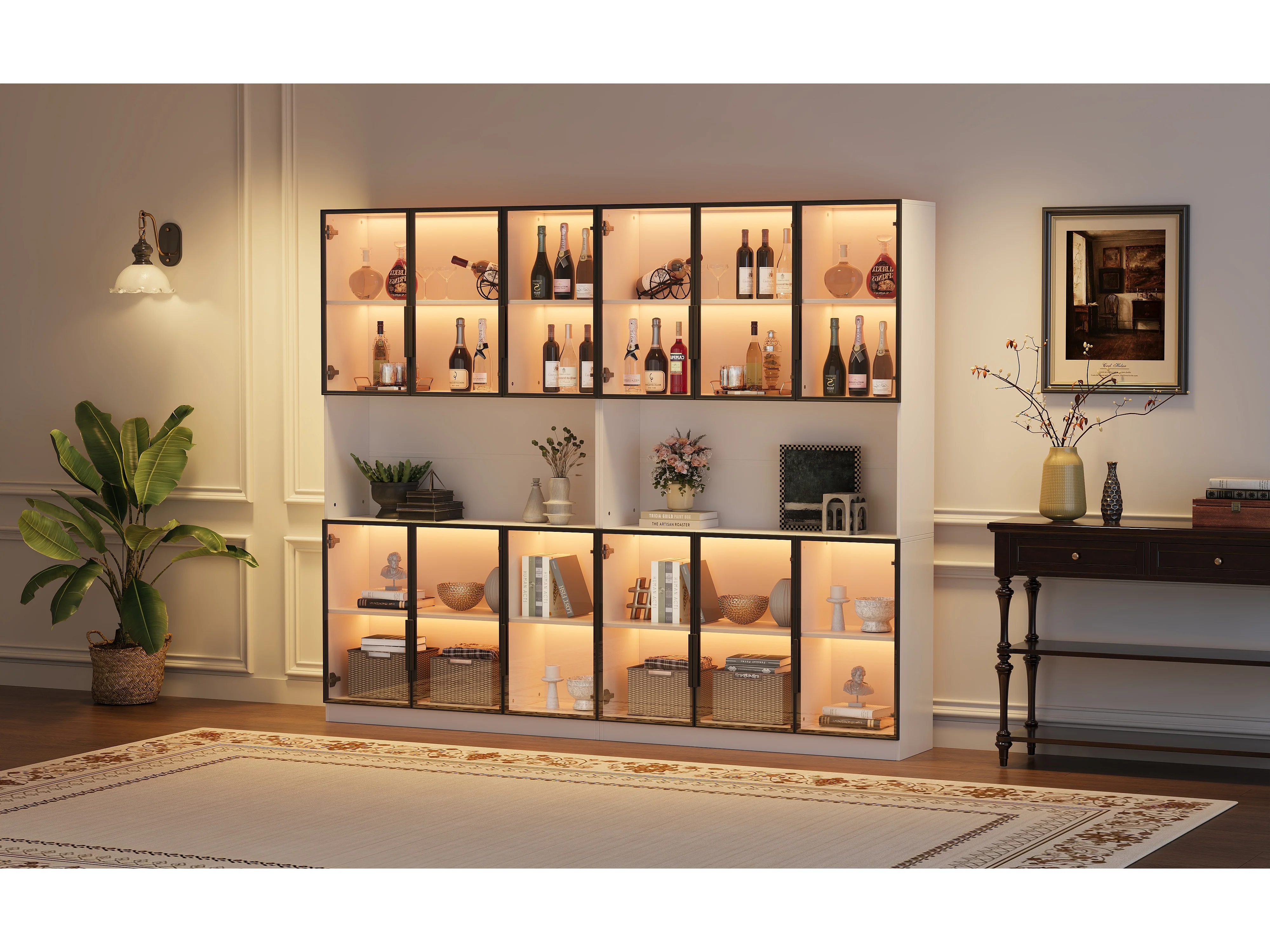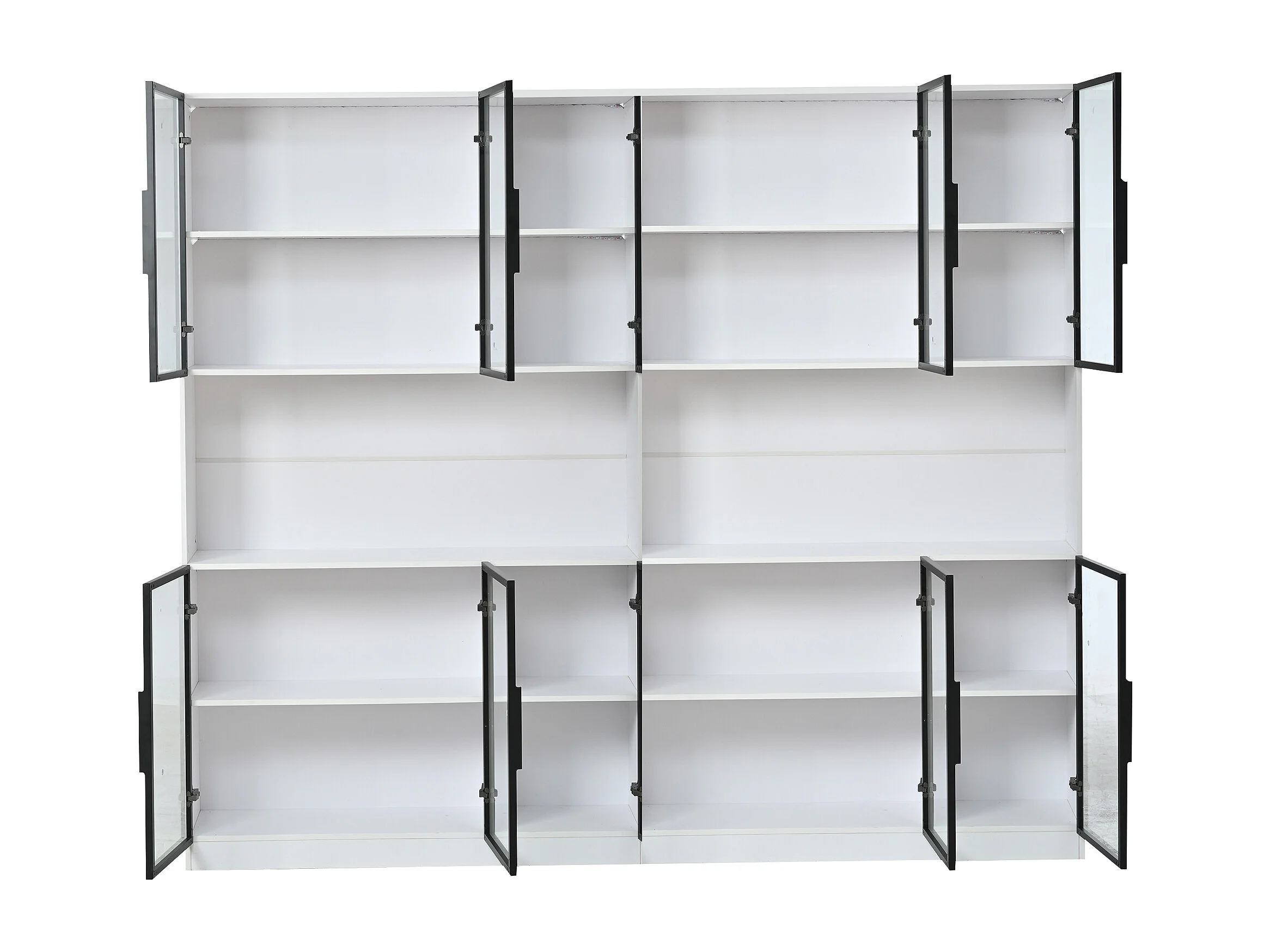 2 moderne hoge glazen vitrines - 120 x 34 x 200 cm - met LED-verlichting + 6 deuren + plank - spaanplaat - wit