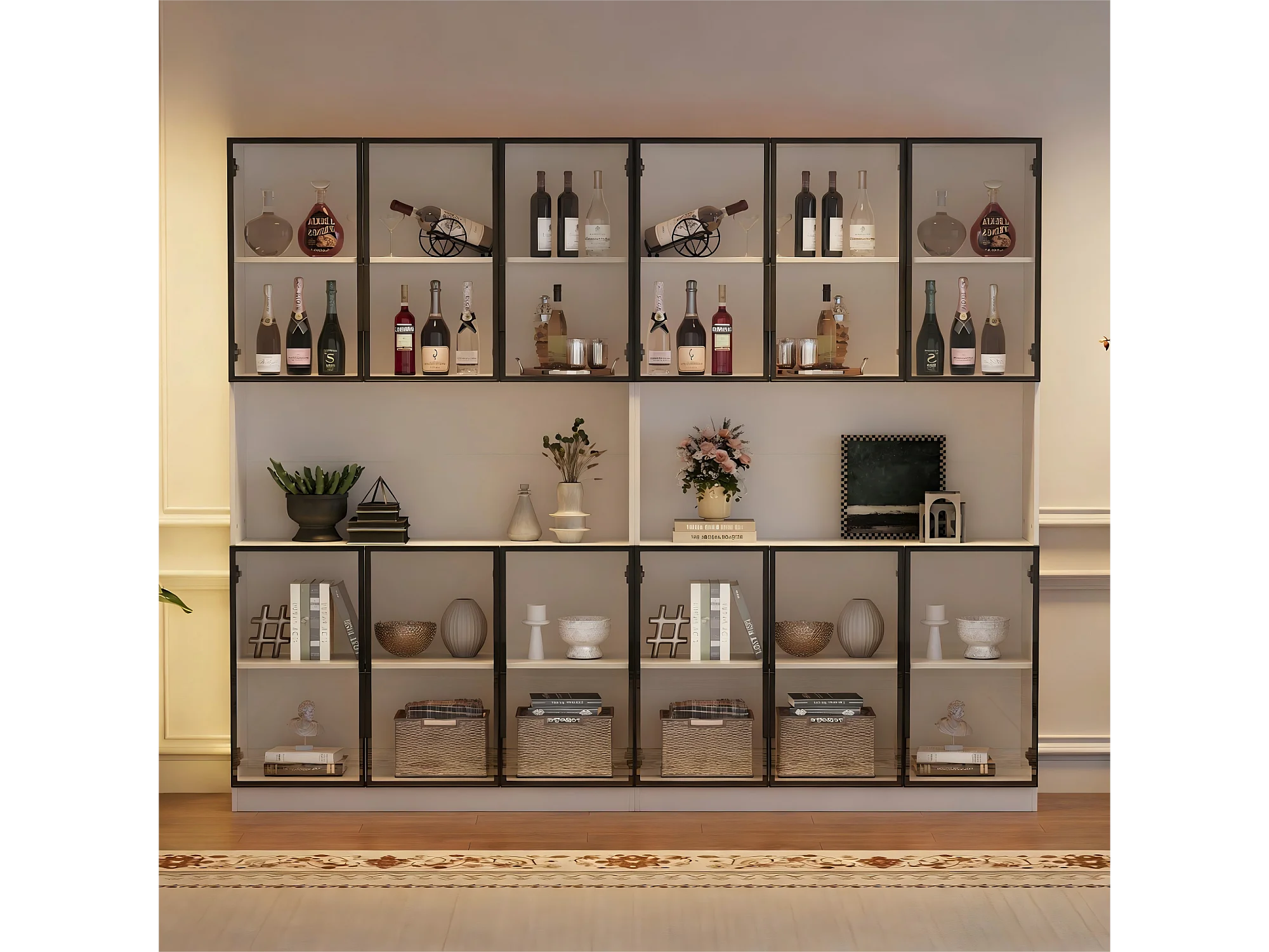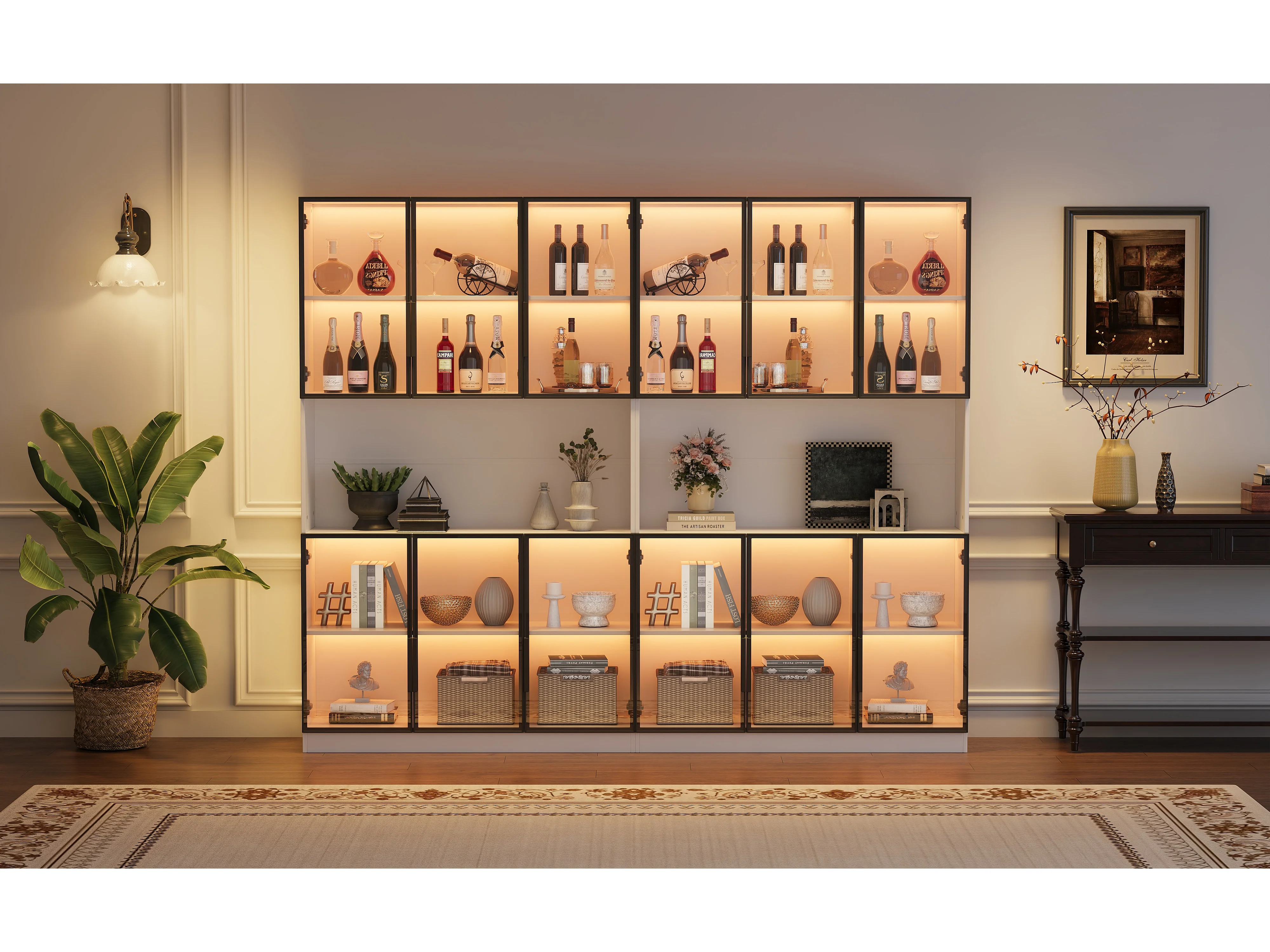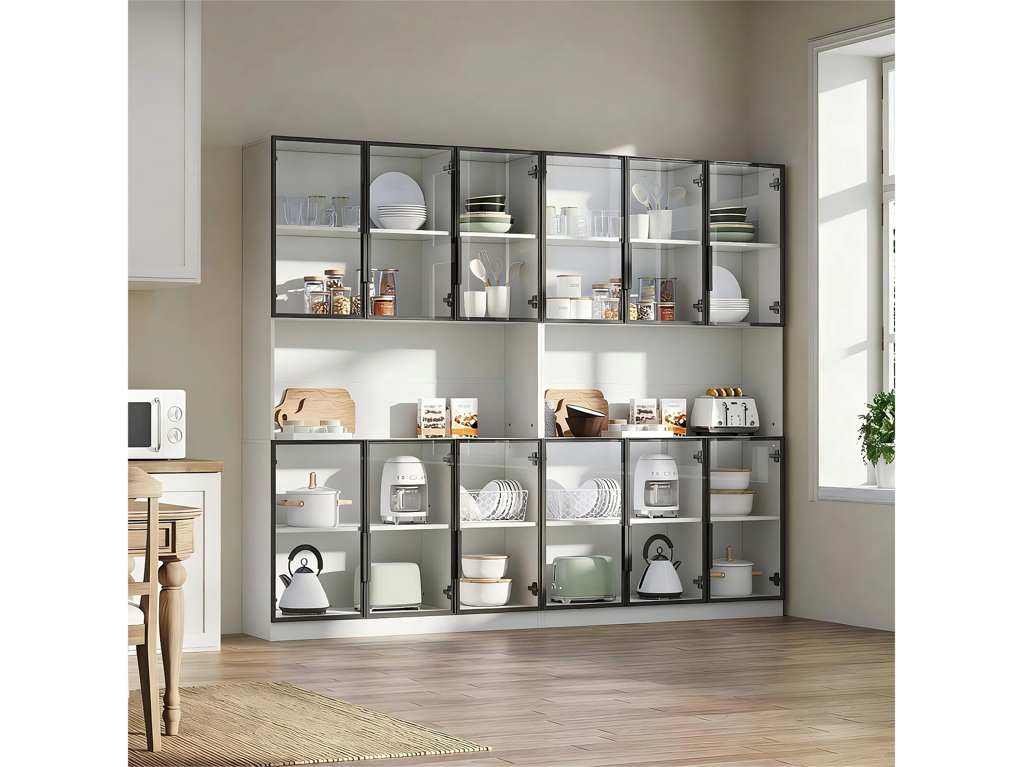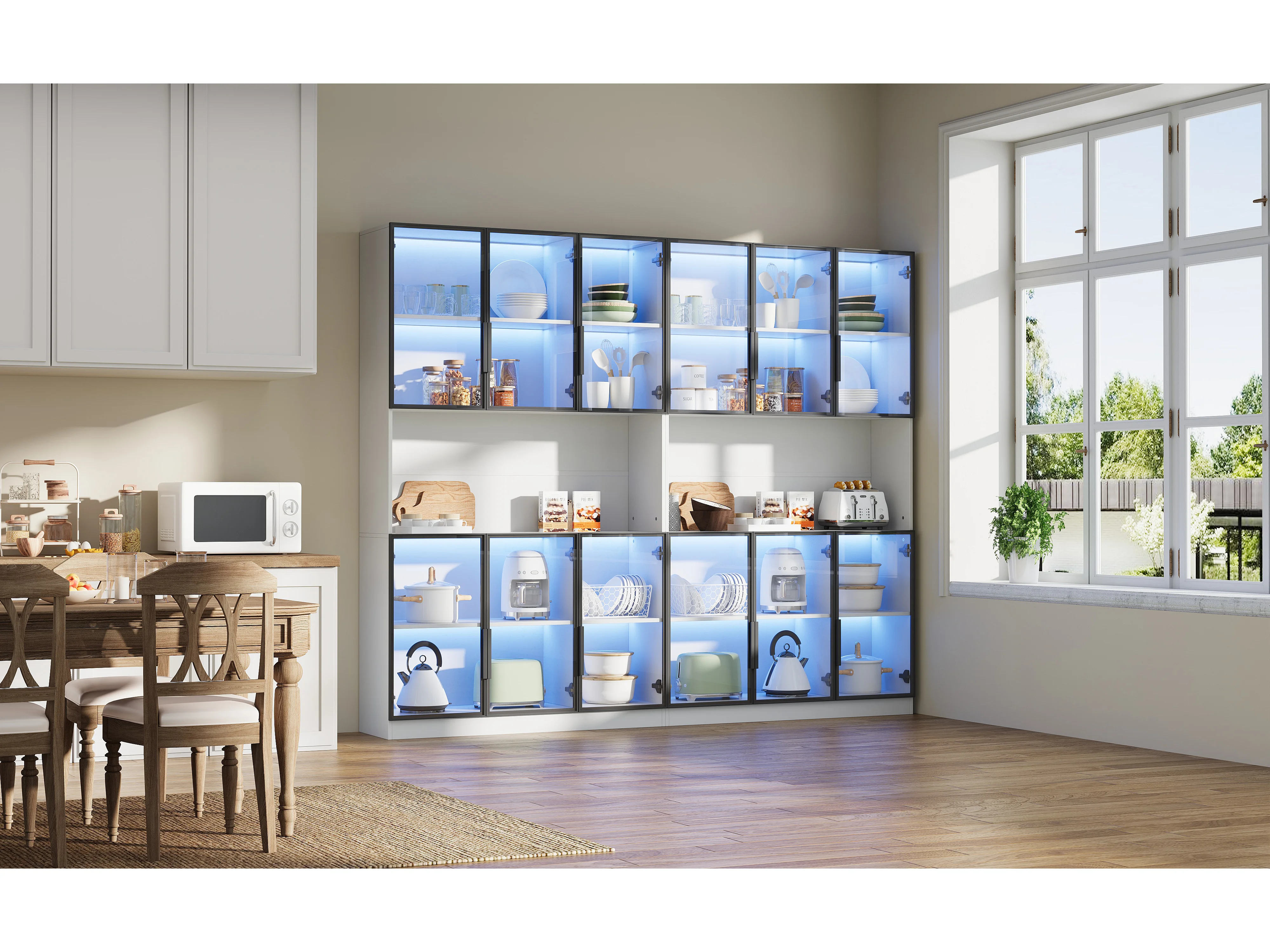 2 moderne hoge glazen vitrines - 120 x 34 x 200 cm - met LED-verlichting + 6 deuren + plank - spaanplaat - wit