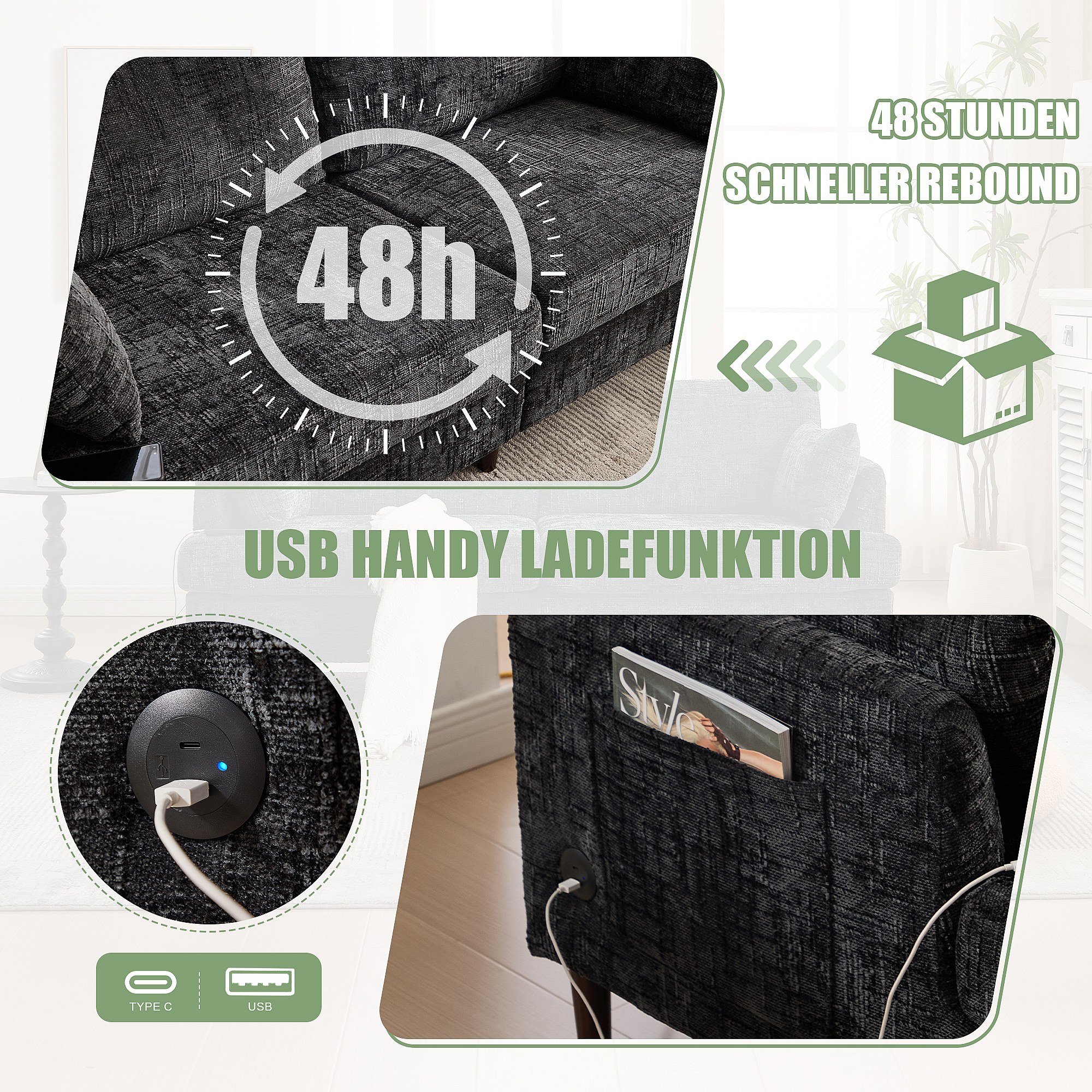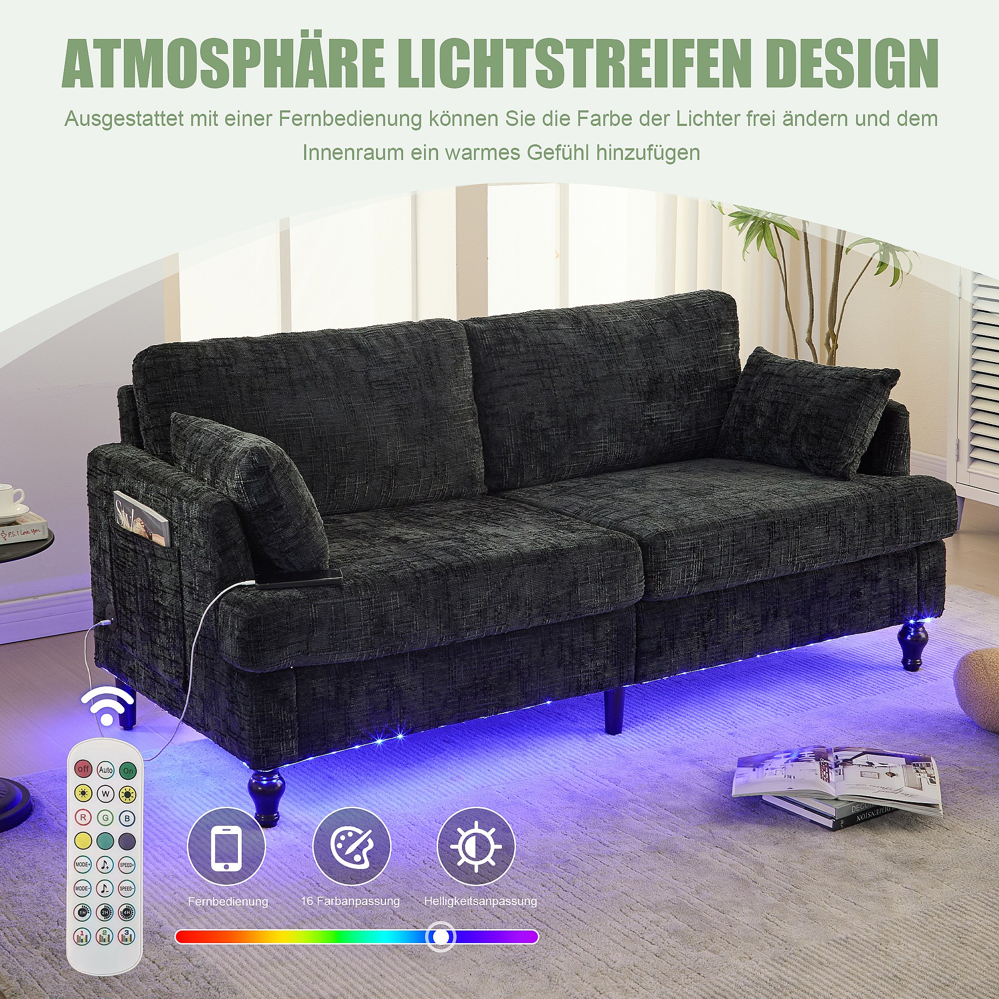 2-zits chenillebank - met LED's, USB-poorten - dubbele zitting en hoge rugleuning - Ideaal voor woonkamer of klein kantoor