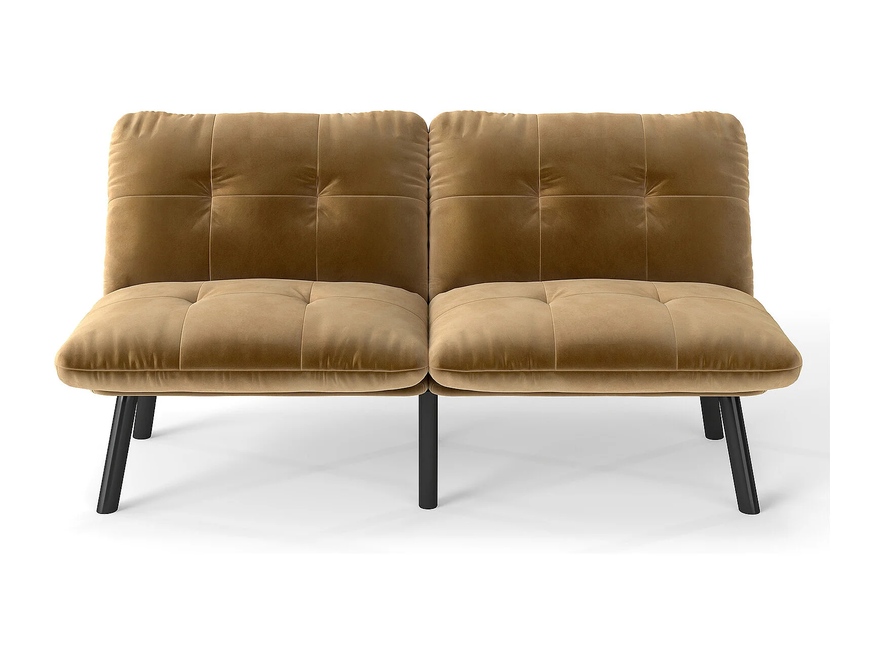 2-zits slaapbank in bruin, fluweel en metaal, met zwarte poten.