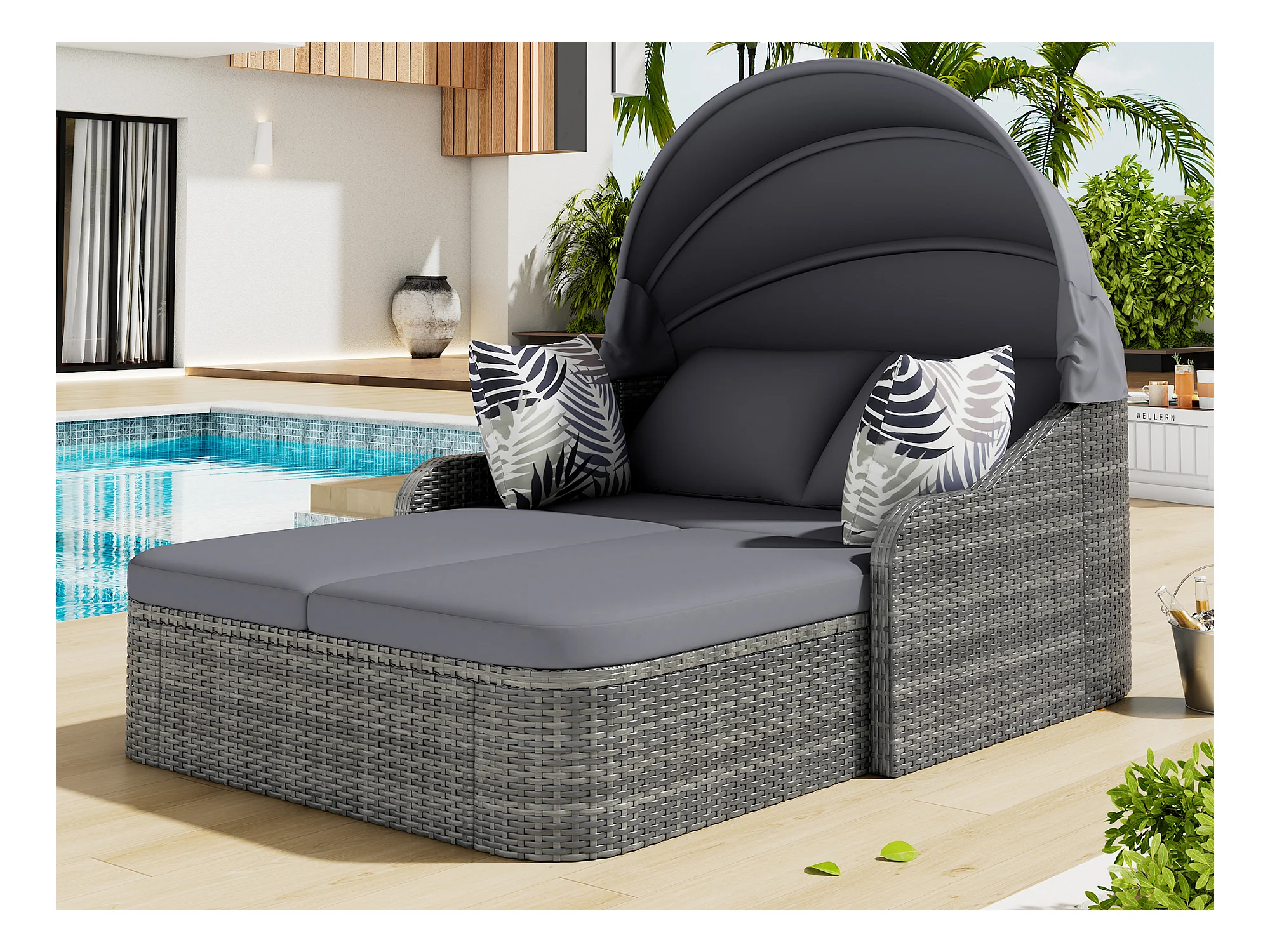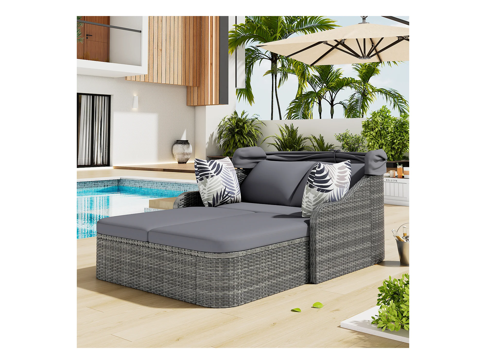 2-zits tuinmeubelen van geweven hars, tuinbed met verstelbare luifel, terrasfauteuil, inclusief 6 kussens, grijs