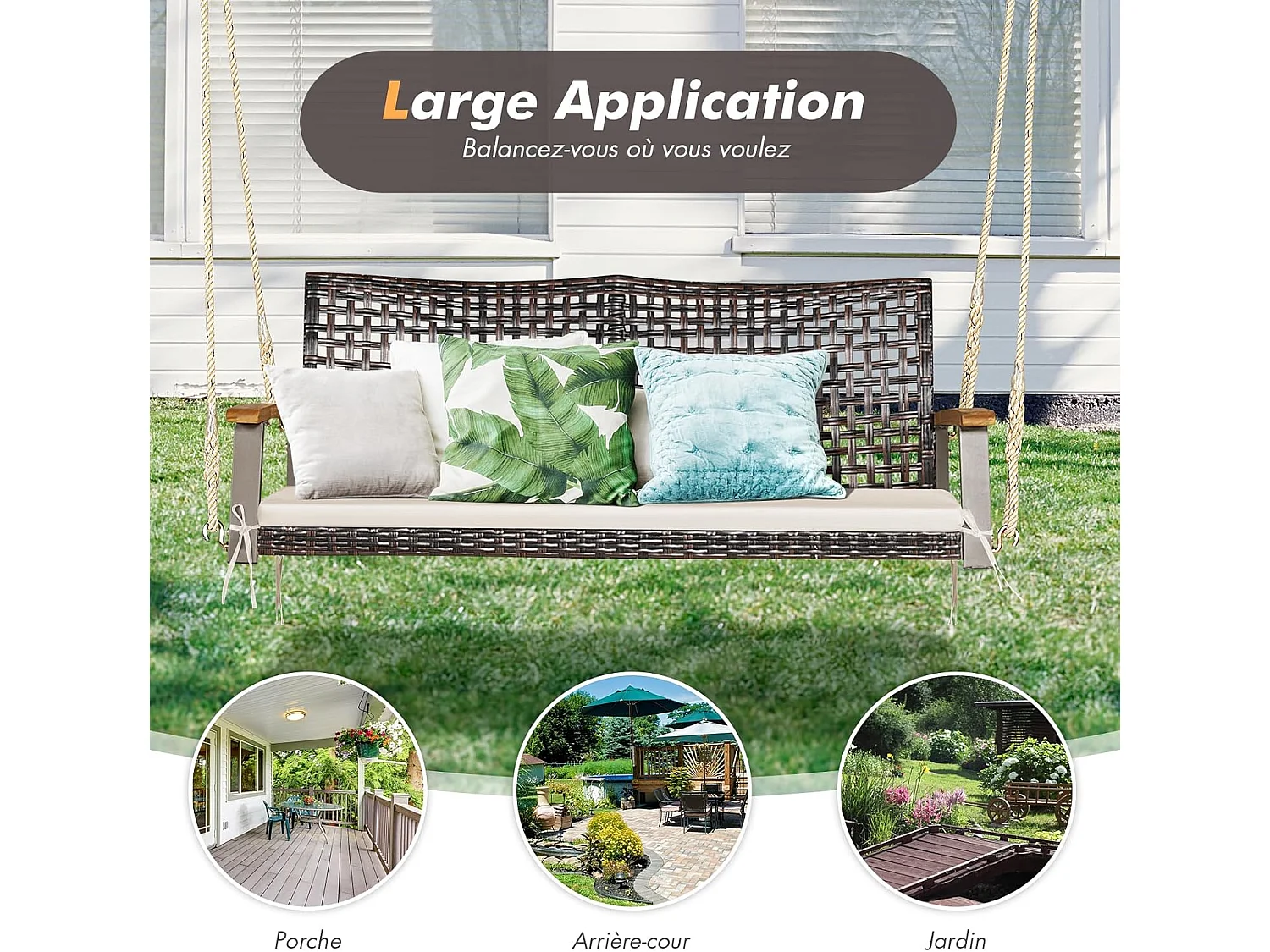 2-zits tuinschommel van rotan en natuurlijke vezels, rieten verandaschommel met armleuning en kussen van acaciahout, hangende bank met 2 ophangkabels van 300 cm, belasting 360 kg (beige)