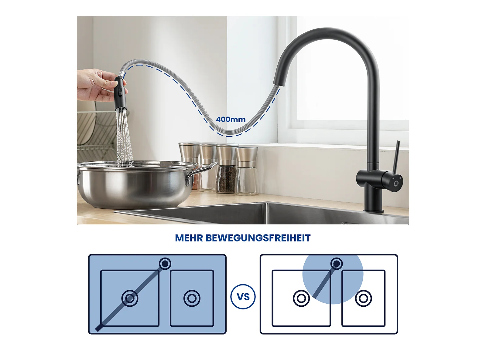 Cecipa max keukenmengkraan met uittrekbare spray - wastafelkraan met 3 waterafvoermodi - roestvrijstalen keukenmengkraan - zwart, EU-model