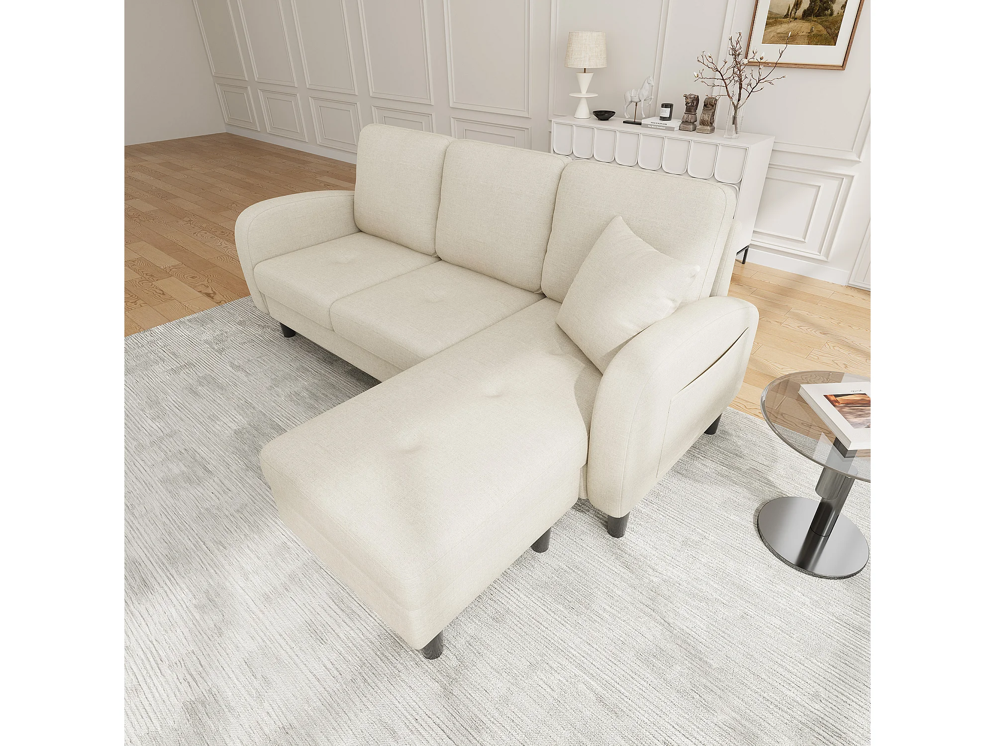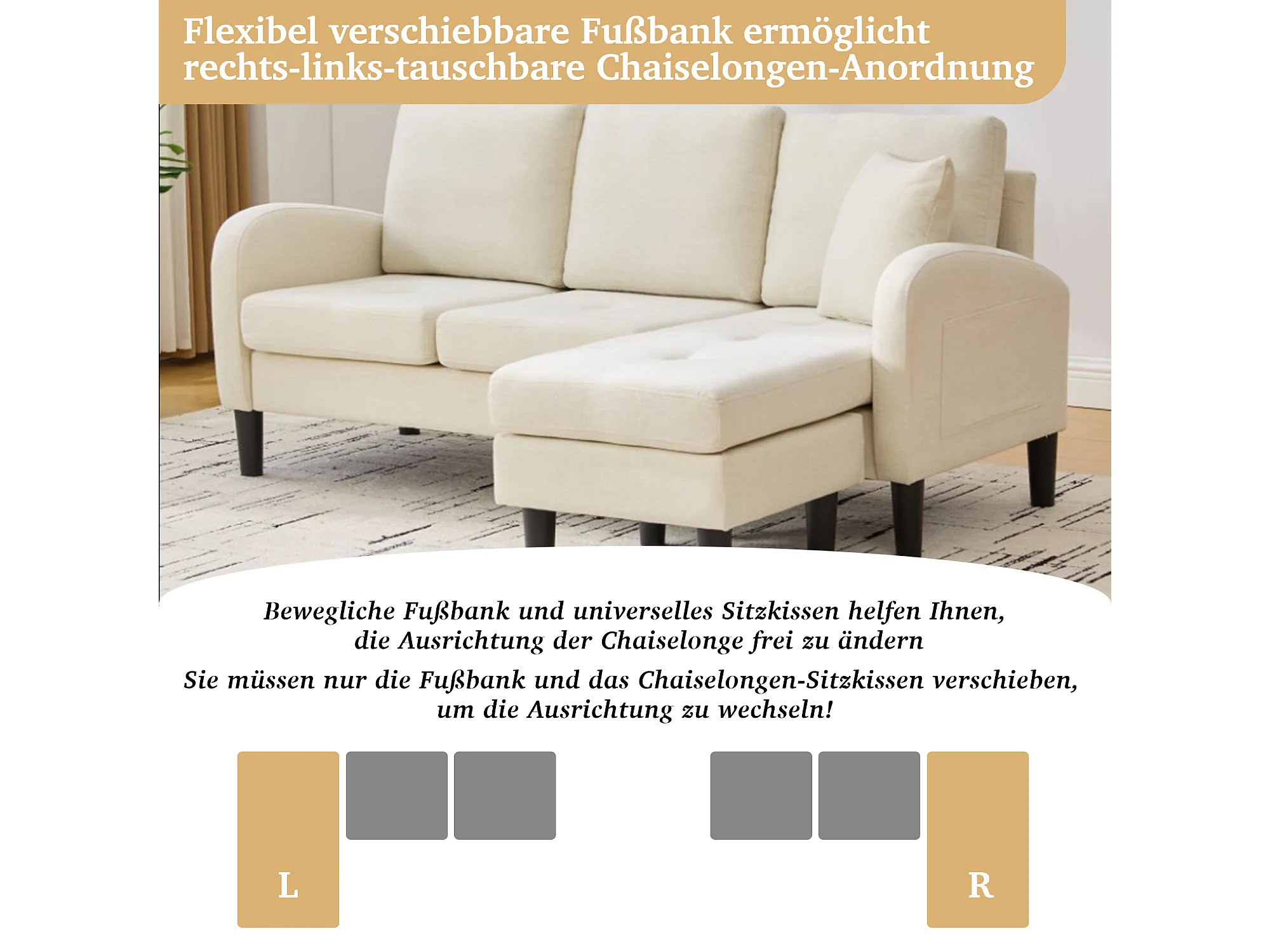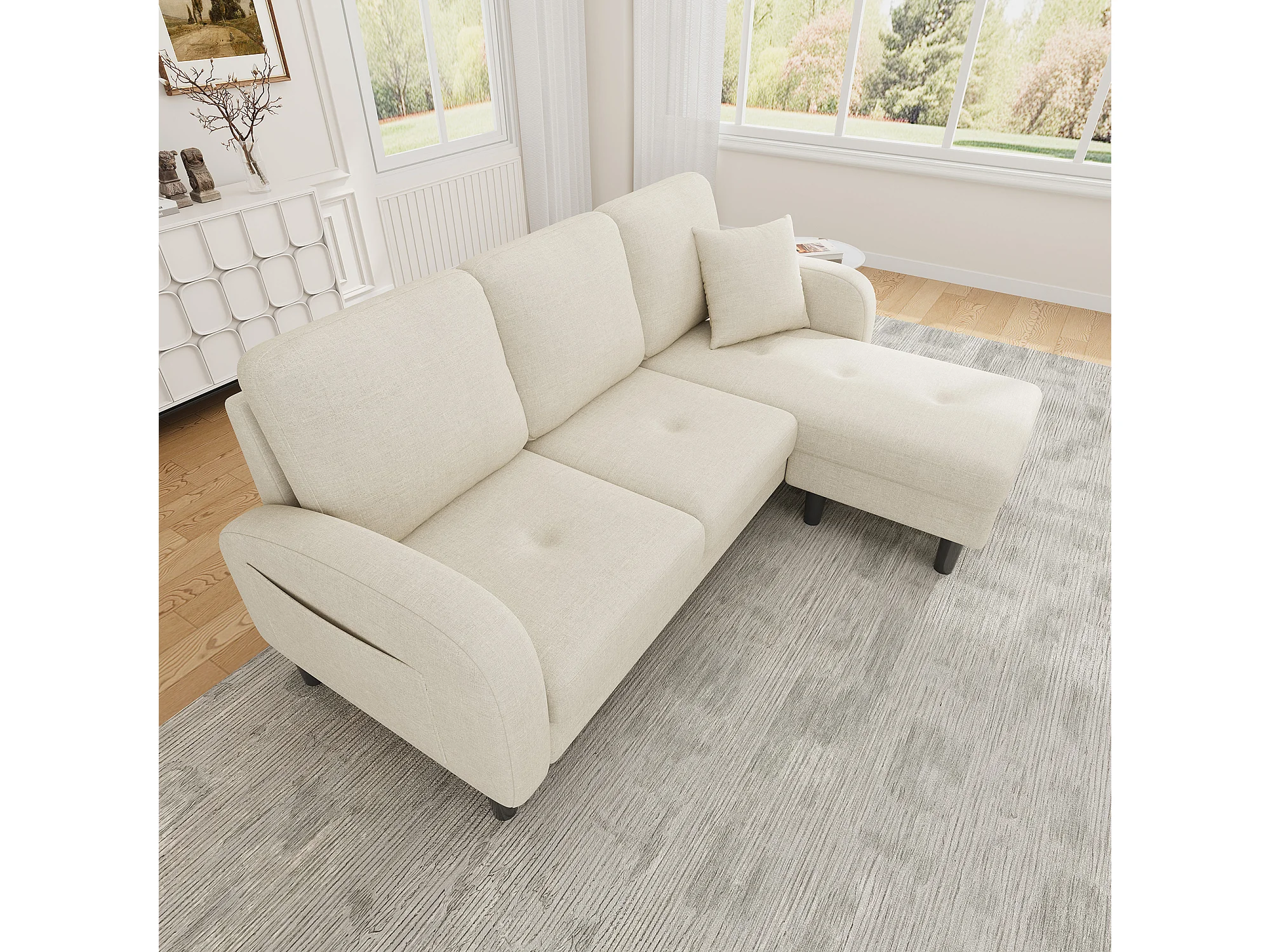 3-zits hoekbank met chaise longue - 166 x 118 x 77 cm - fluwelen stof - kunststof poten - lichtbeige