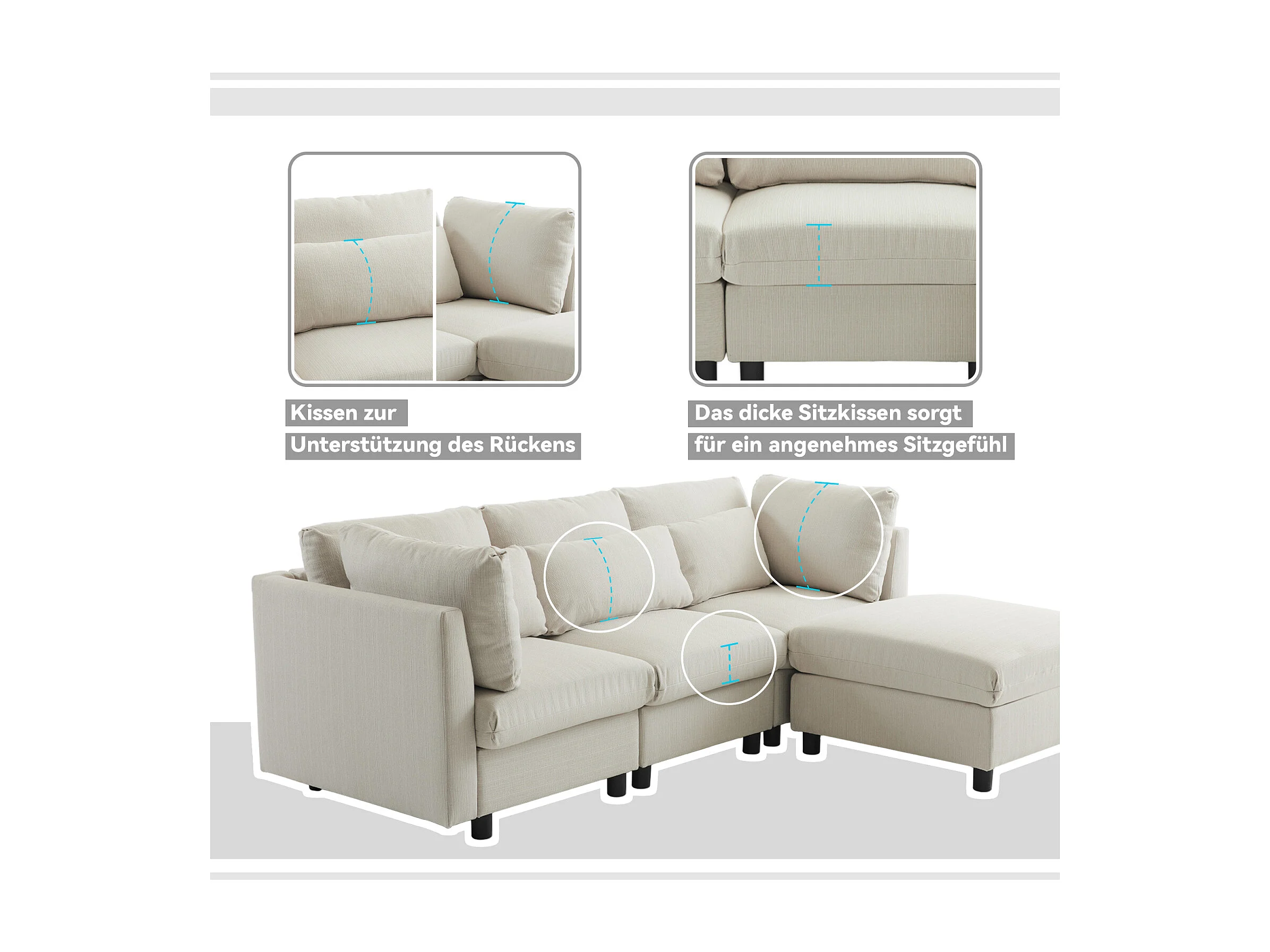 Modulaire rechte bank met voetenbank in structuurstof "Lusso" - 3-zits - Beige