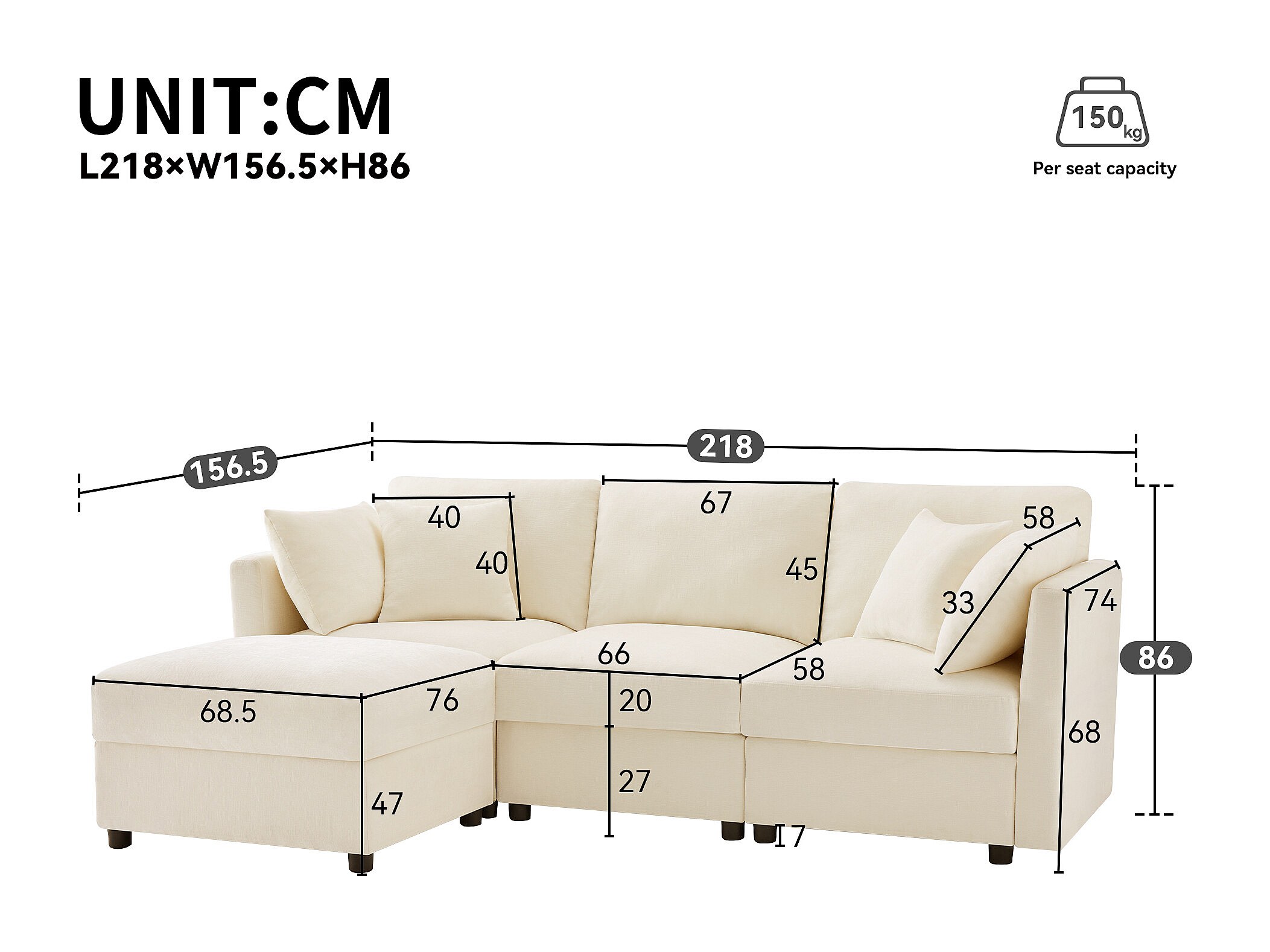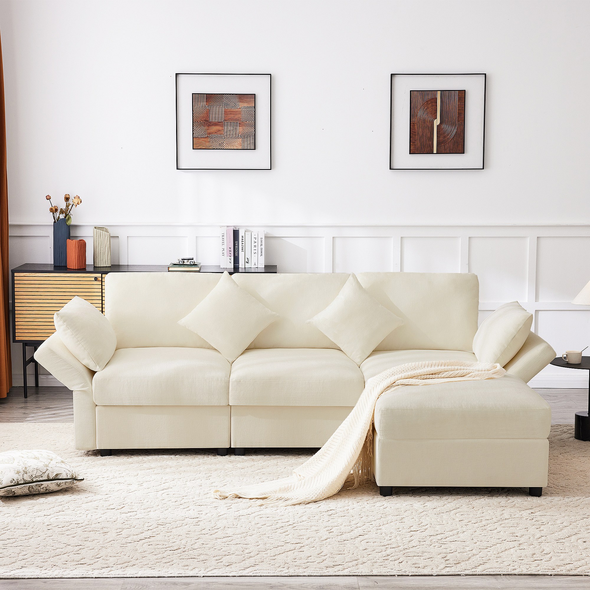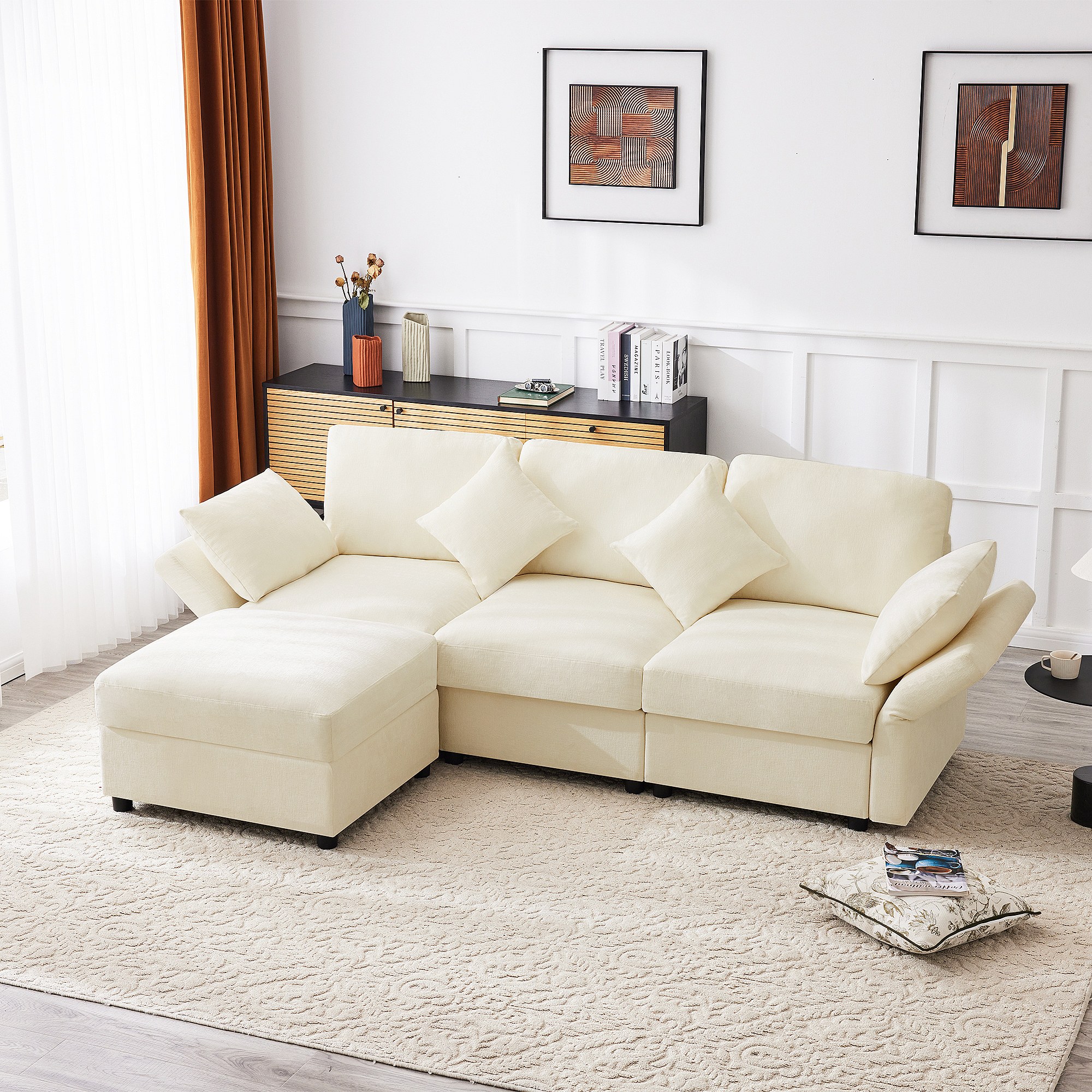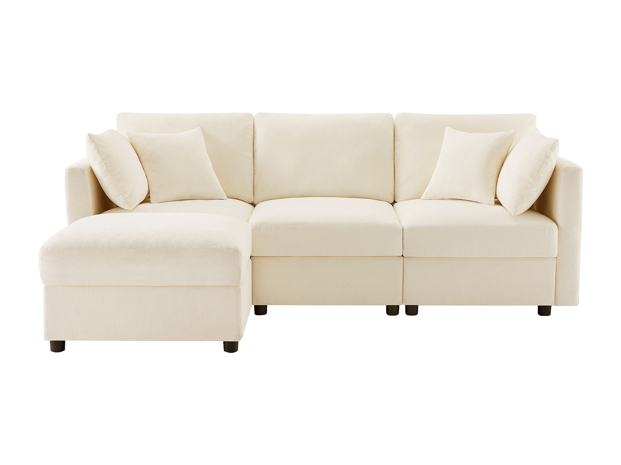 3-zitsbank, Hoekbank met voetenbank en verstelbare armleuningen - Beige chenille