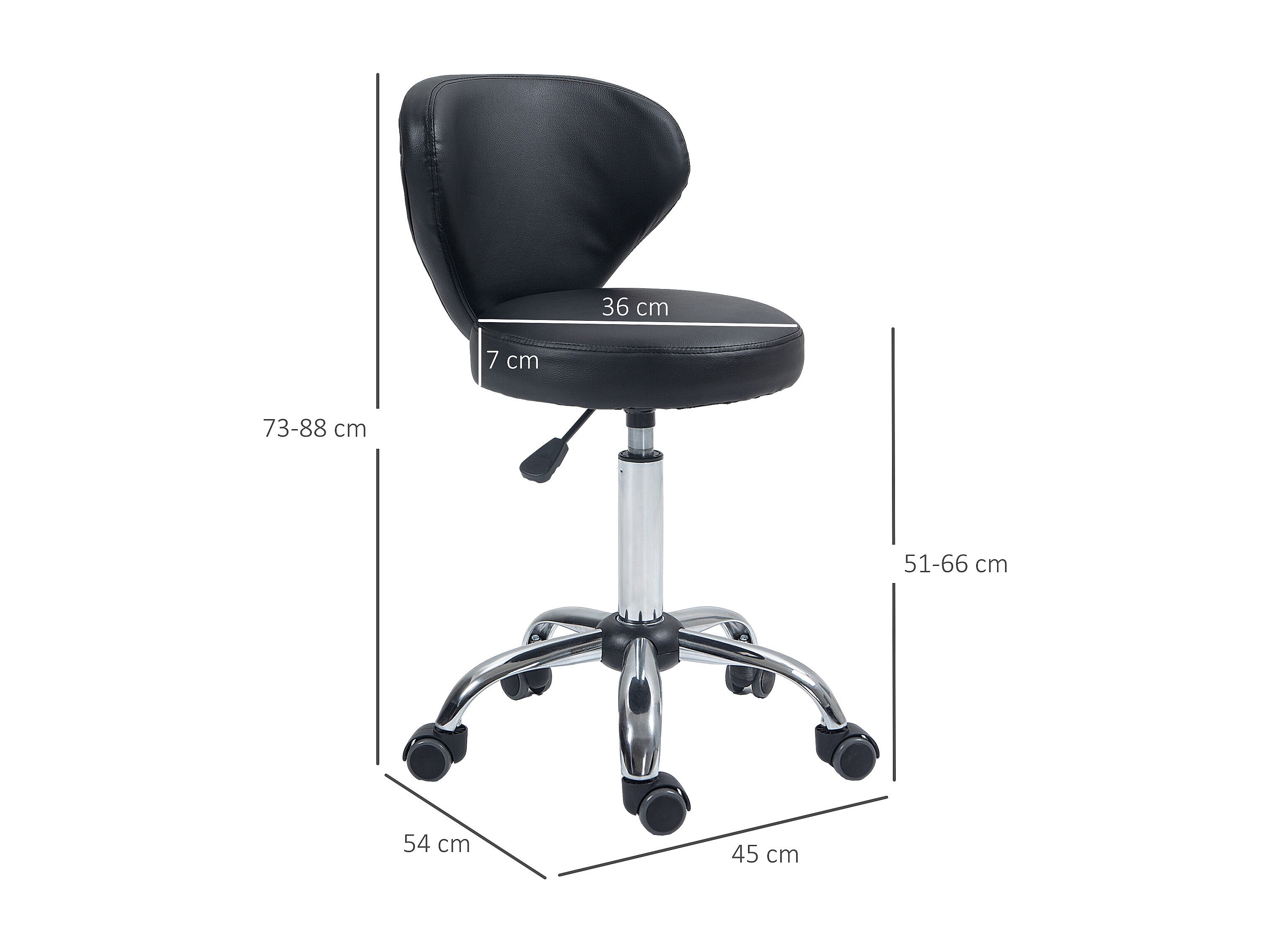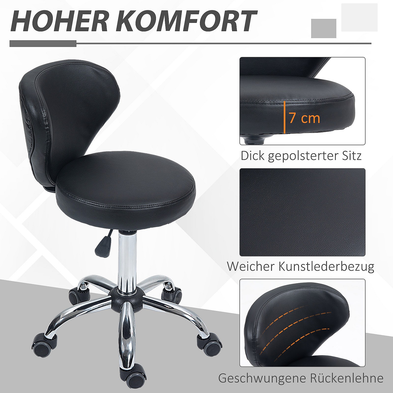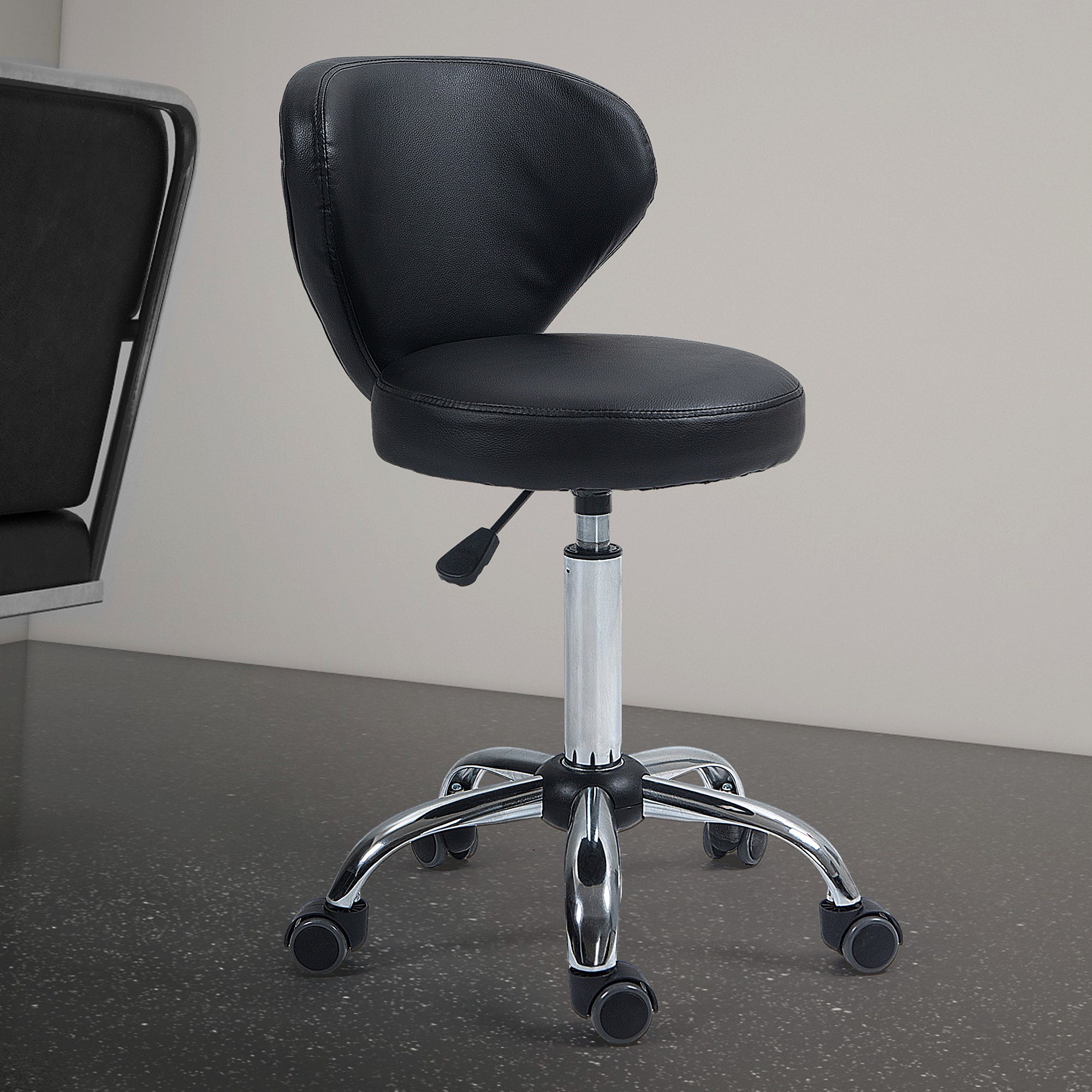 360° draaibare werkkruk met massagefunctie, verstelbare, ergonomische rugleuning, bekleding van verchroomd metaal en zwart kunstleder