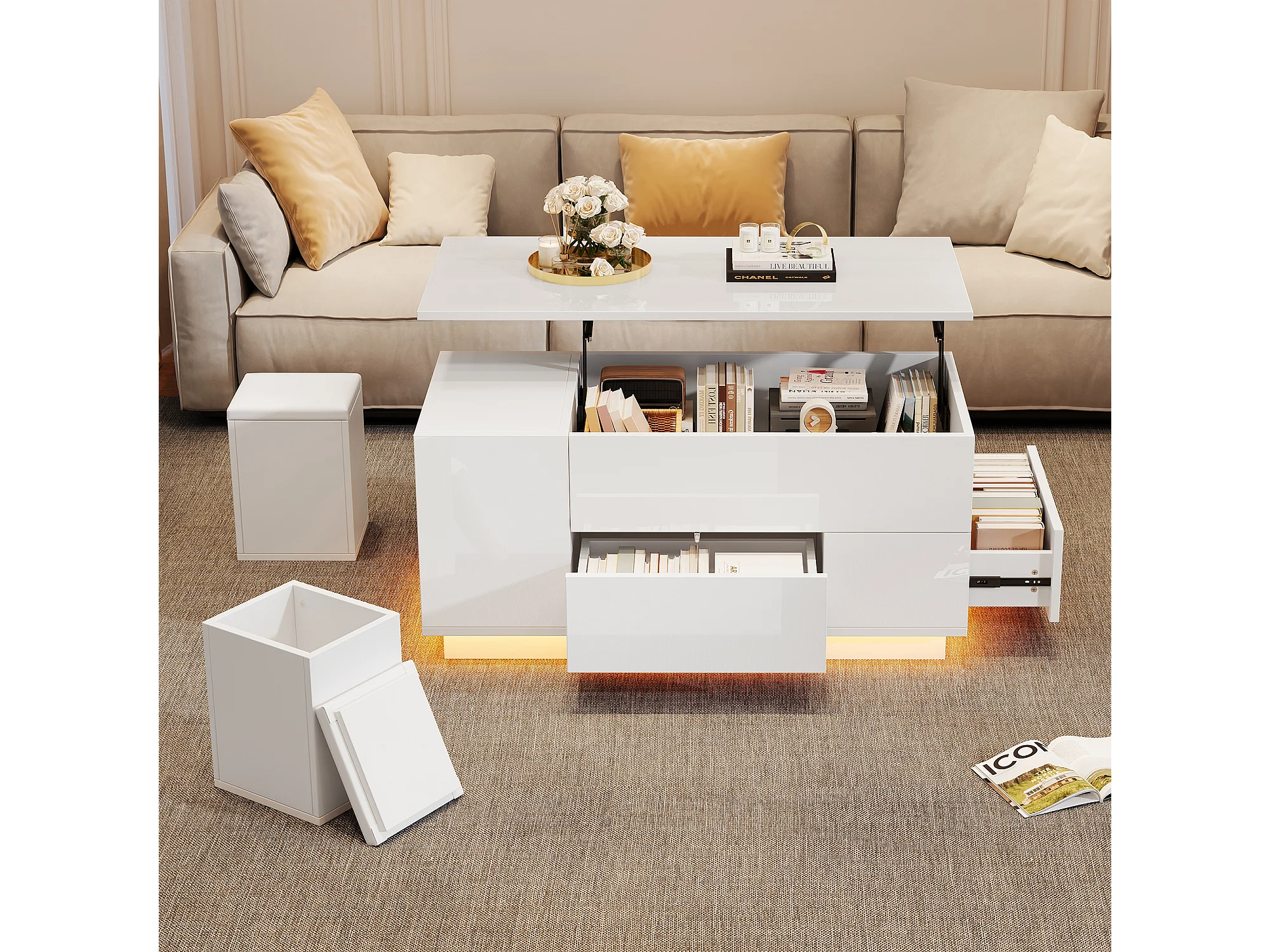 4-in-1 in hoogte verstelbare multifunctionele salontafel met led-verlichting, 2 lades en opbergkrukken, spaanplaat, wit (100x50x45cm)
