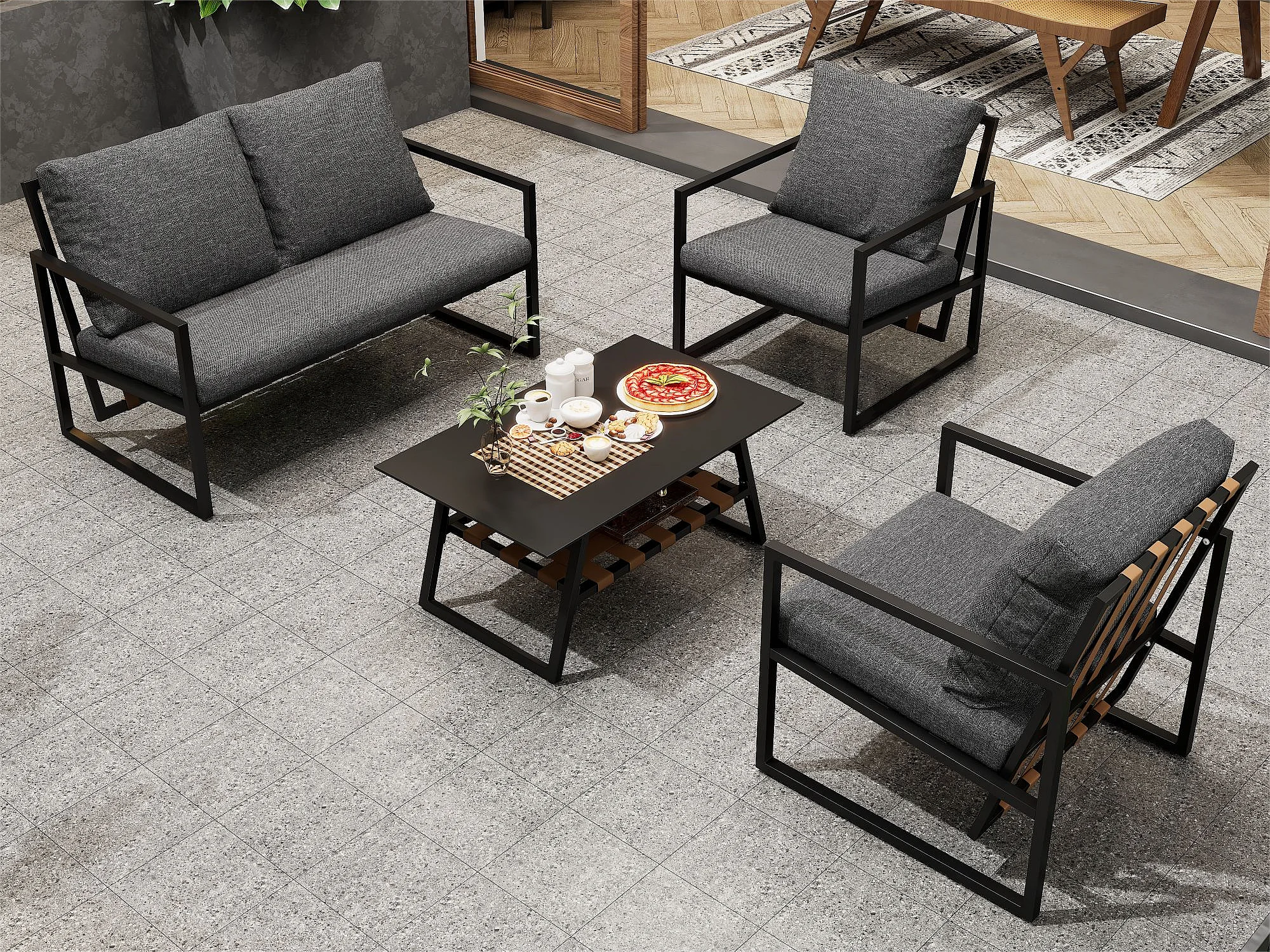 4-zits gegalvaniseerd stalen tuinmeubel: 1 bank + 2 stoelen + 1 salontafel met 2 planken - 7 zit- en rugkussens - Zwart