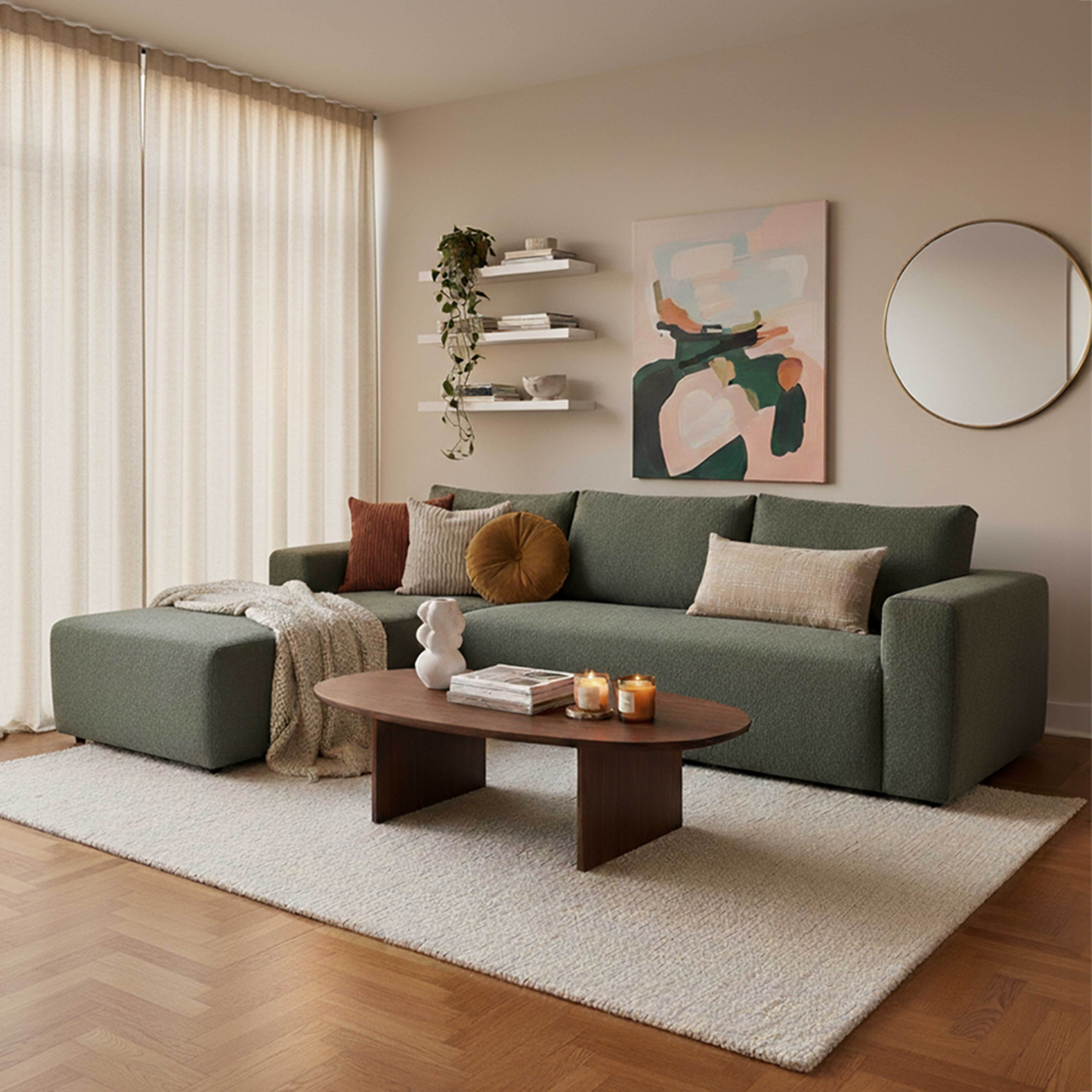 4-zits hoekbank in groen met chaise longue links