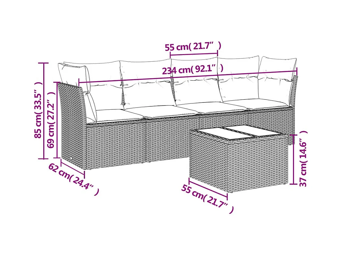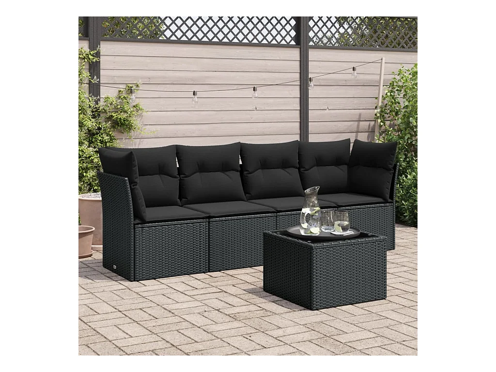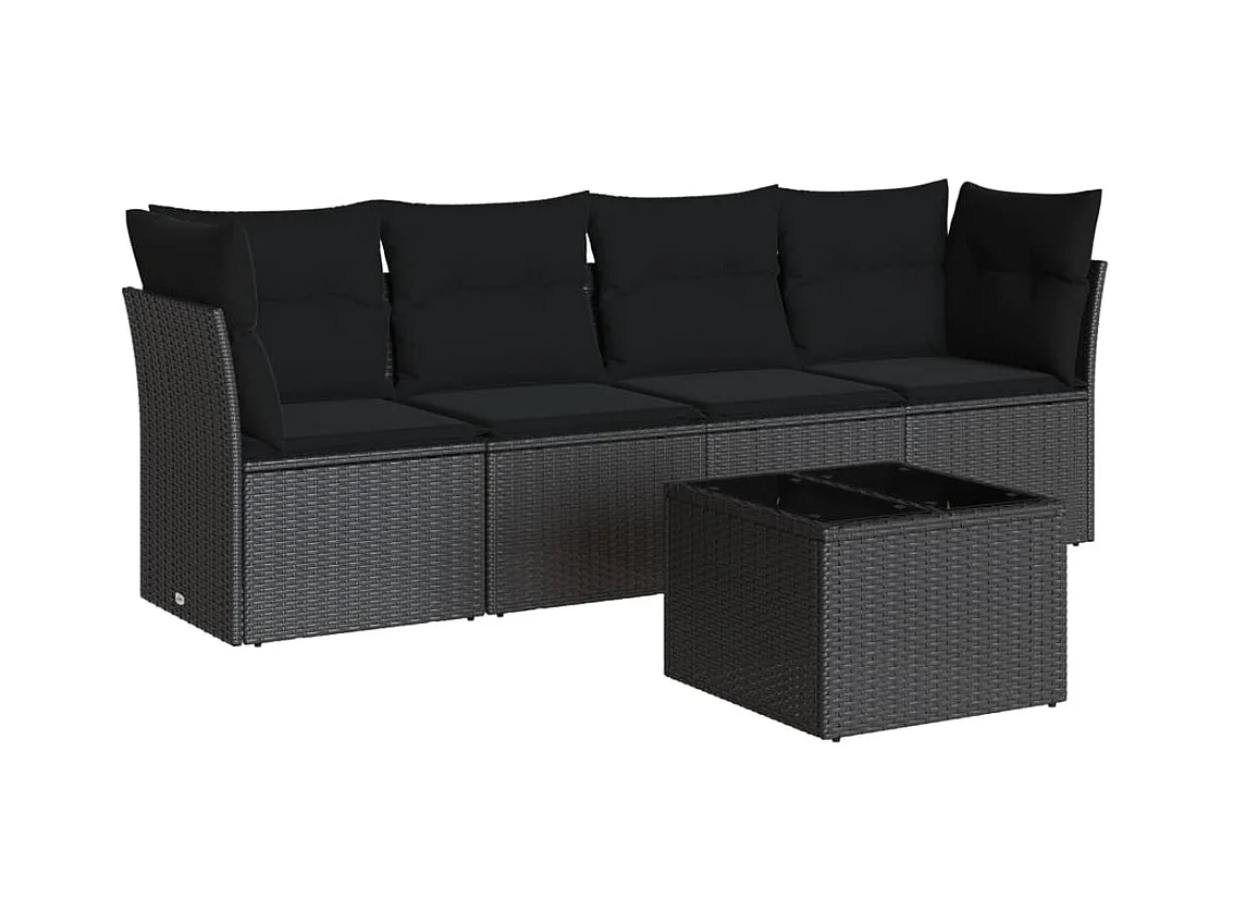 5-delige Loungeset met kussens poly rattan zwart