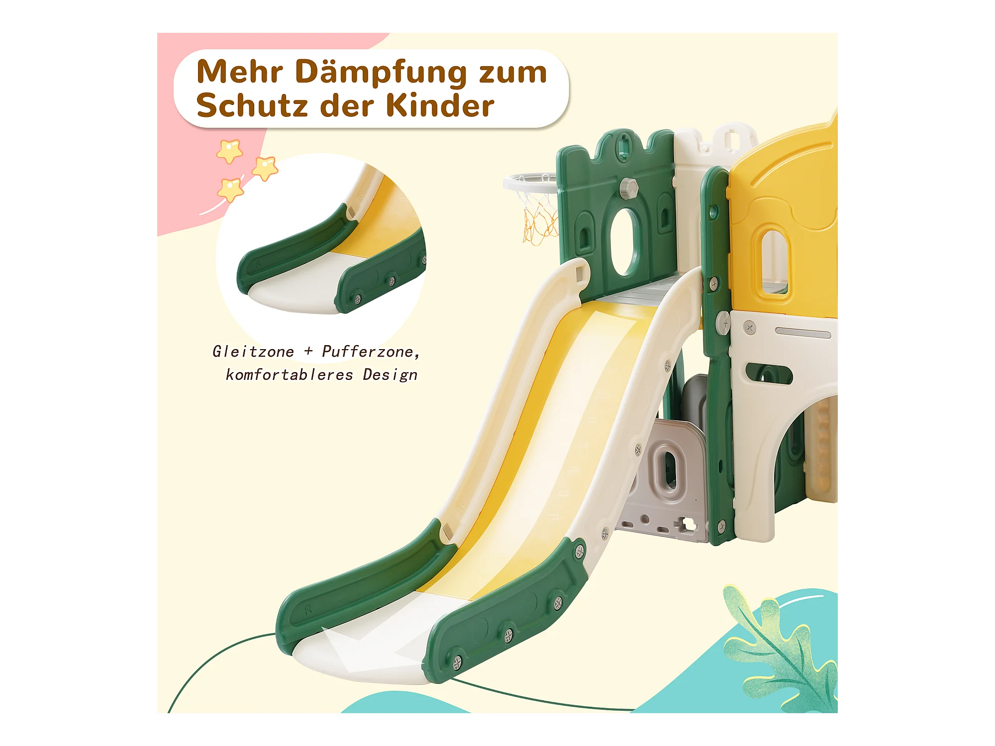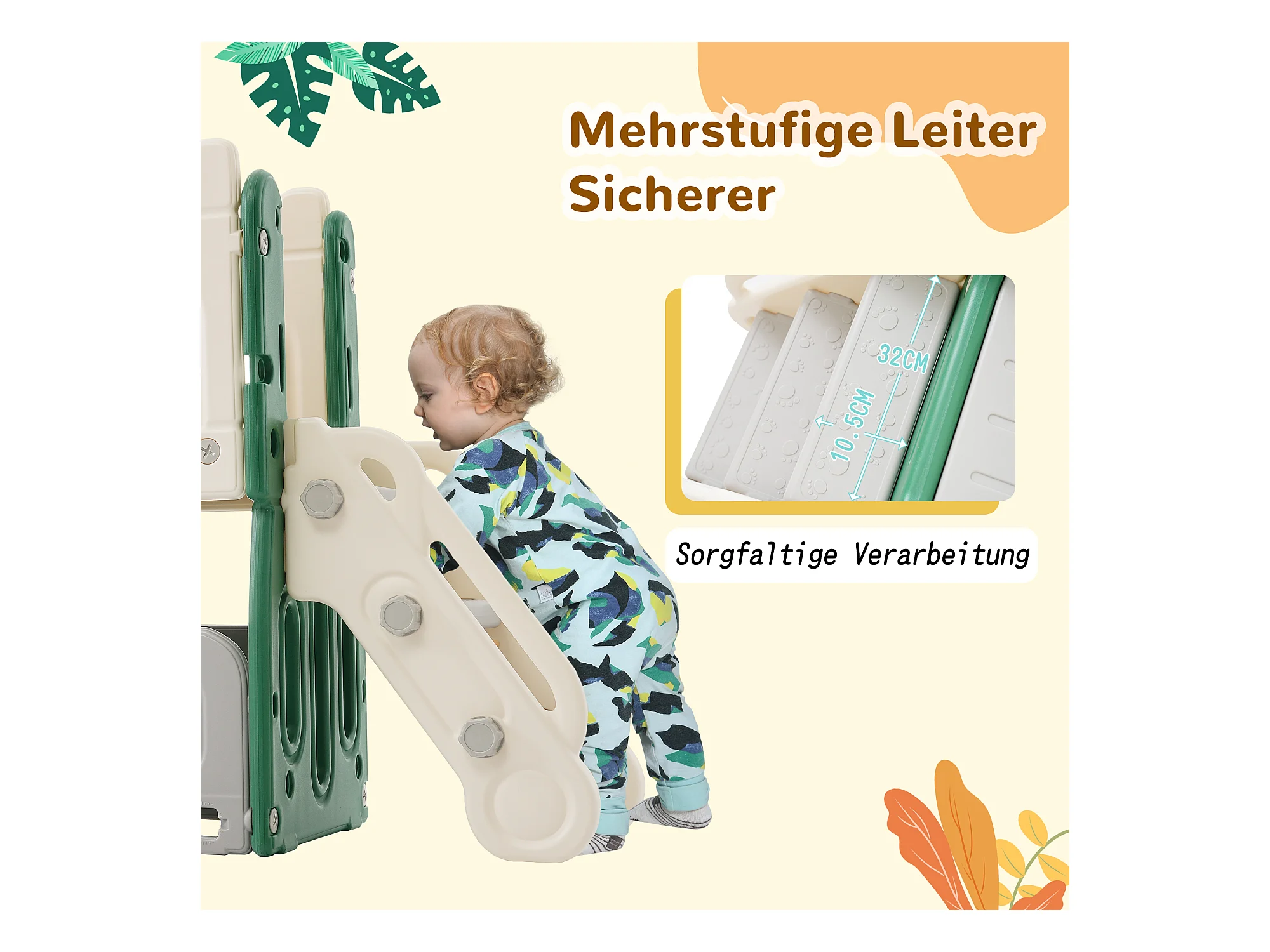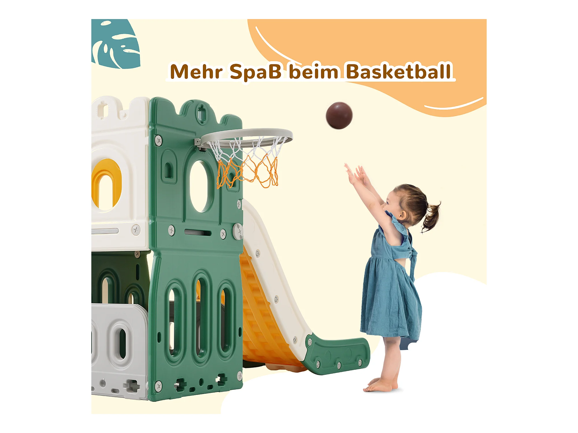 5-in-1 kinderglijbaan voor buiten of binnen met ladder, basketbalring, opberger, boorspel, speelpad, groen