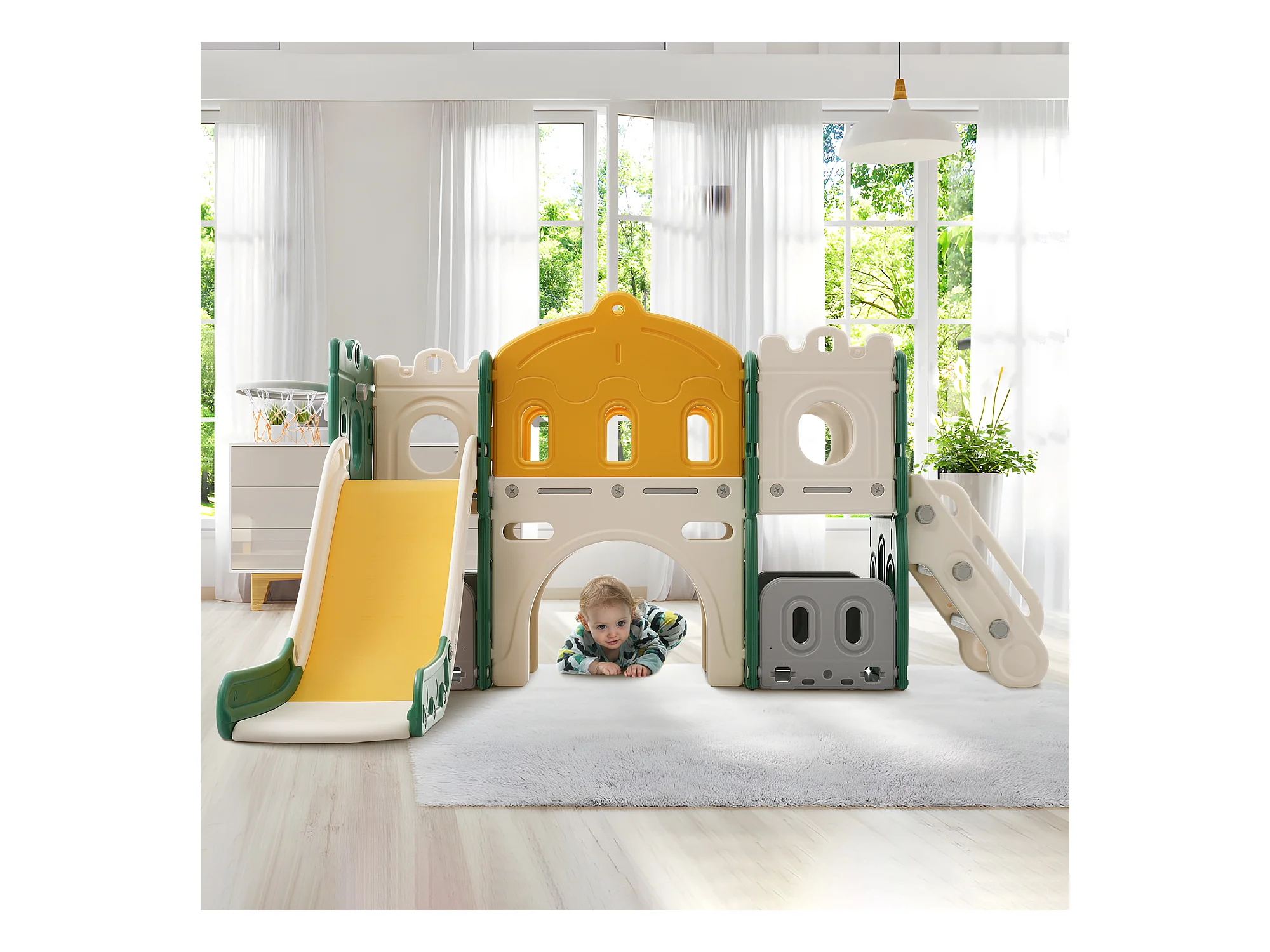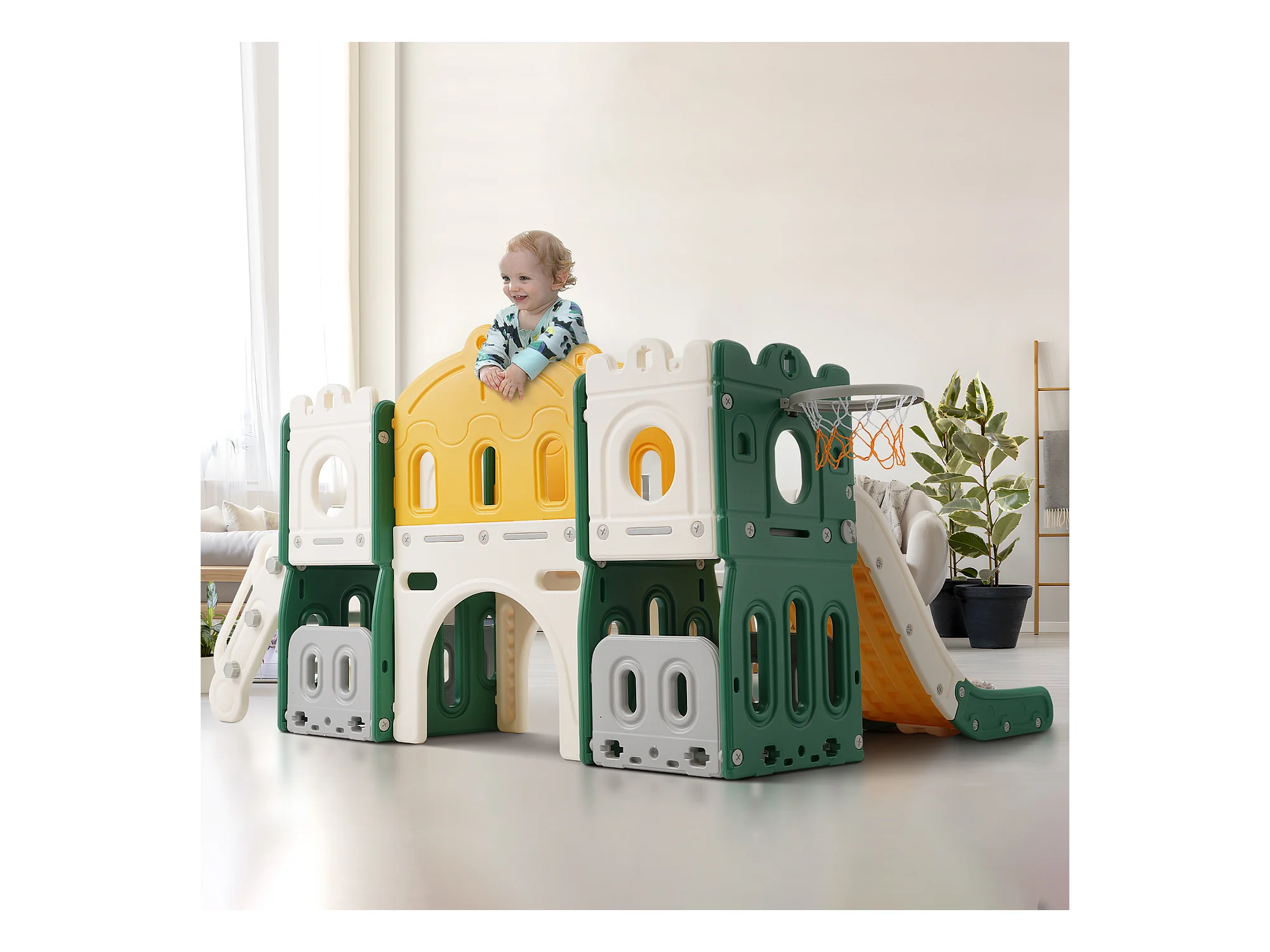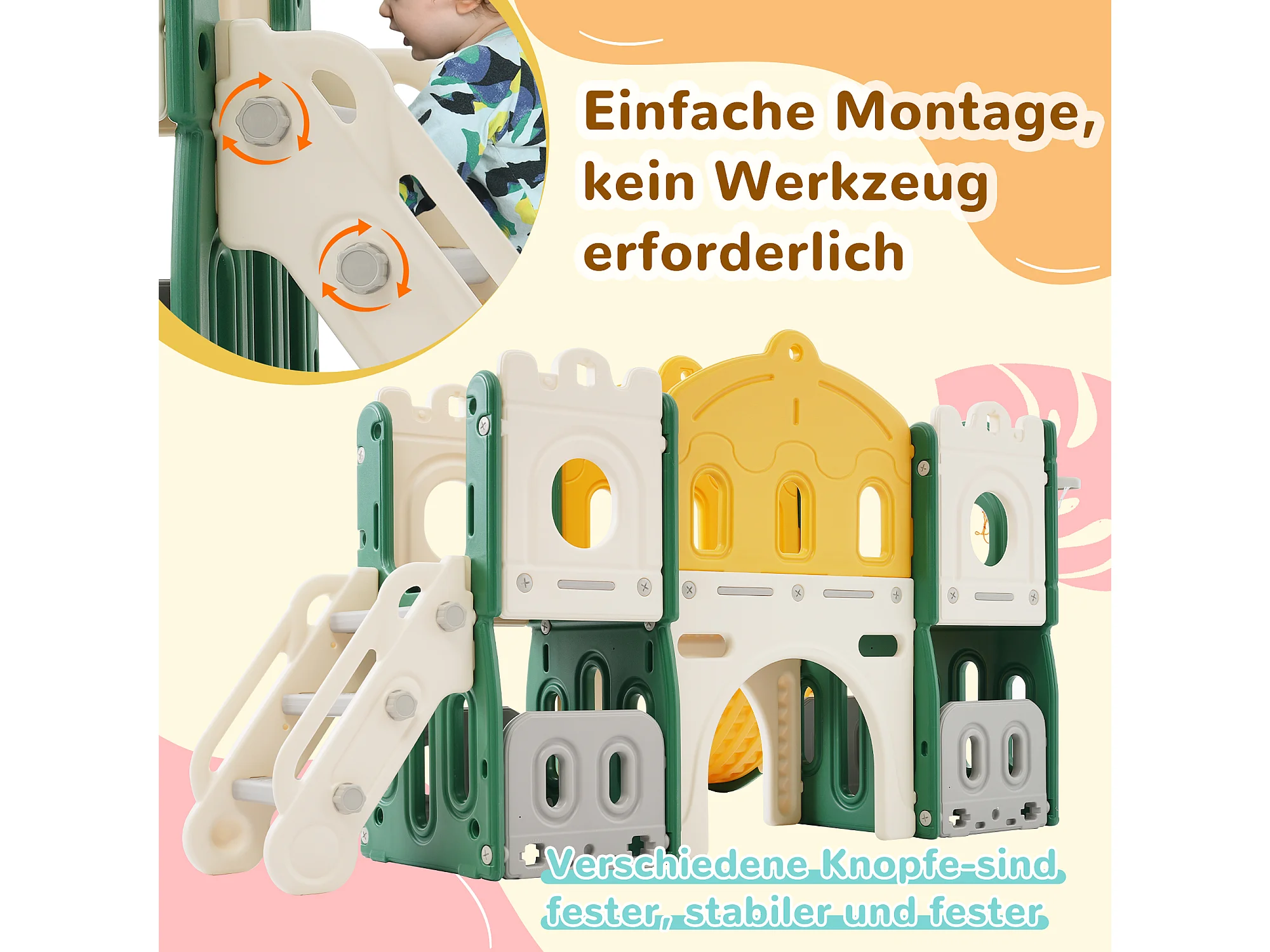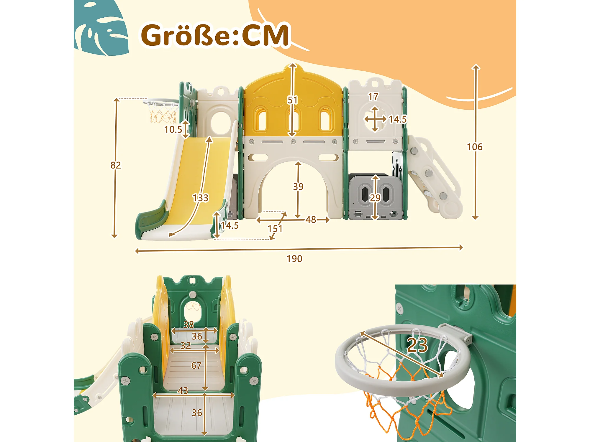5-in-1 kinderglijbaan voor buiten of binnen met ladder, basketbalring, opberger, boorspel, speelpad, groen