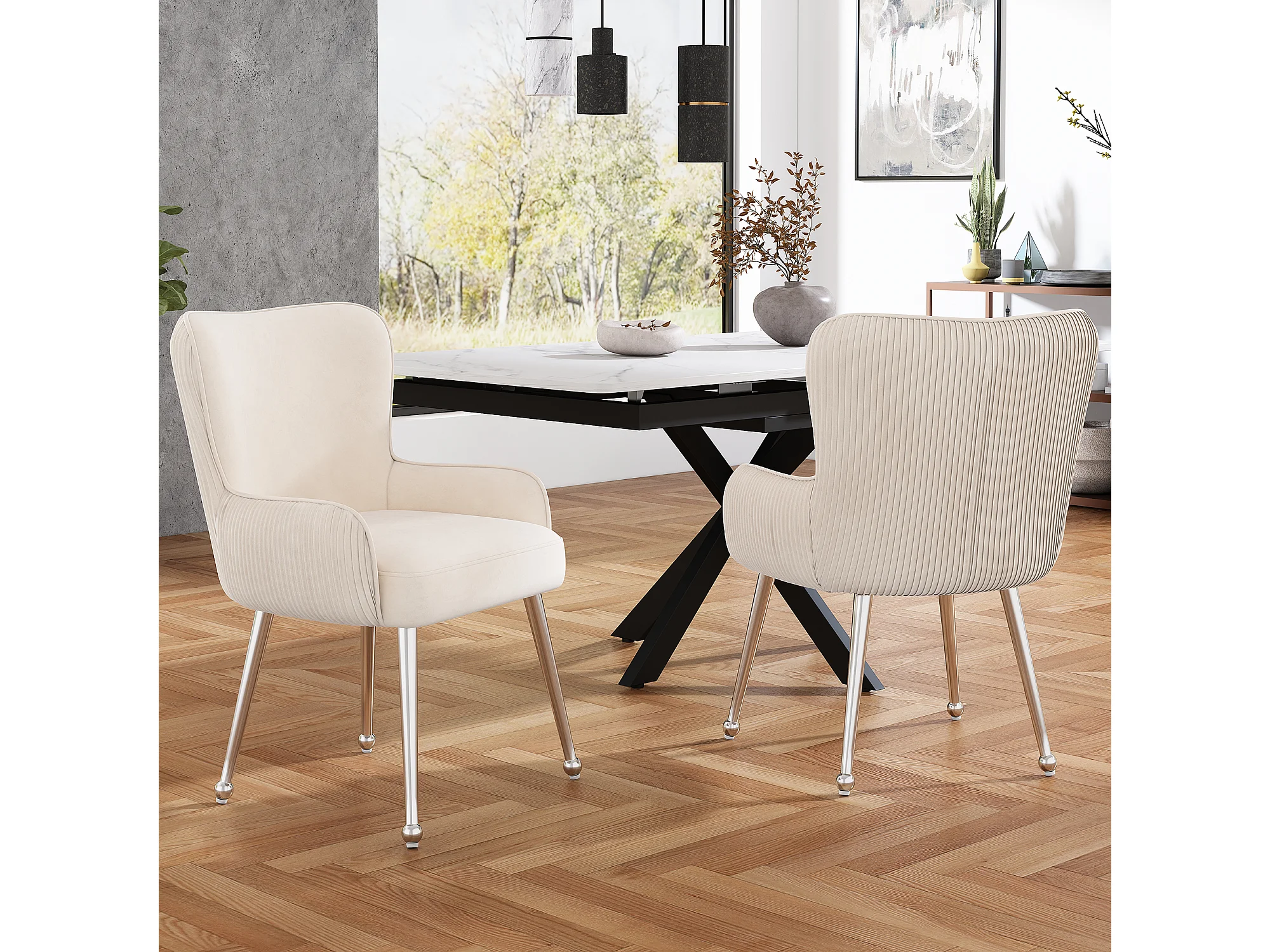 Beige fluwelen eetkamerstoel set van 6 met armleuningen, zilveren metalen poten, lendensteun (69x58,5x56 cm)