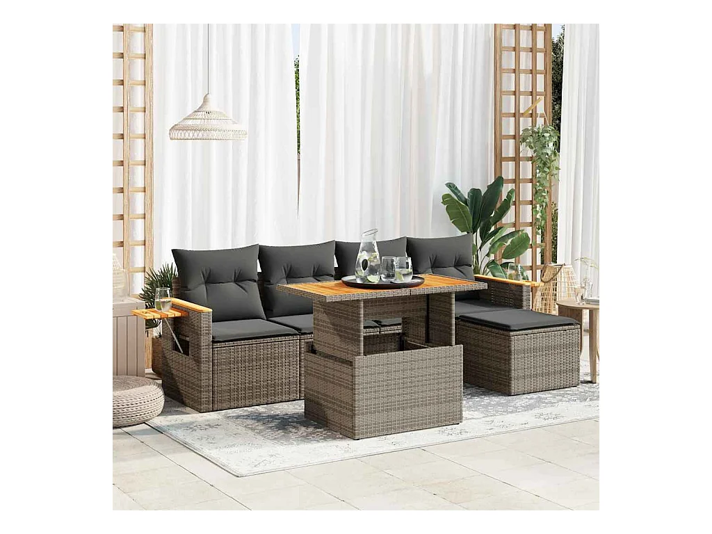 6-delige Loungeset met kussens poly rattan acacia grijs