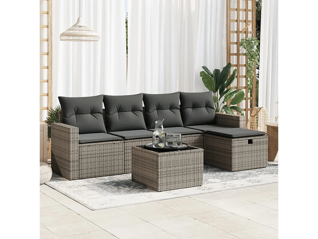 6-delige tuinmeubelset met grijze kussens in geweven hars
