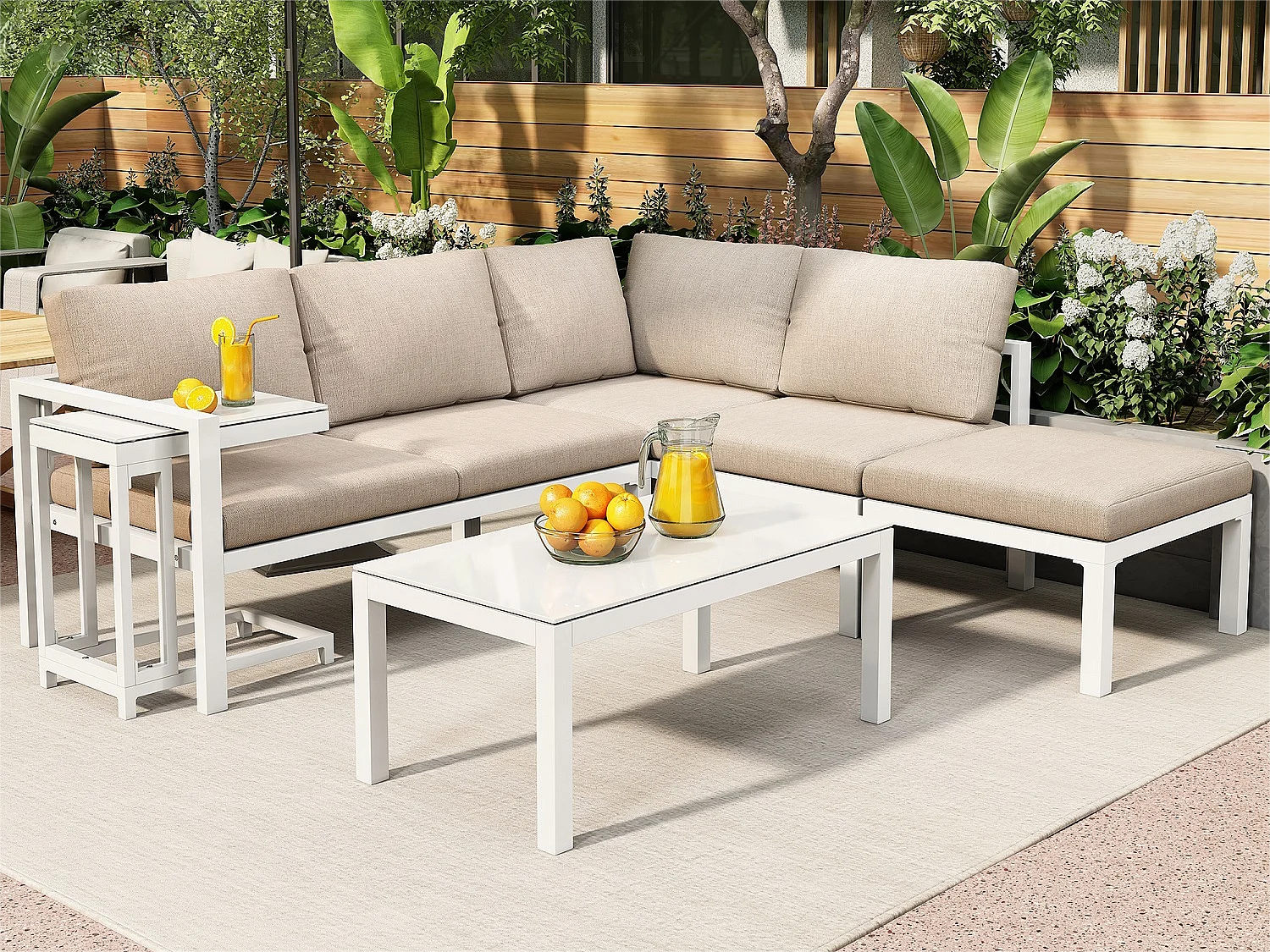 6-zits hoektuinmeubelset - 2 modulaire zitbanken + 1 poef + 2 salontafels - aluminium frame - wit