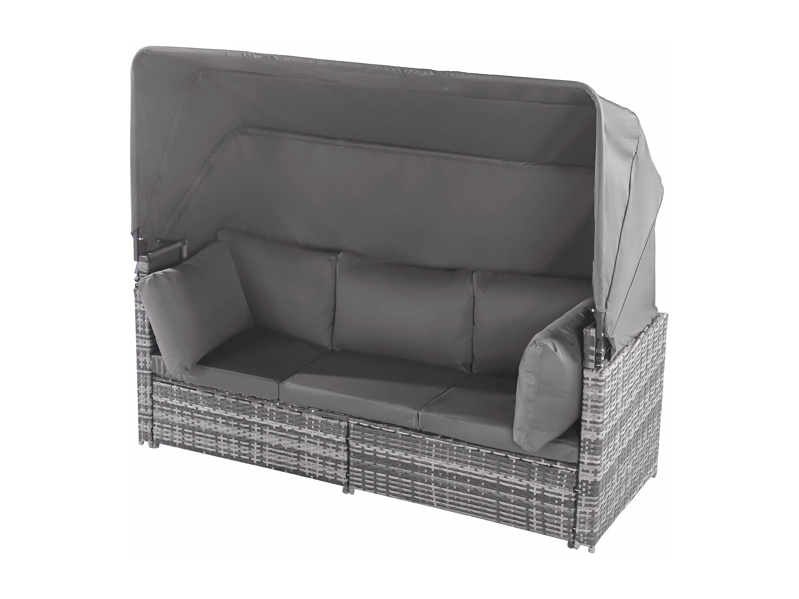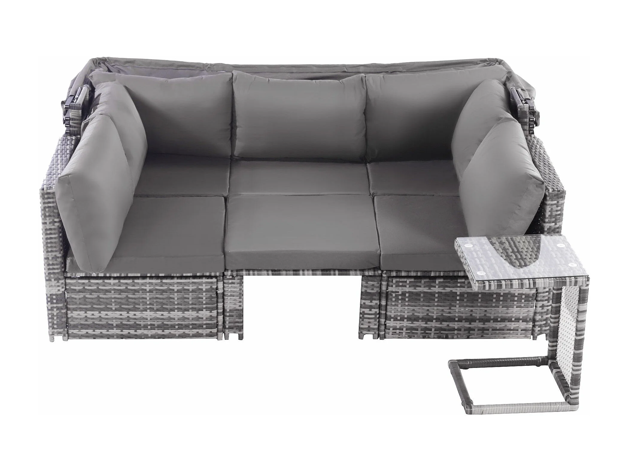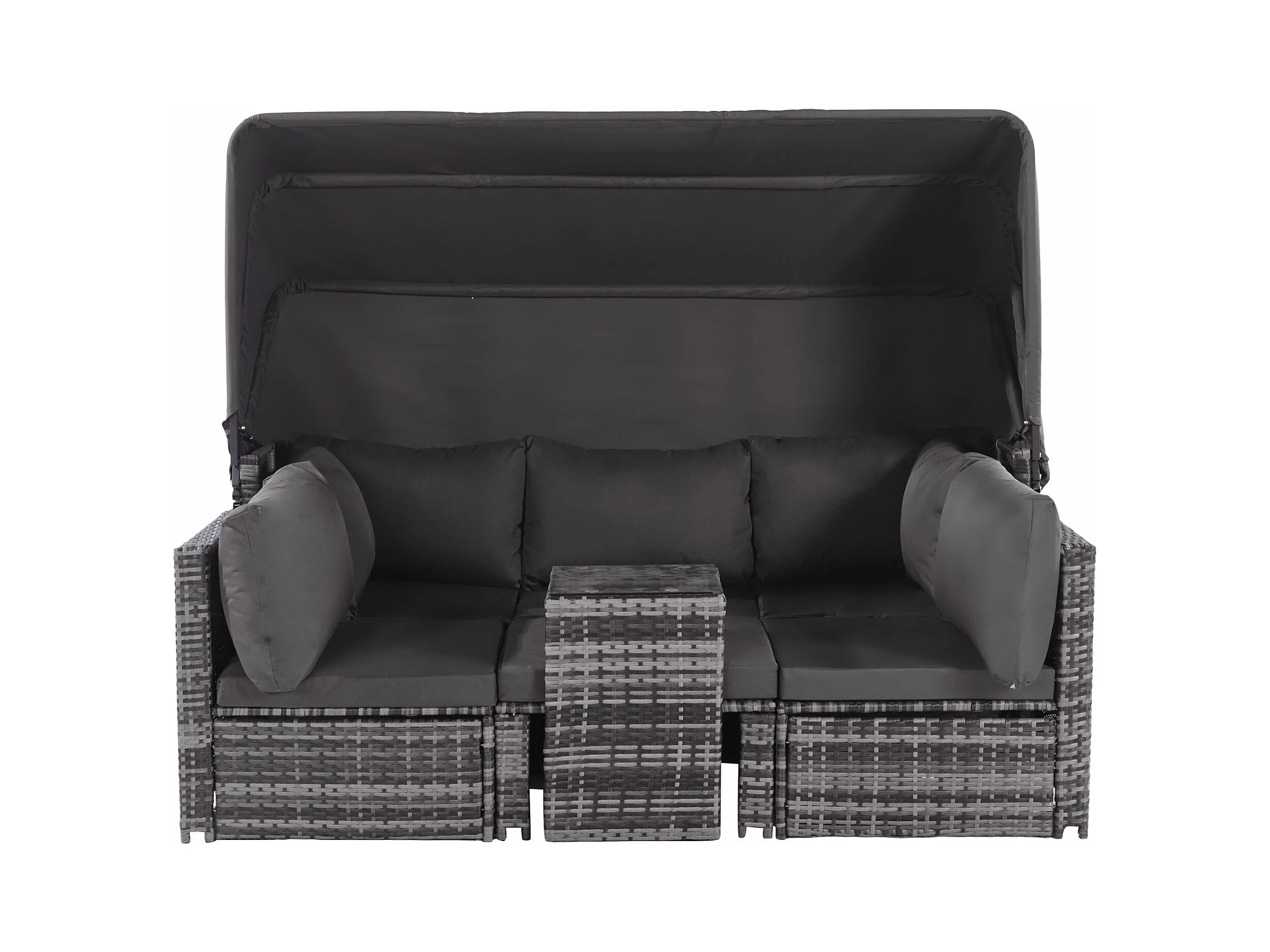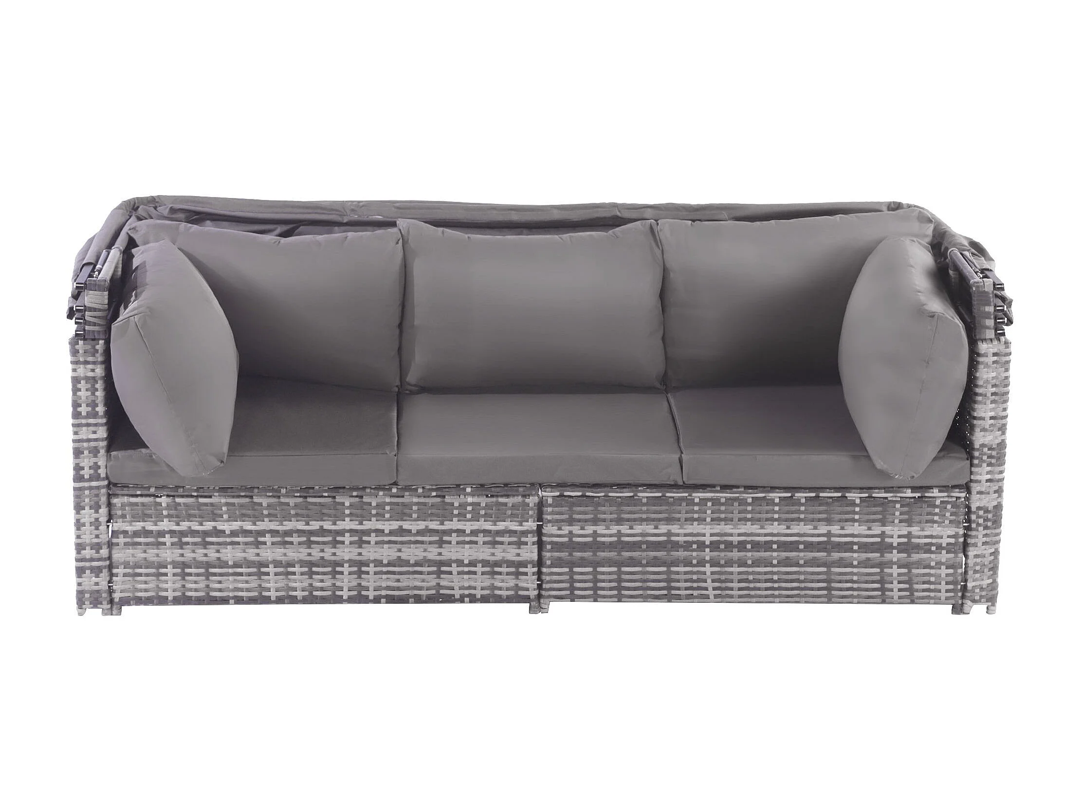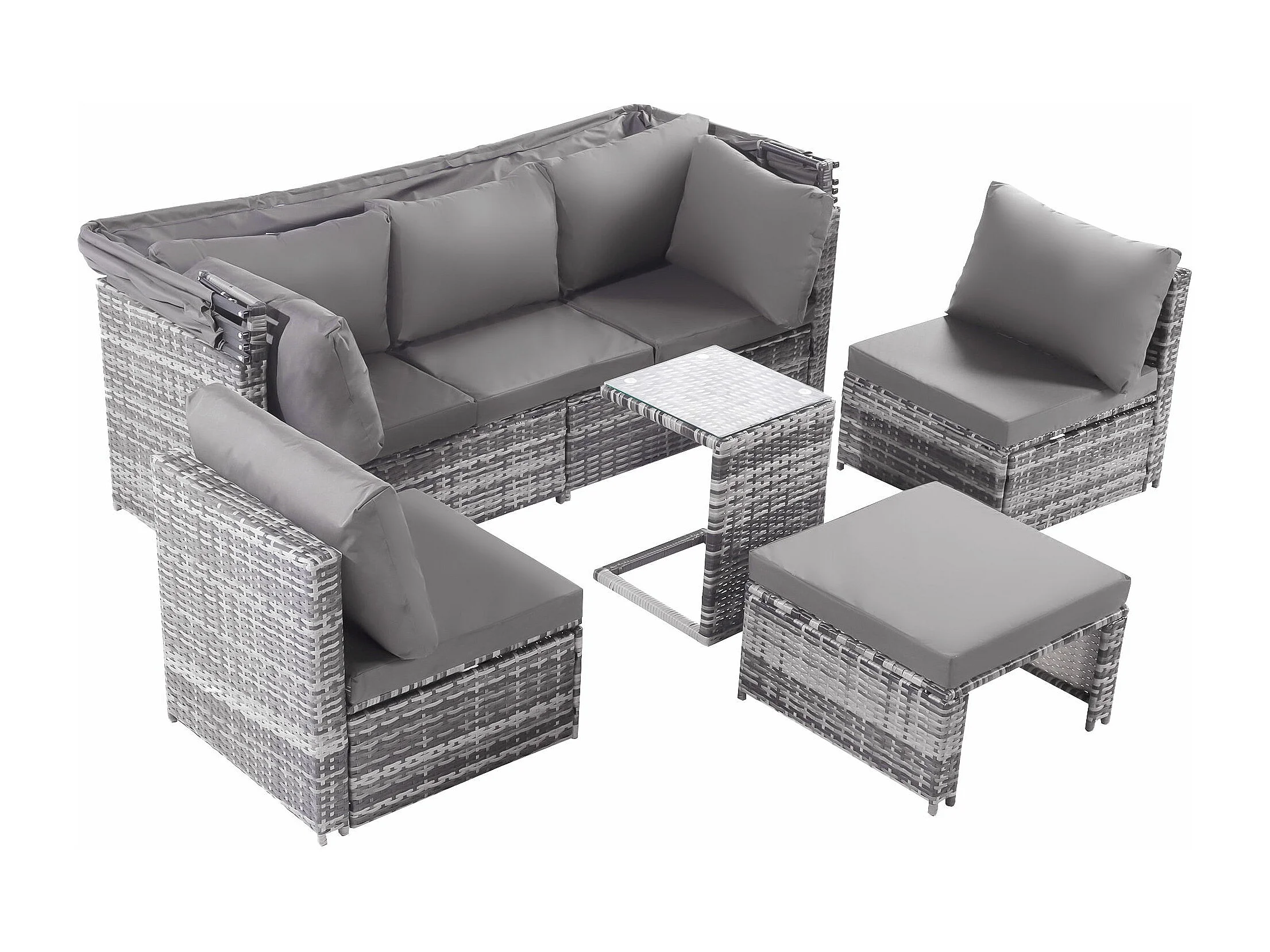Tuinmeubelset van kunstharsriet: 3-zitsbank met opklapbaar dak + 2 fauteuils + 1 poef + salontafel - Inclusief 13 zit- en rugkussens - Grijs