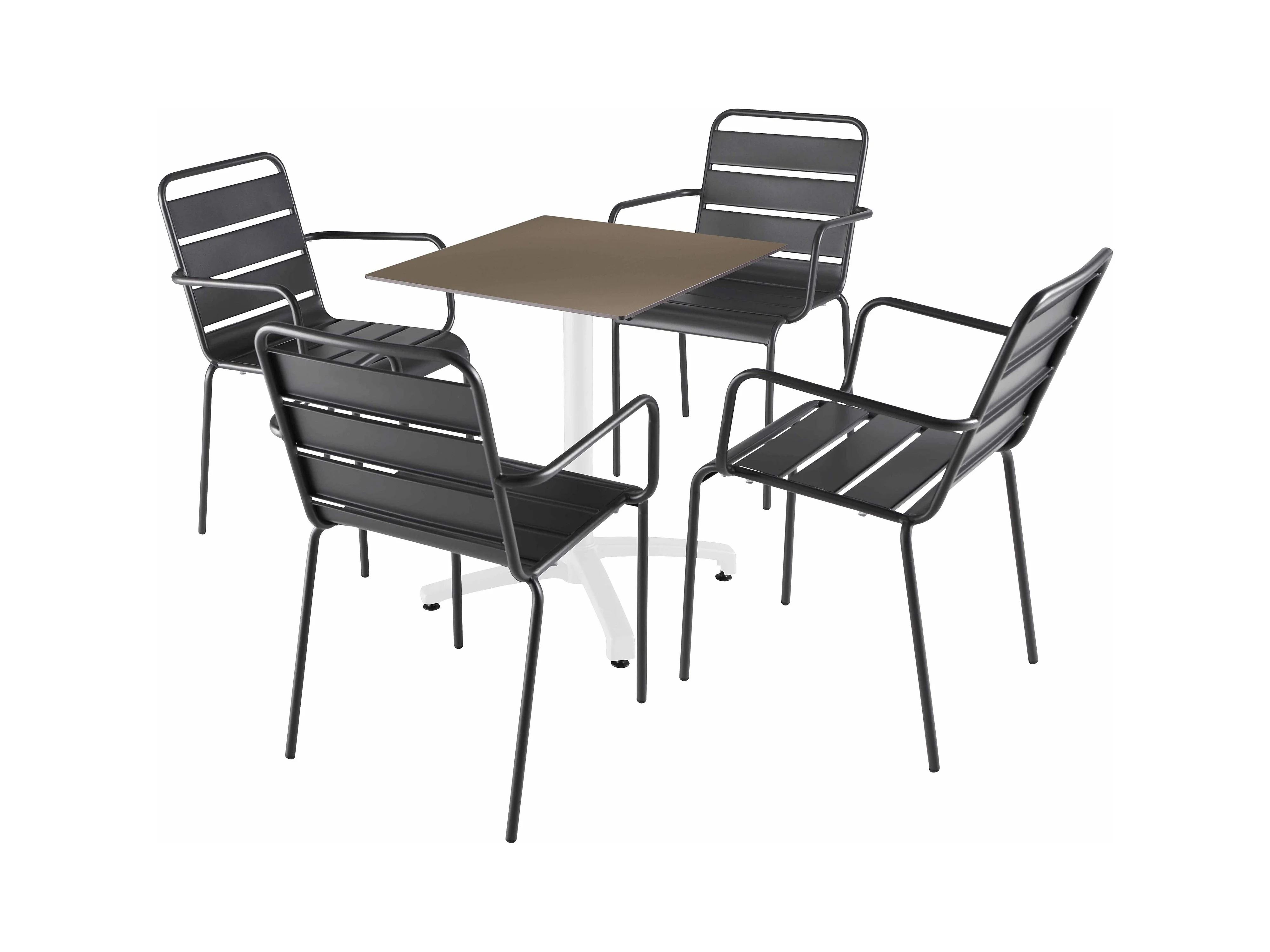 Liggende tafel van leisteenlaminaat, 60x60 cm, en 4 grijze stoelen