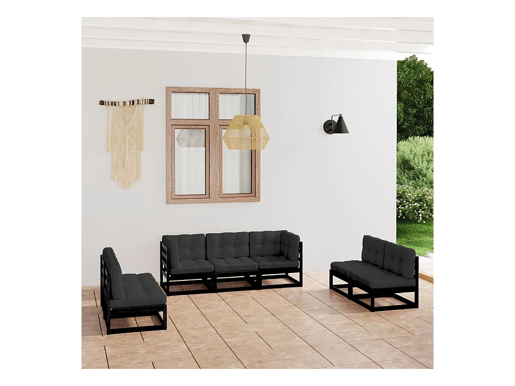 7-delige Loungeset met kussens massief grenenhout zwart