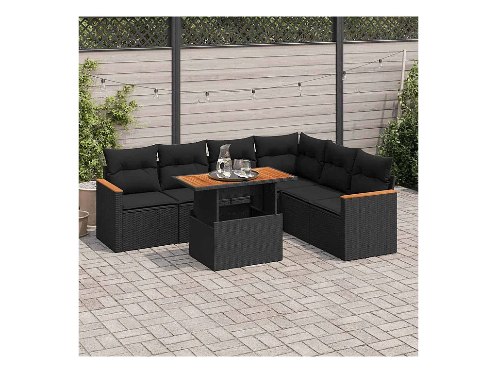 7-delige Loungeset met kussens poly rattan acacia zwart