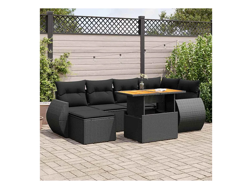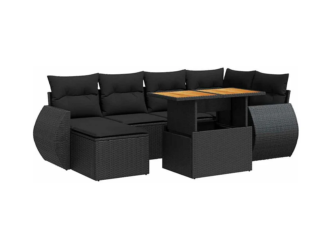 7-delige Loungeset met kussens poly rattan acacia zwart