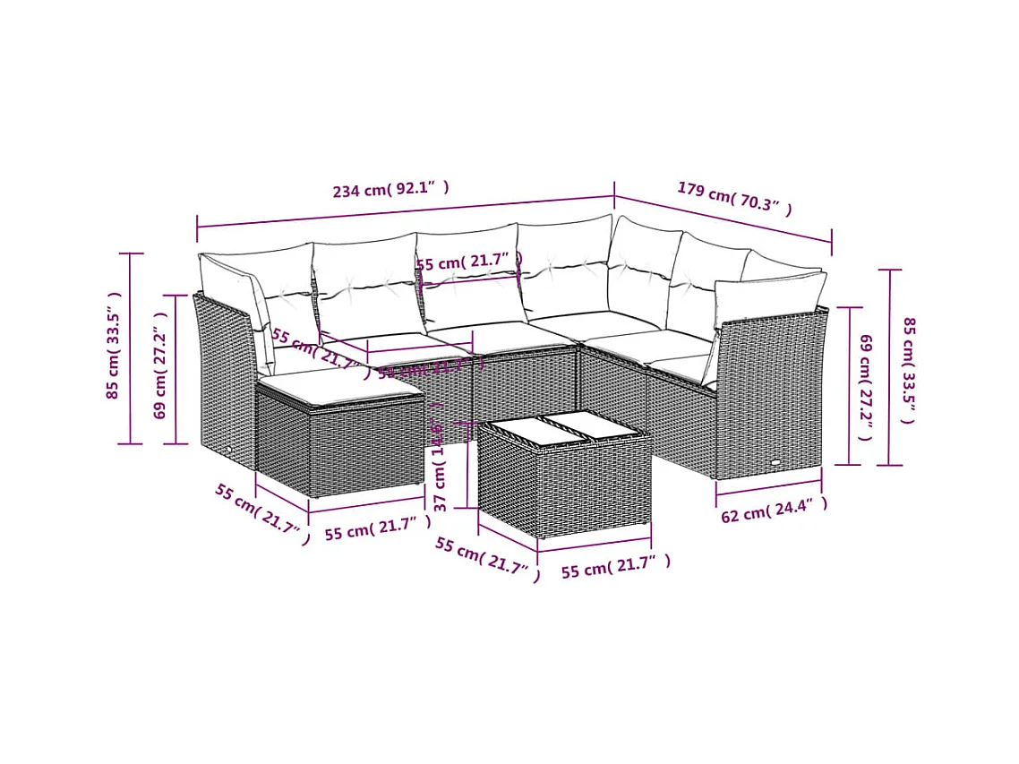 7-delige Loungeset met kussens poly rattan bruin
