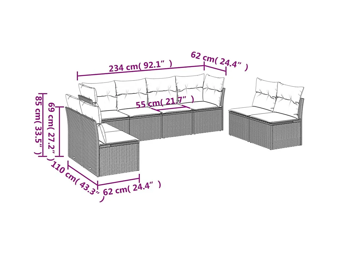 9-delige Loungeset met kussens poly rattan grijs