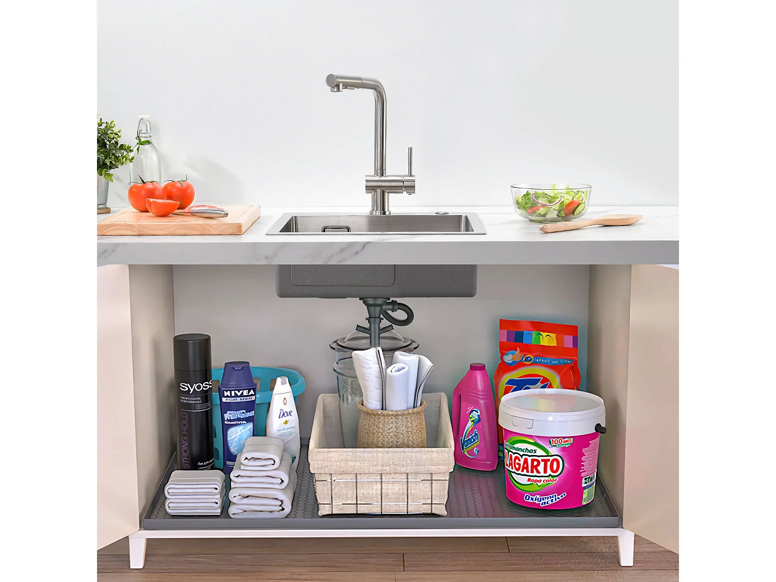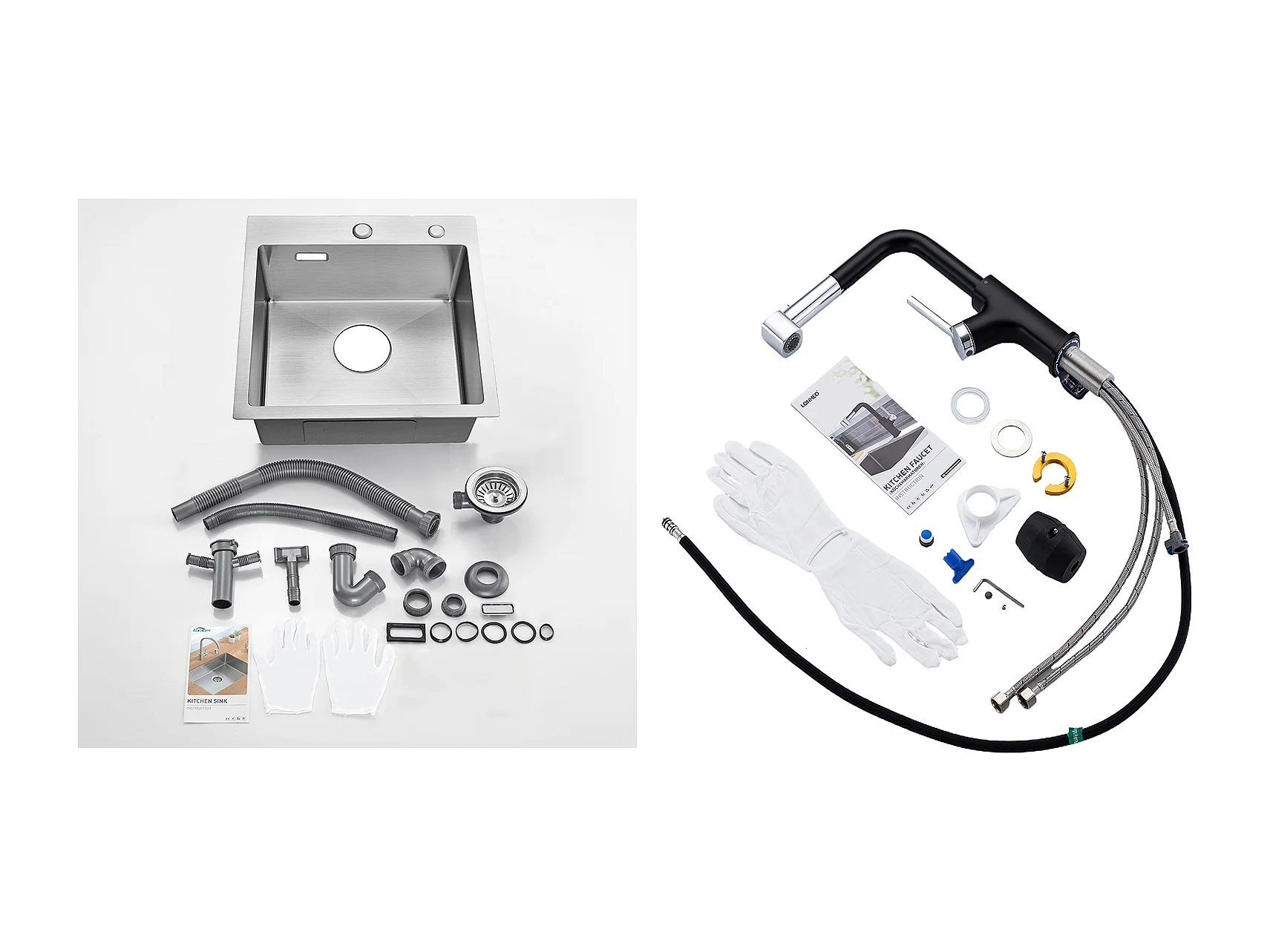 Aanrecht 1 bak 45x45CM RVS 304, inbouw en op te zetten + flexibele keukenkraan hoge uitloop vrij te sturen, warm/koud water, wit
