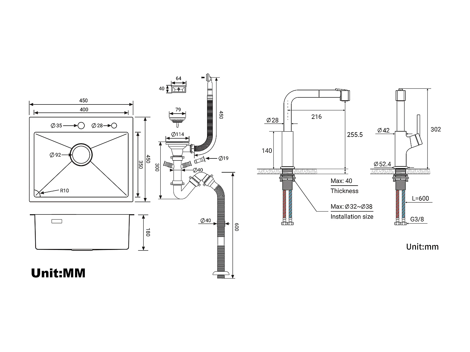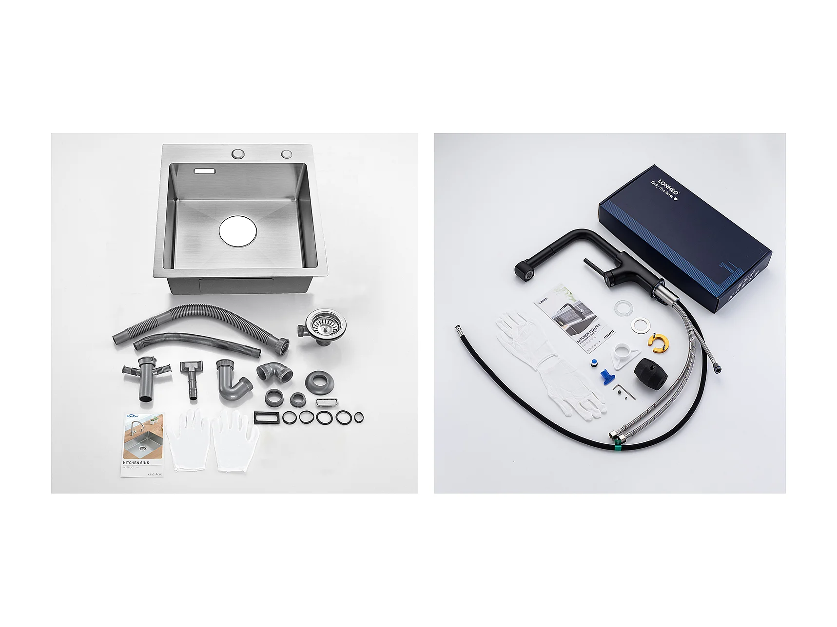 Aanrecht 1 Bak 45x45CM Roestvrij Staal 304, Inbouw en Opzetbaar + Zwarte Keukenkraan met Uittrekbare Handdouche