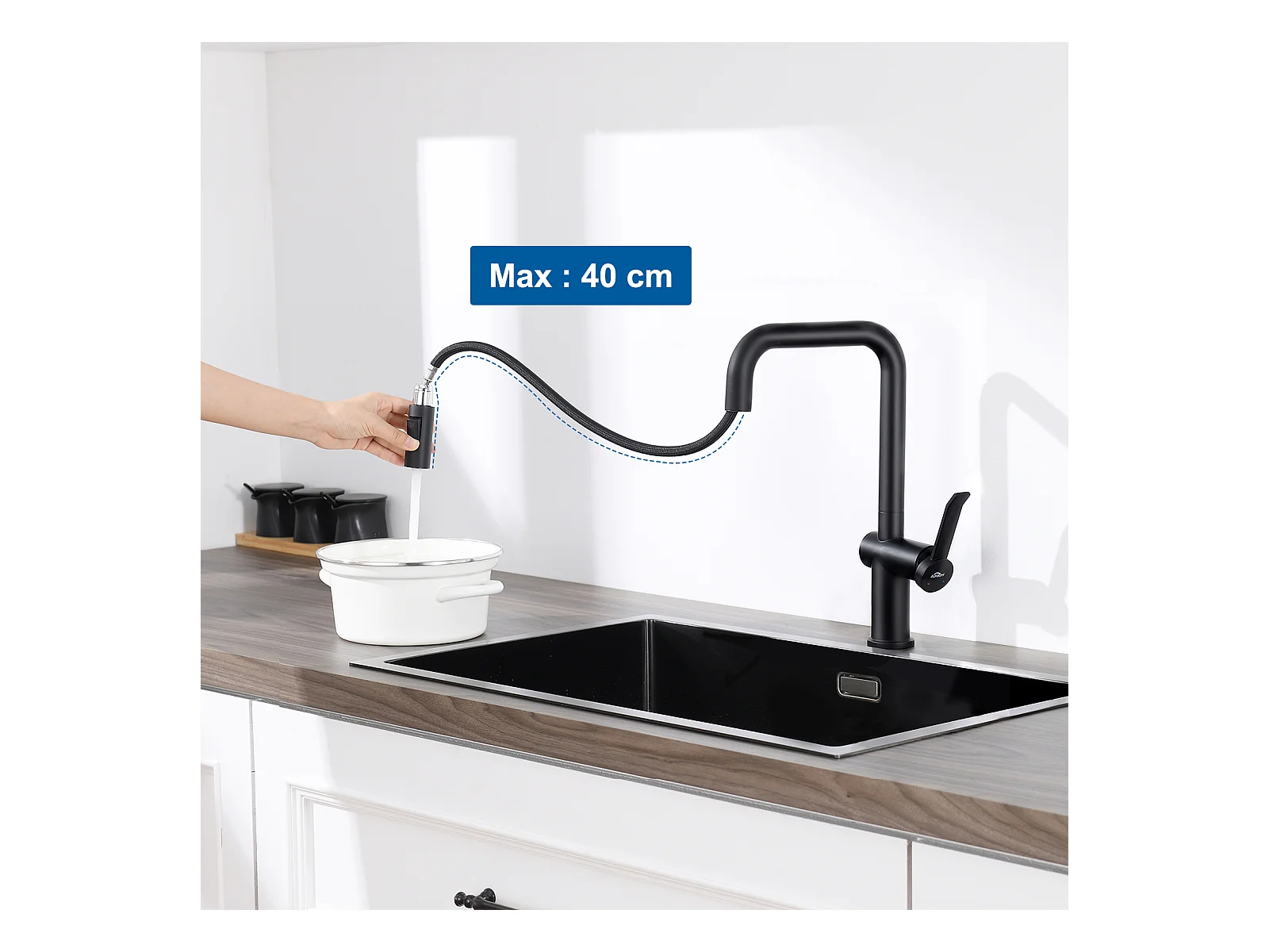 Zwarte keuken gootsteen 1 bak 45x45CM 304 roestvrij staal, inbouw en op te zetten + uittrekbare roestvrijstalen keukenkraan 360 ° roterend
