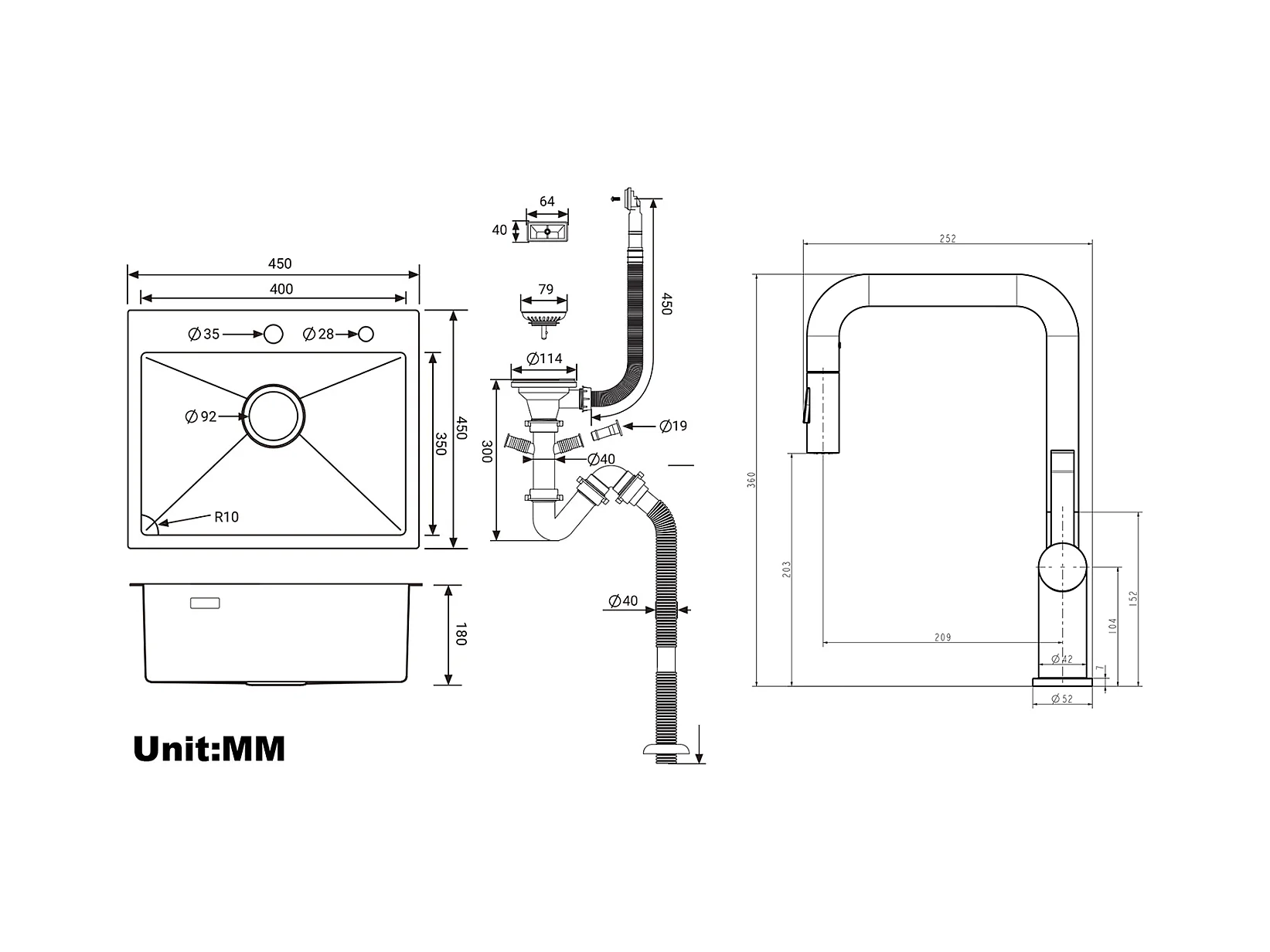Aanrecht 1 Bak 45x45CM RVS 304 + Keukenkraan met Uittrekbare Handdouche 360 ° Roterend 2 Functies, Afneembare Romper, Zwart