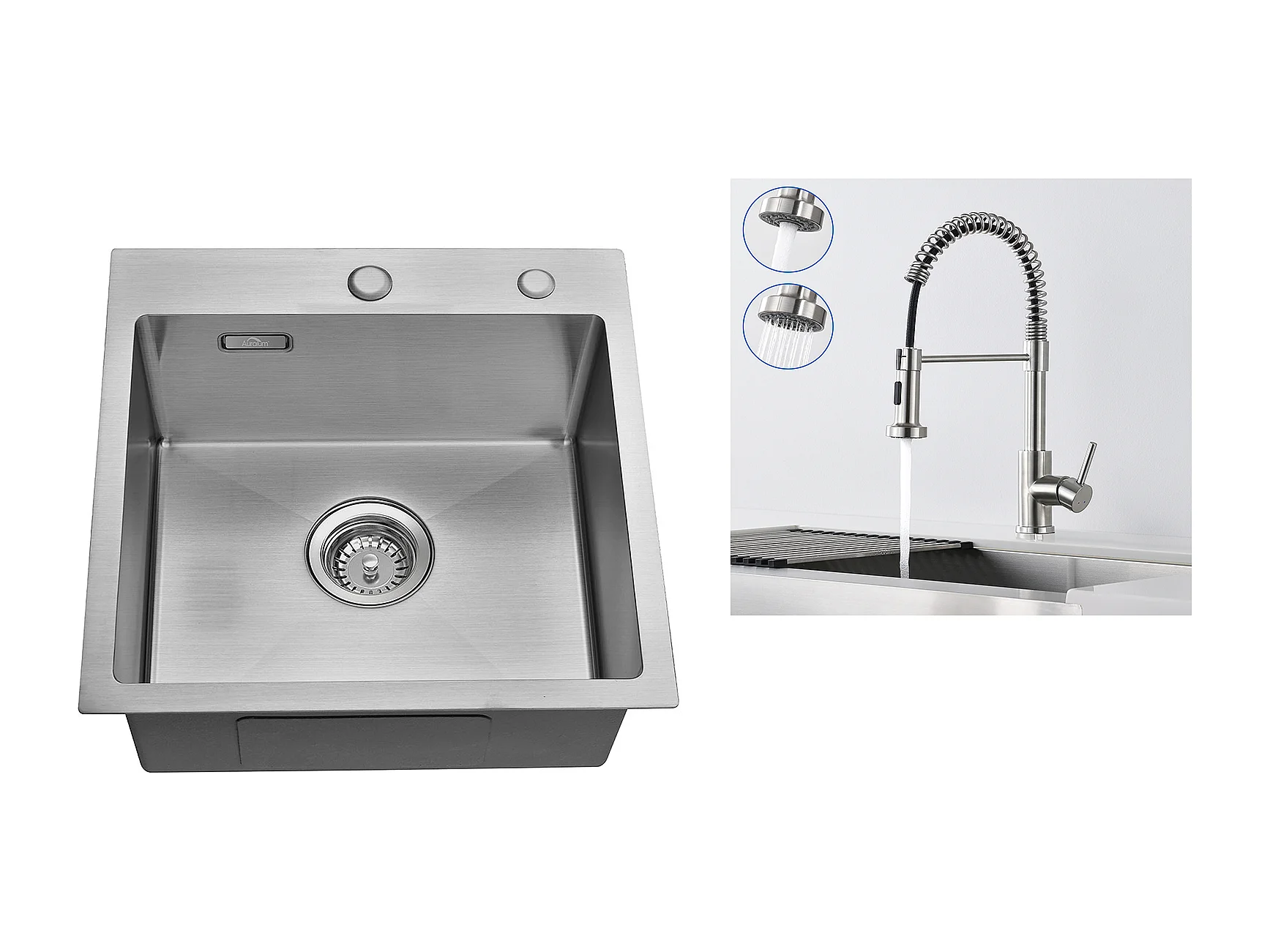Aanrecht 1 Bak 45x45CM RVS, Inbouw en Opbouw + Veer Keukenkraan met Uitschuifbare Handdouche, 2 Modi, 360° Draaibaar, Geborsteld