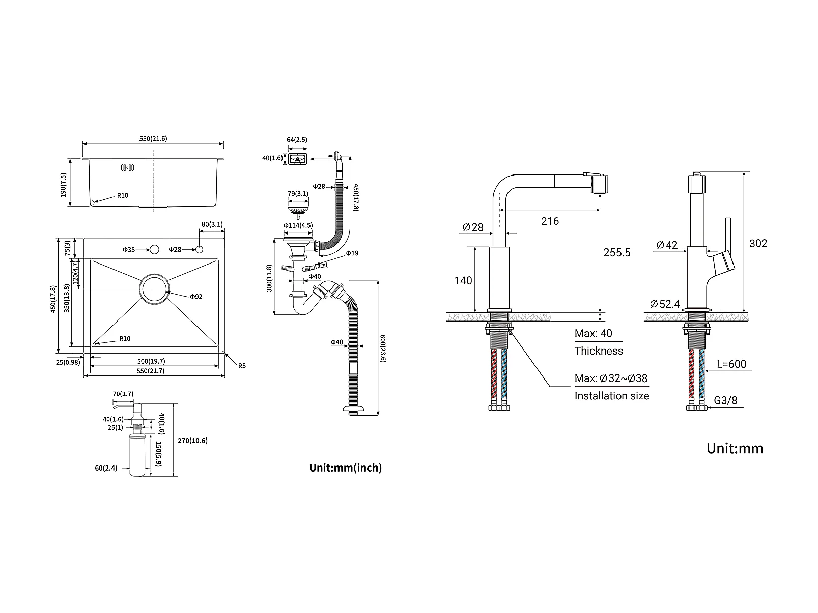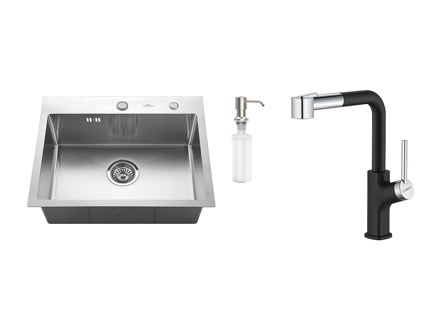 Aanrecht 1 Bak 55*45CM Inbouw- en Opbouwspoelbak met Zeepdispenser + RobiKeukennet RVS Uittrekbaar 360 ° Draaibaar