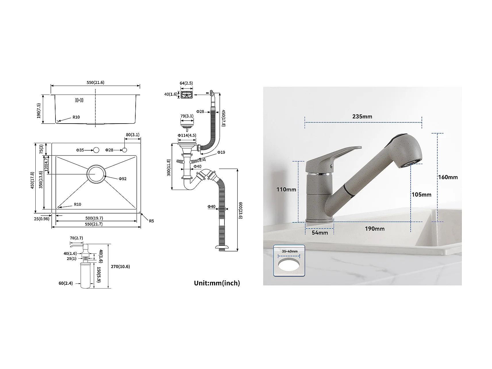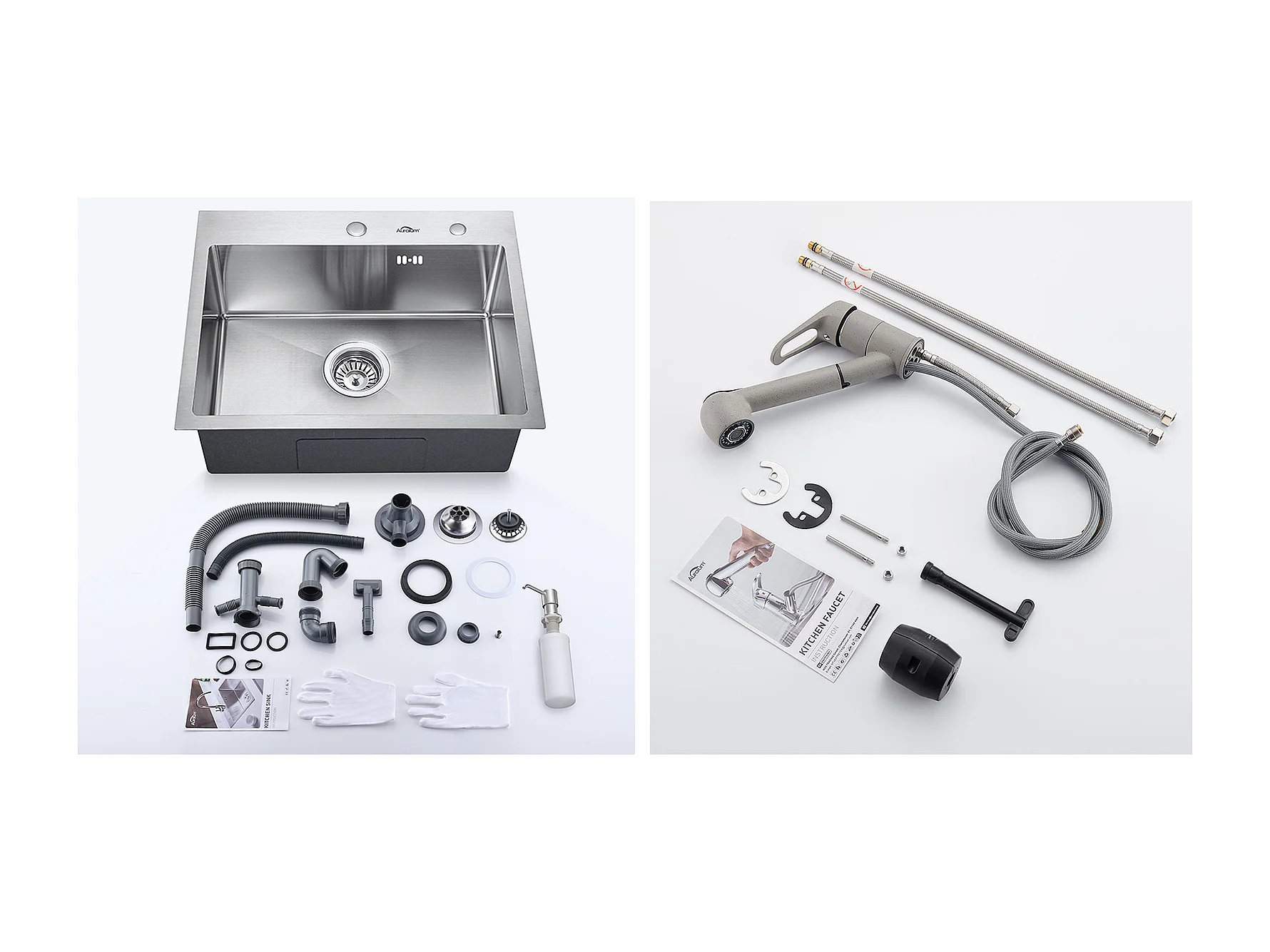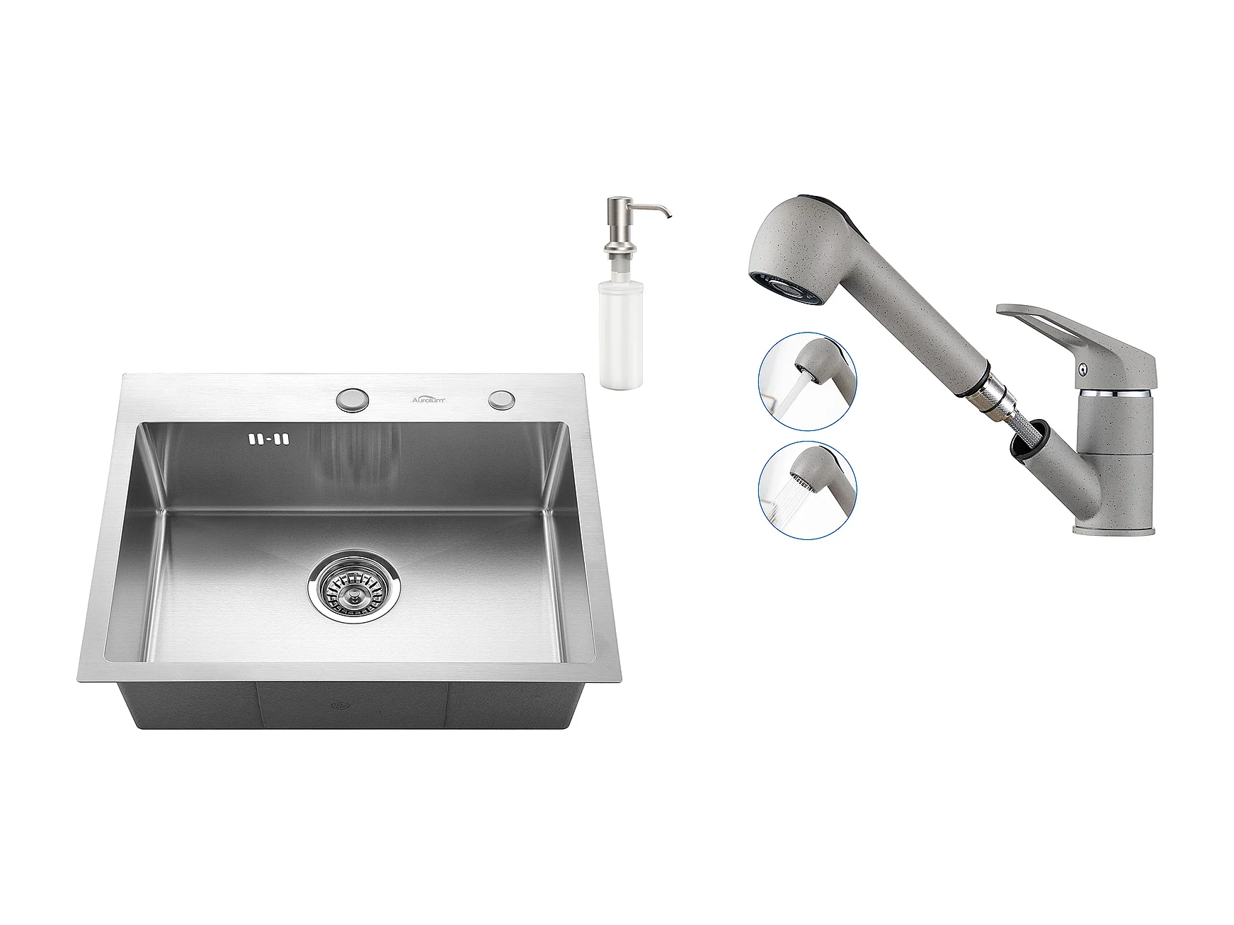 Aanrecht 1 Bak 55*45CM, Inbouw/Opbouw met Zeepdispenser+Kokenkraan met Uittrekbare Handdouche 2 Jets, Koud/Warm Water, Grijs