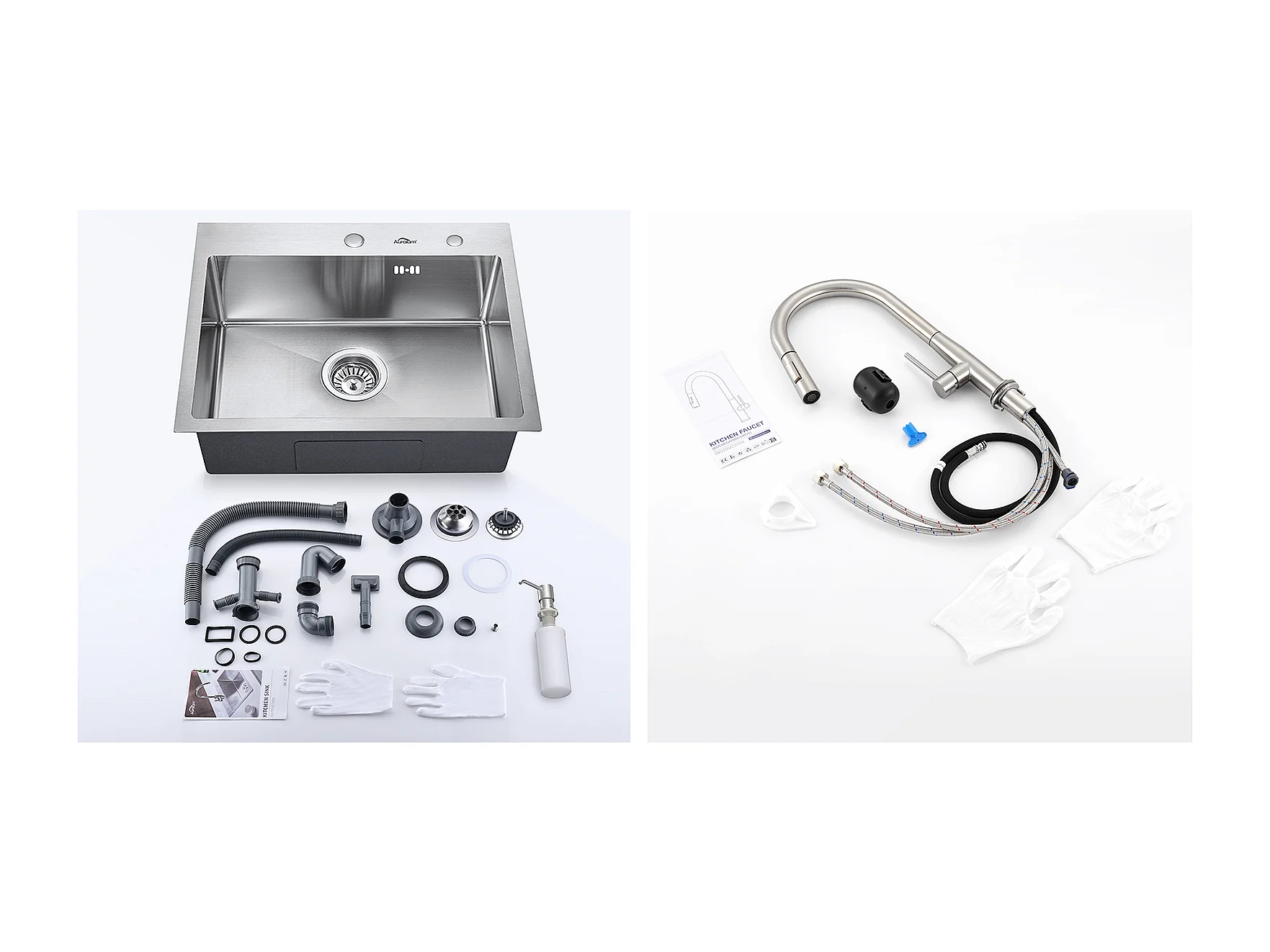 Aanrecht 1 Bak55*45CM, Inbouw en Opzetbaar met Zeepdispenser+Mengkraan Keuken met Uittrekbare Handdouche Chroom 360° Draaibaar,Chroom
